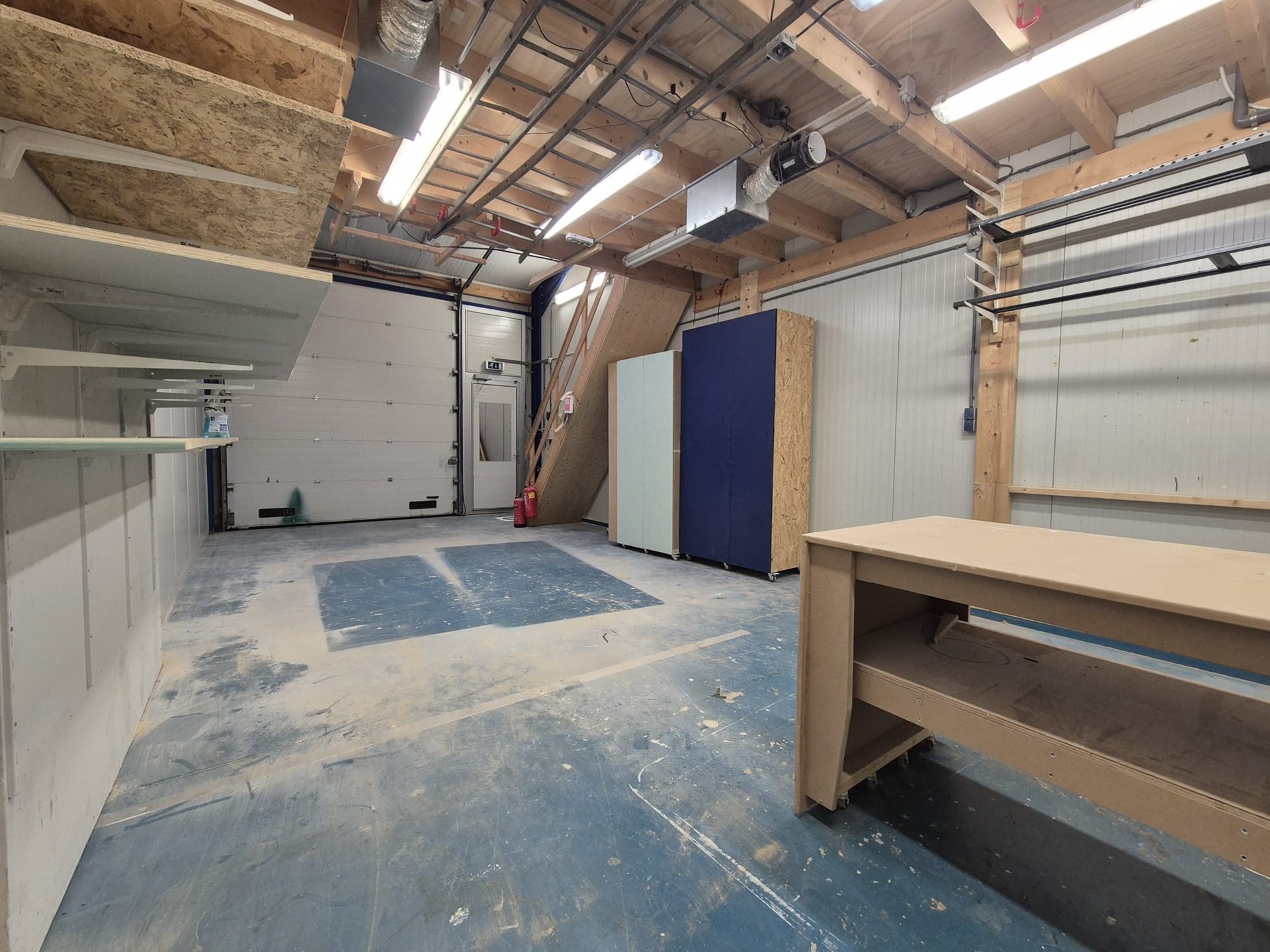 De begane grond bestaat uit een nette, geïsoleerde bedrijfsruimte met een hoogte van circa 4 meter aan de voorzijde, oplopend tot ongeveer 6,5 meter in de nok.