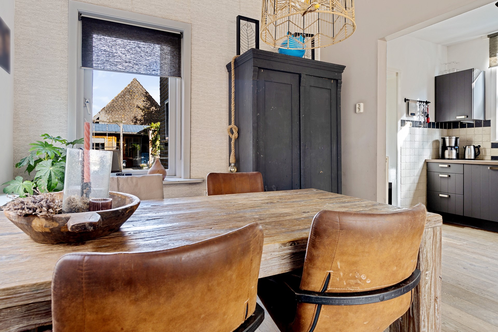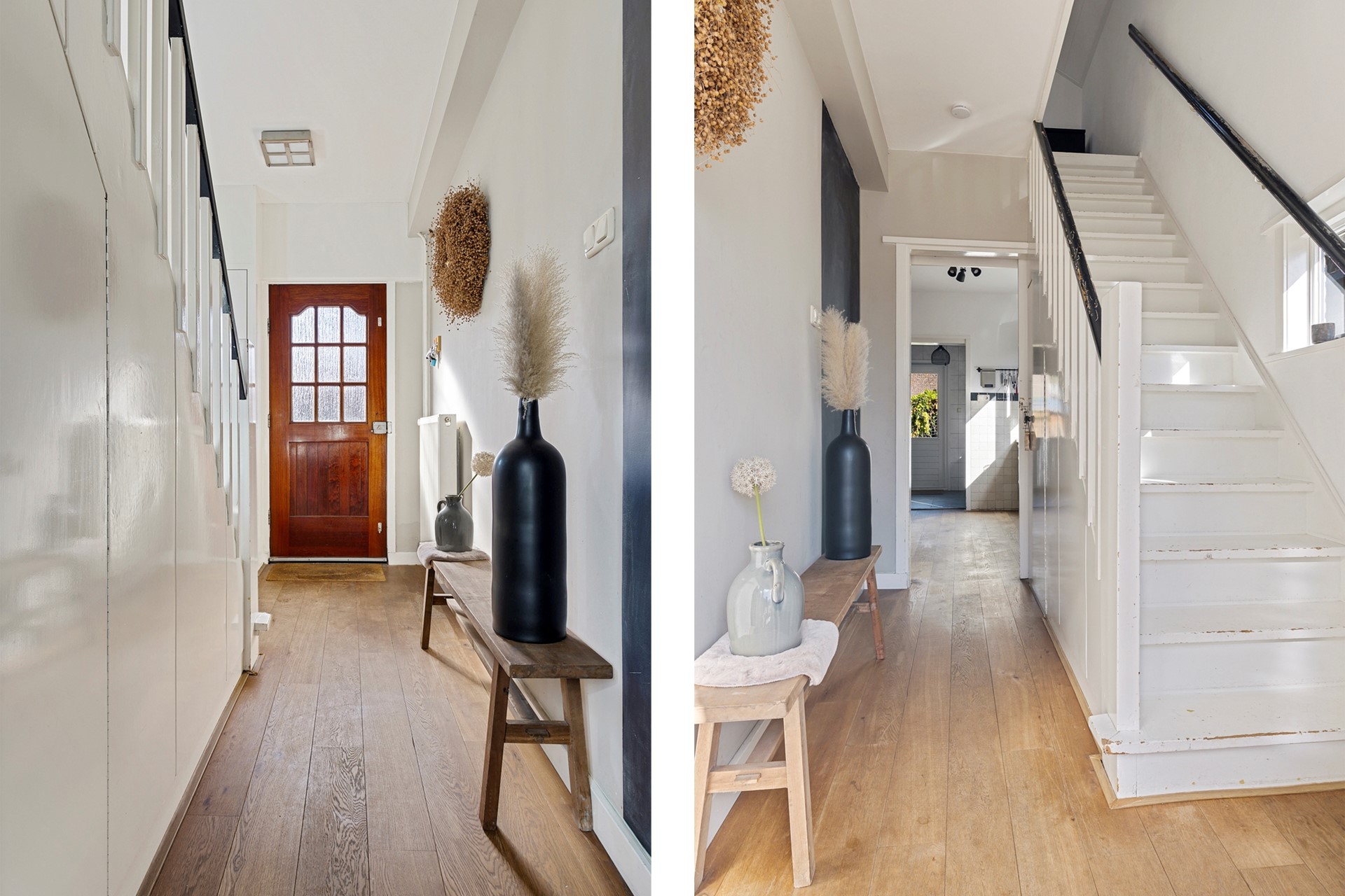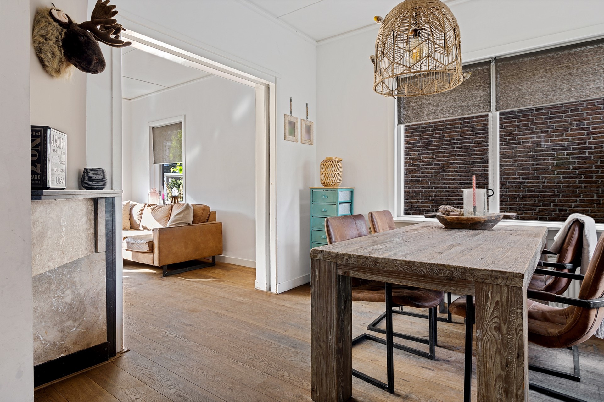 Via de voorkant stap je binnen in de hal met meterkast en trapopgang. Vanuit hier bereik je direct de keuken, die doorloopt richting de tuingerichte eetkamer. Deze warme ruimte heeft een originele schouw en kijkt prachtig uit over de achtertuin.