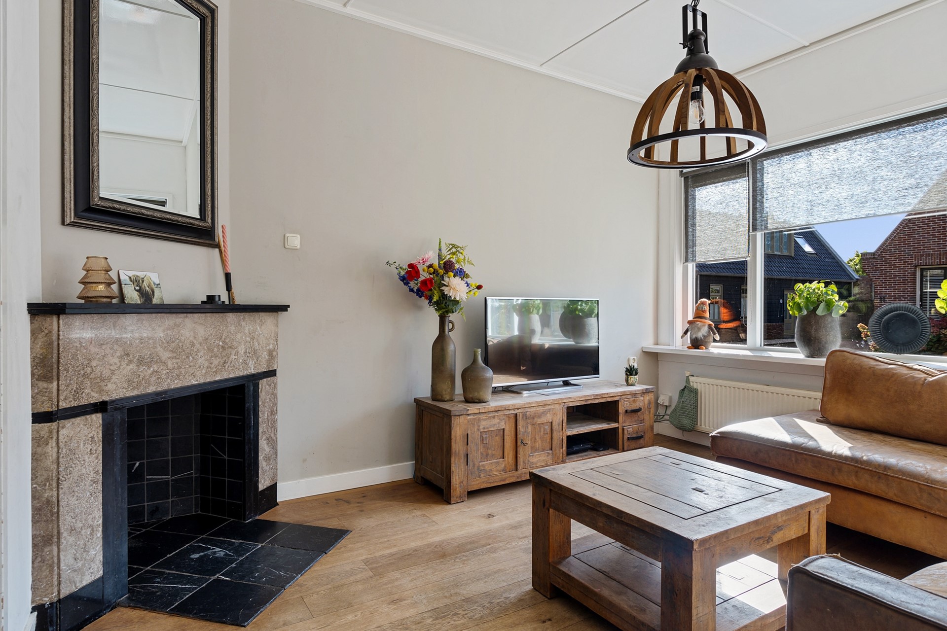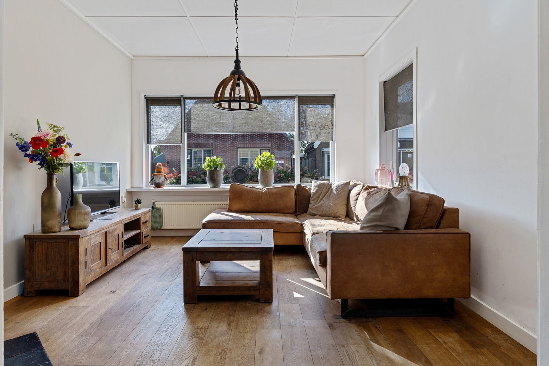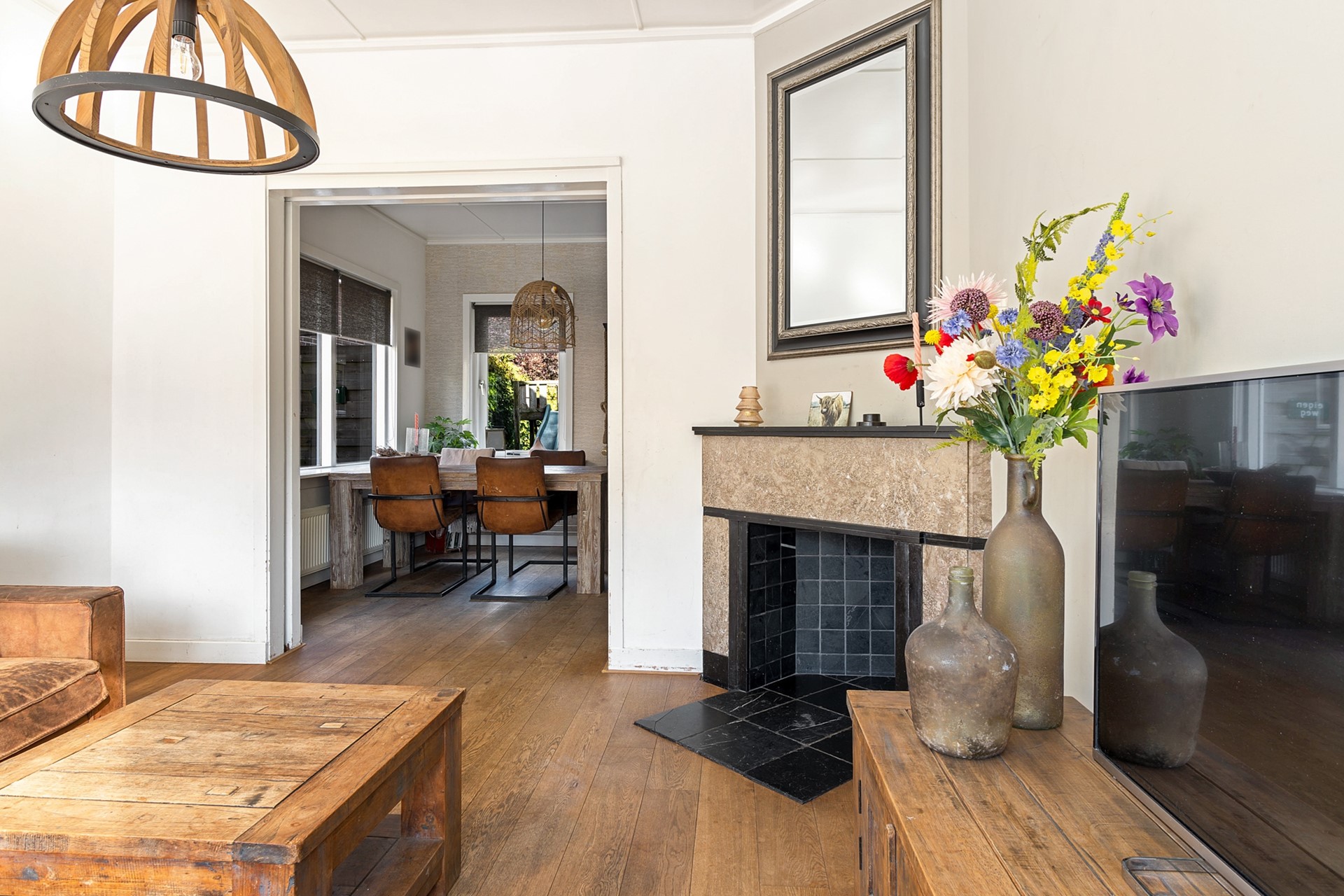 Aan de voorzijde bevindt zich de straatgerichte woonkamer, eveneens voorzien van een originele schouw. Tussen de woonkamer en de eetkamer hebben vroeger ensuite-deuren gezeten; de omlijsting is nog aanwezig, waarmee je eenvoudig de klassieke stijl kunt herstellen, als je dat wenst.
