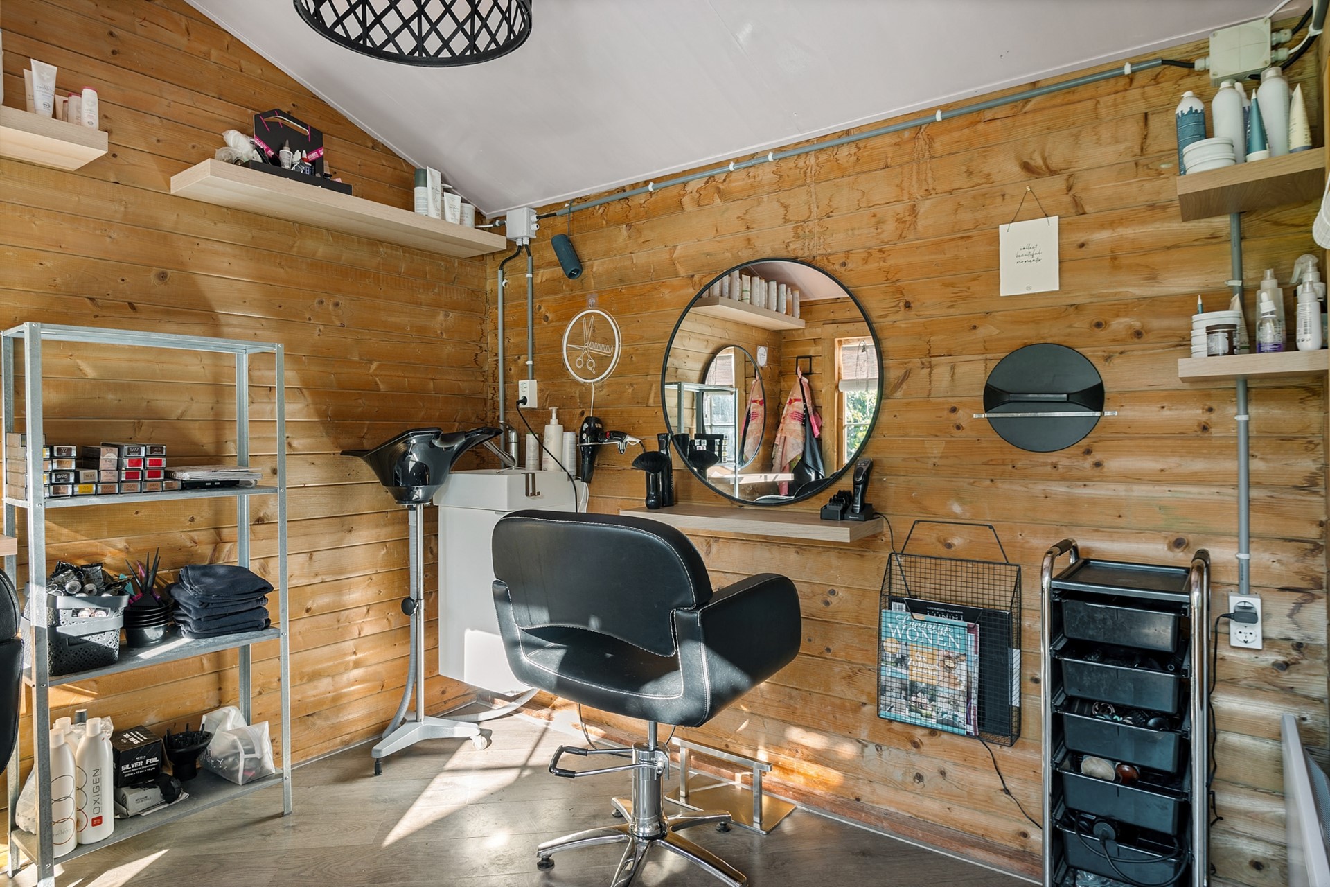 De praktijkruimte (deels geïsoleerd) beschikt over een boiler, water, elektra en een betonvloer, perfect voor een kapsalon, nagelstudio, thuiskantoor of andere hobby of beroep aan huis.