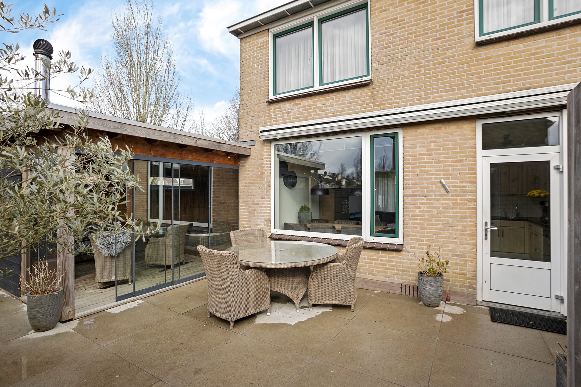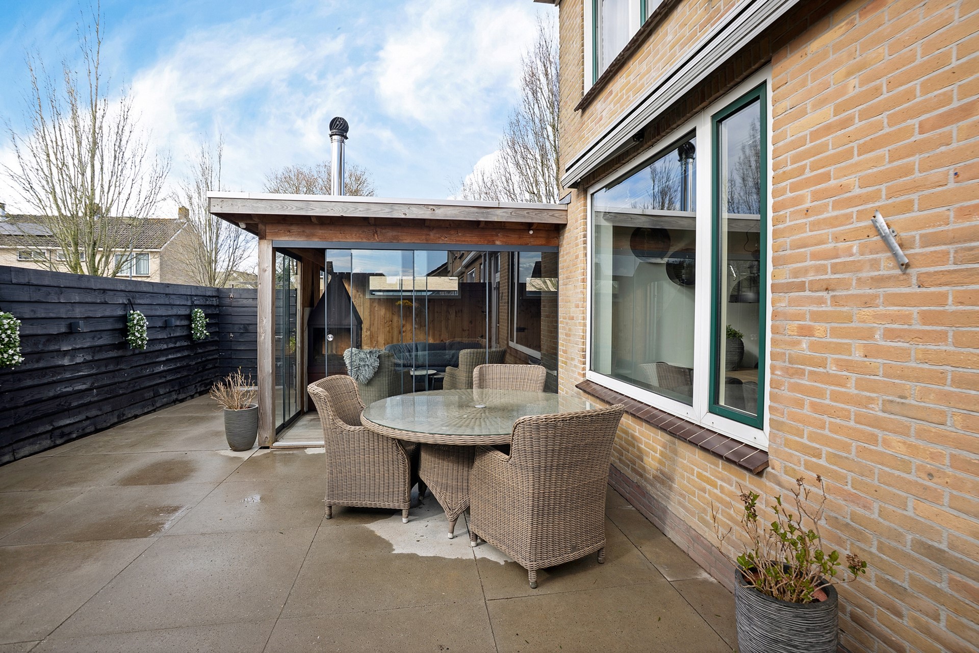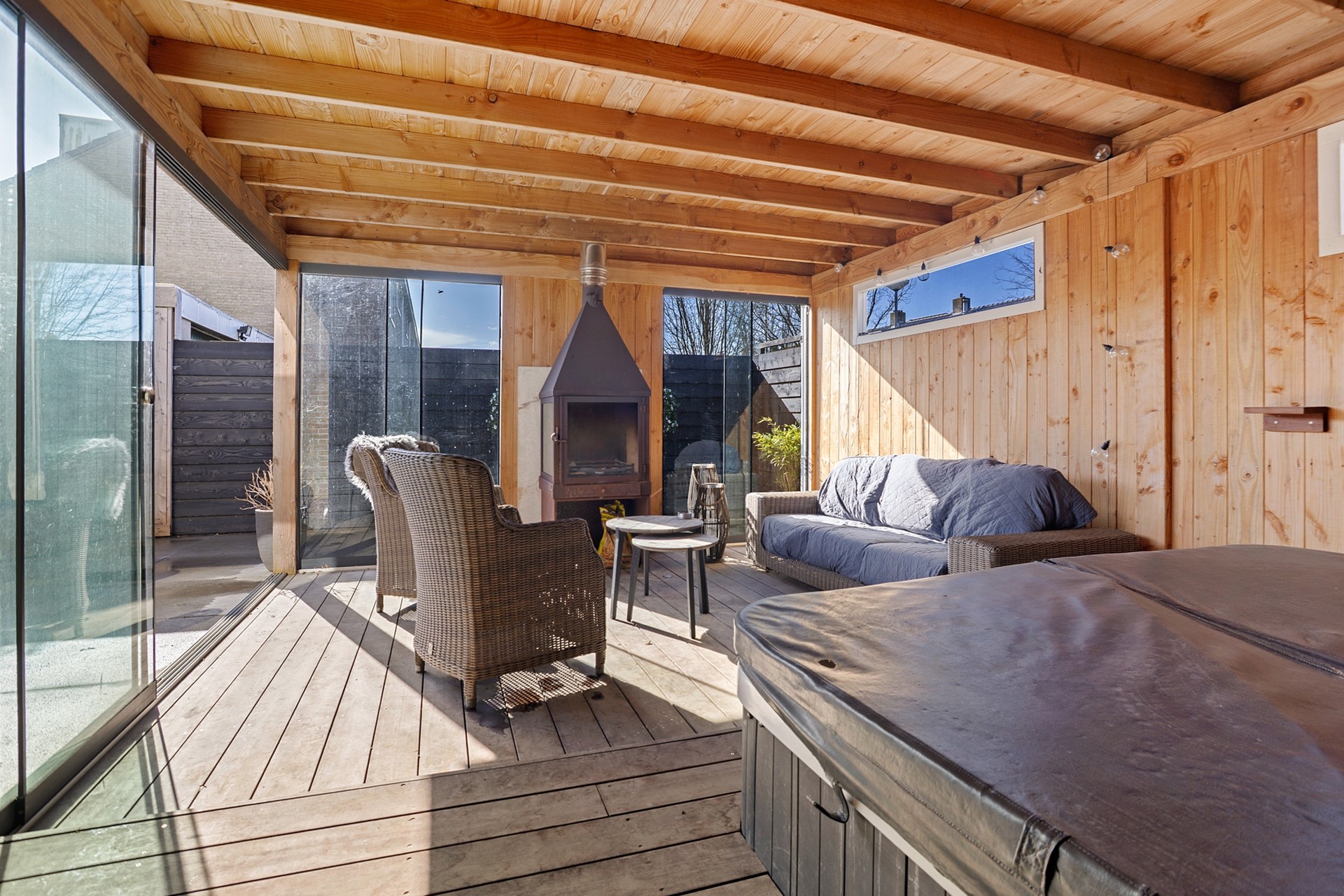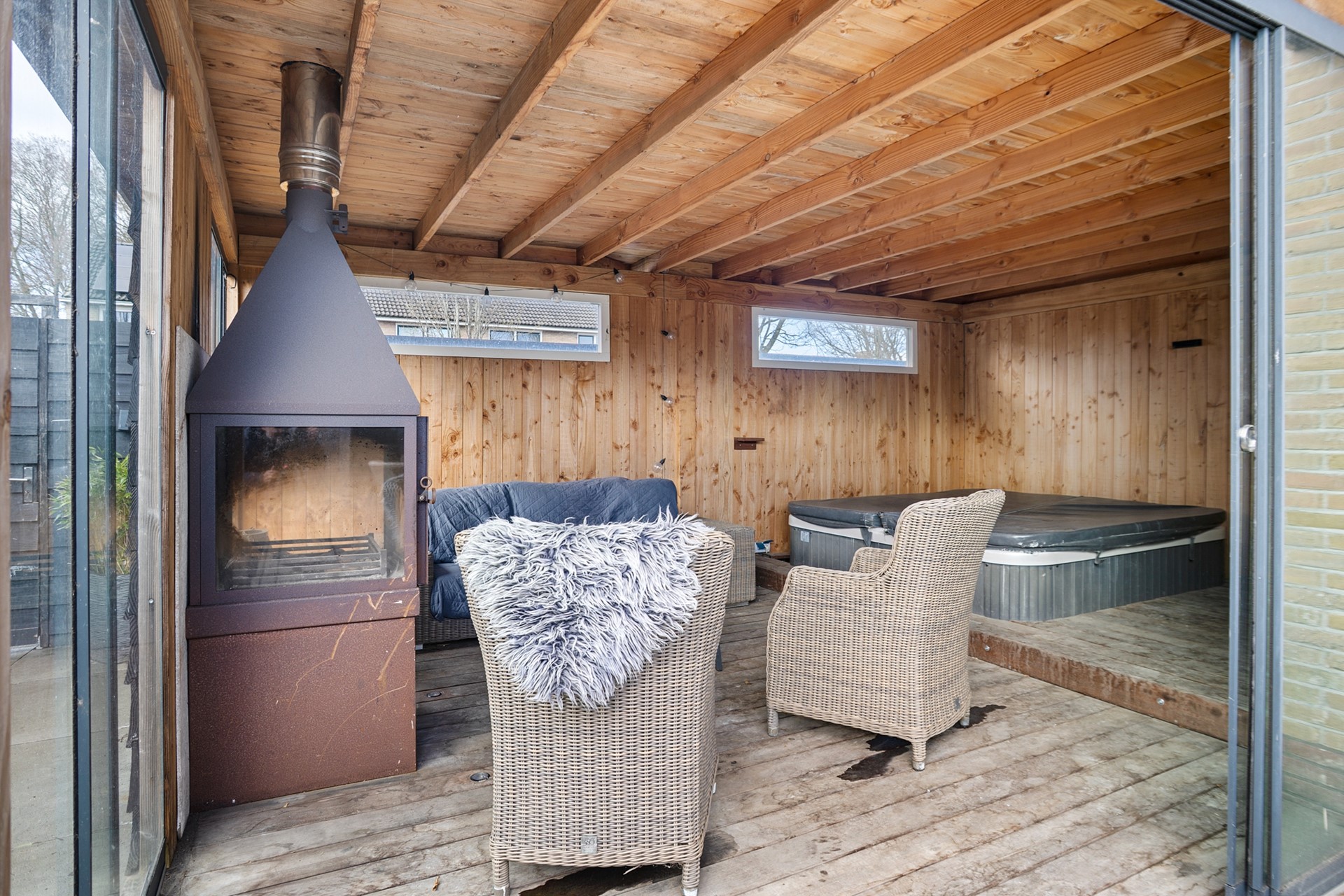 De achtertuin is gelegen op het zuiden en biedt veel privacy. Onder de overkapping, met glazen schuifwanden, is een sfeervolle wellnessruimte gerealiseerd met jacuzzi en houtkachel. Daarnaast beschikt de woning over een dubbele garage en is er parkeergelegenheid voor twee auto’s op eigen terrein.