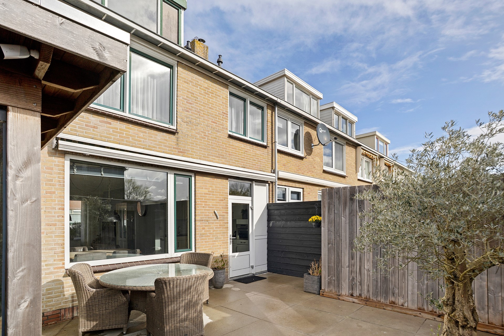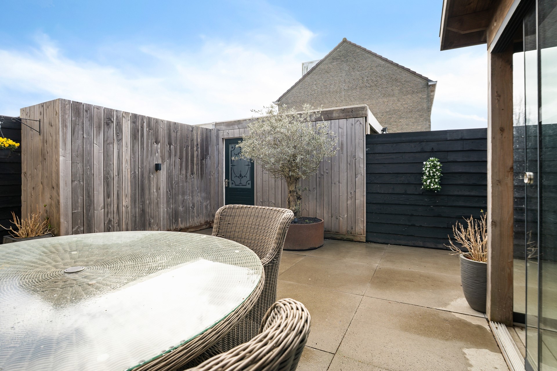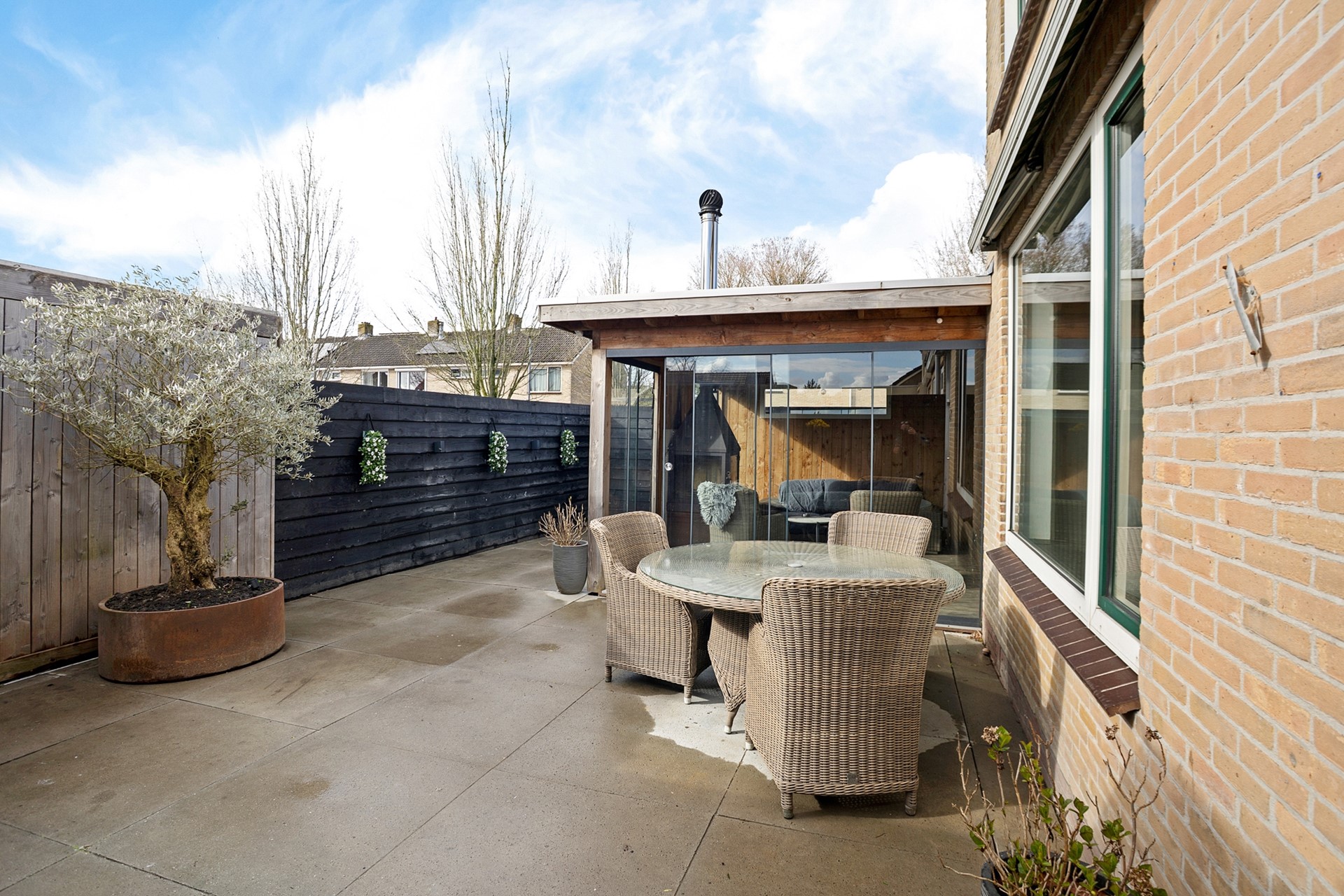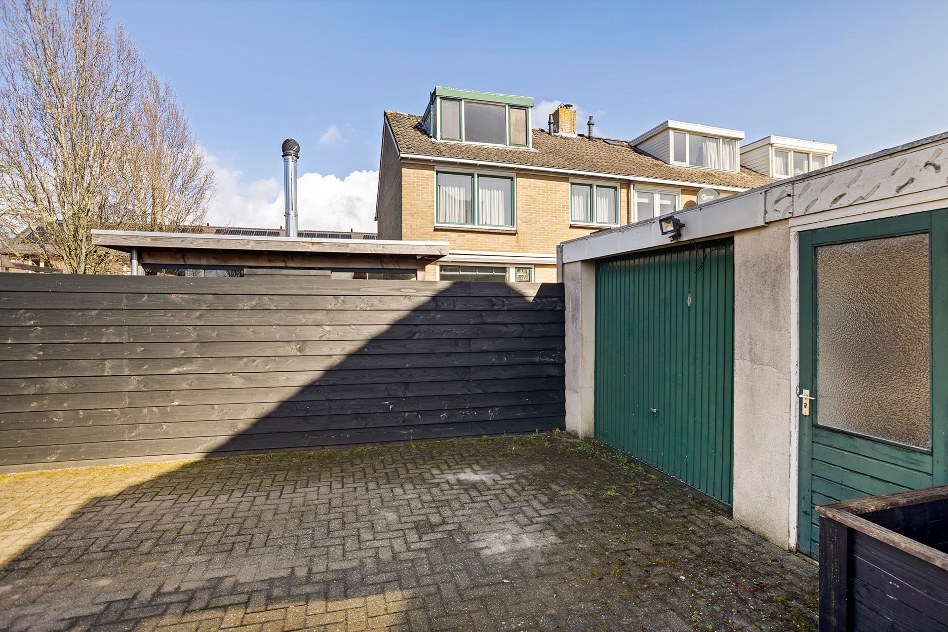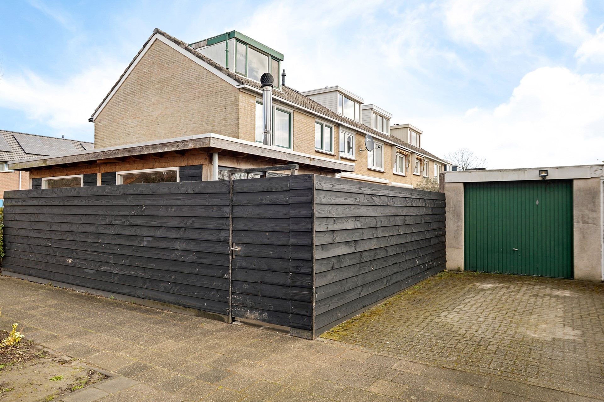 De achtertuin is gelegen op het zuiden en biedt veel privacy. Onder de overkapping, met glazen schuifwanden, is een sfeervolle wellnessruimte gerealiseerd met jacuzzi en houtkachel. Daarnaast beschikt de woning over een dubbele garage en is er parkeergelegenheid voor twee auto’s op eigen terrein.
