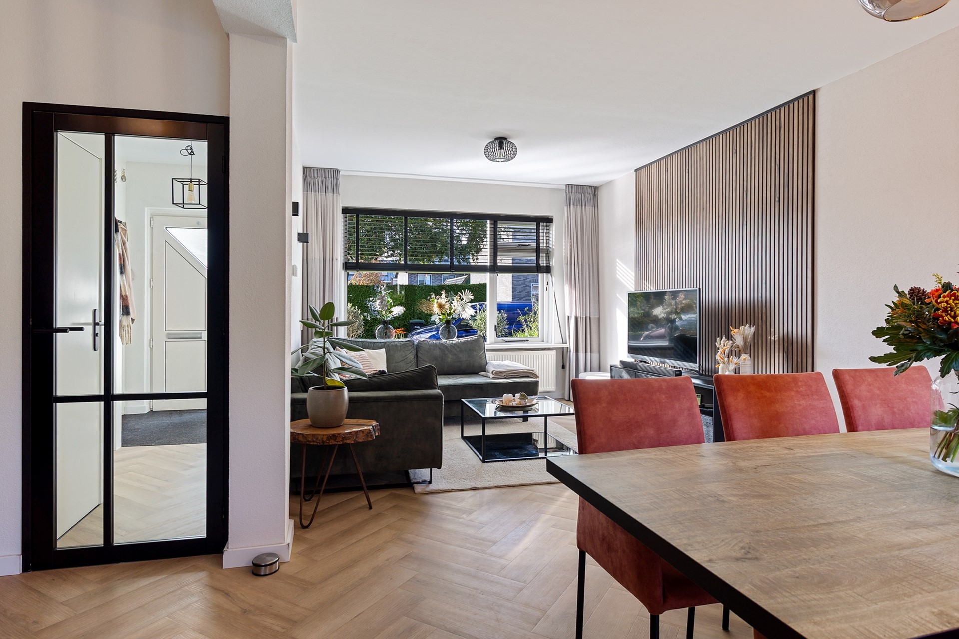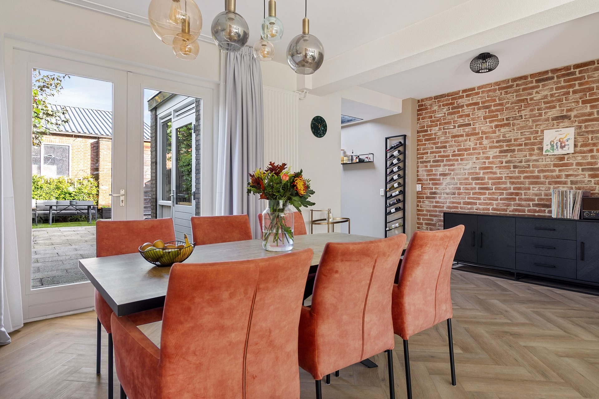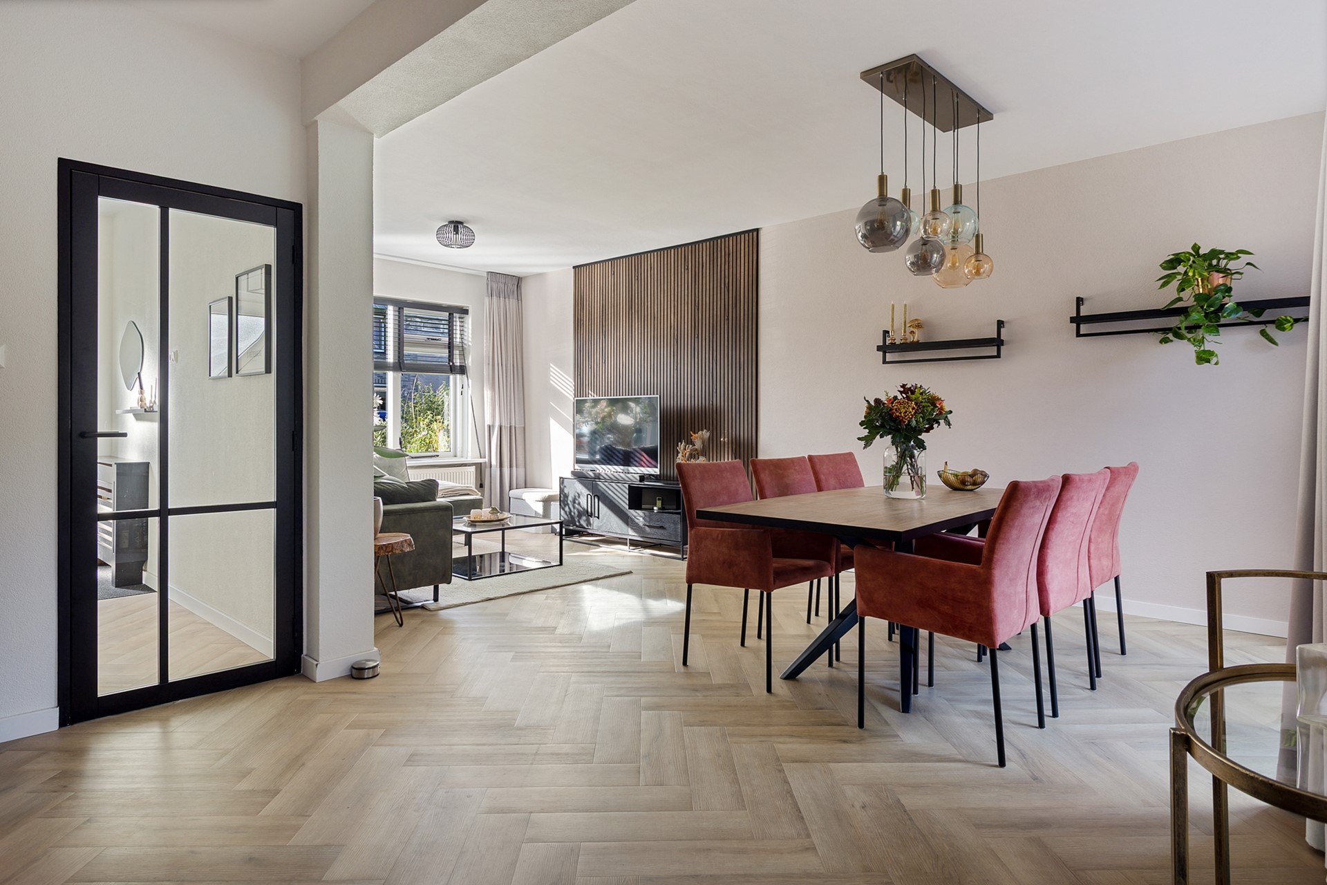 De woonkamer is straatgericht en voorzien van een fraaie PVC vloer in visgraatmotief. Vanuit hier kijk je zo naar de gezellige eethoek, waar de openslaande deuren naar de achtertuin voor een prettige lichtinval zorgen. De keuken, gelegen in de aanbouw, is uitgerust met alle gemakken: een vaatwasser, gaskookplaat, wasemkap, oven en koel-/vriescombinatie. Via de stijlvolle taatsdeur kom je in de hal met modern toilet en trapopgang.