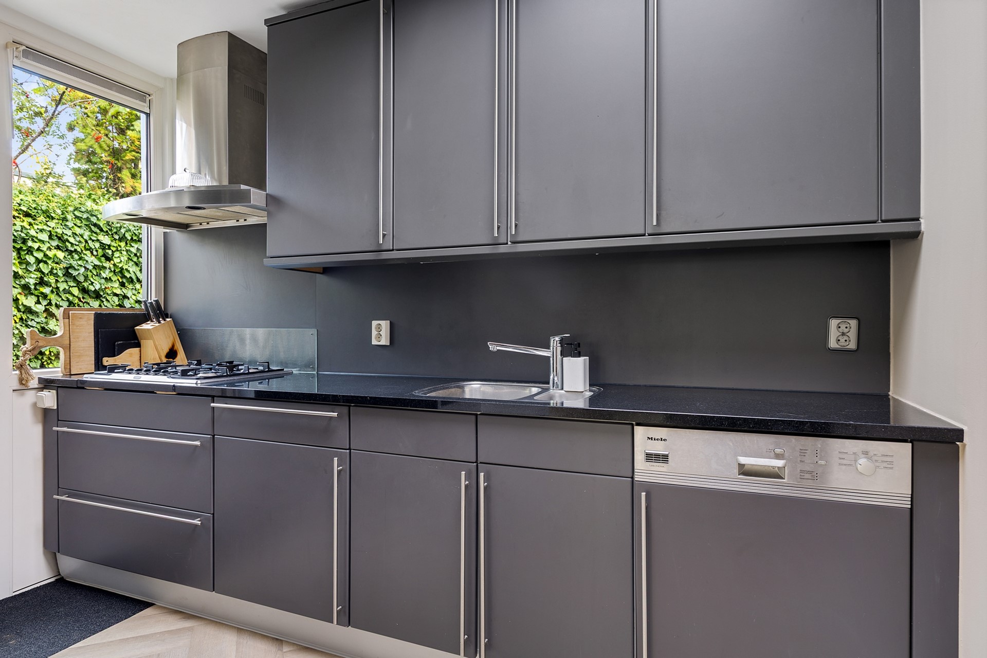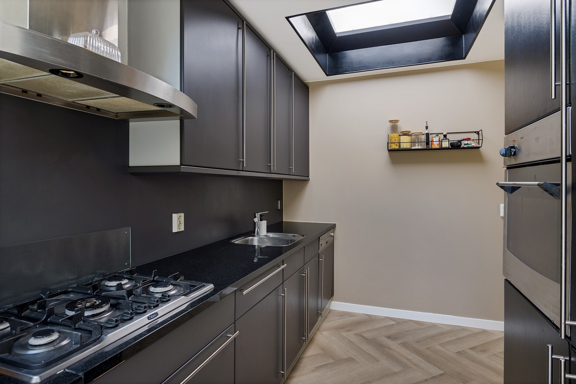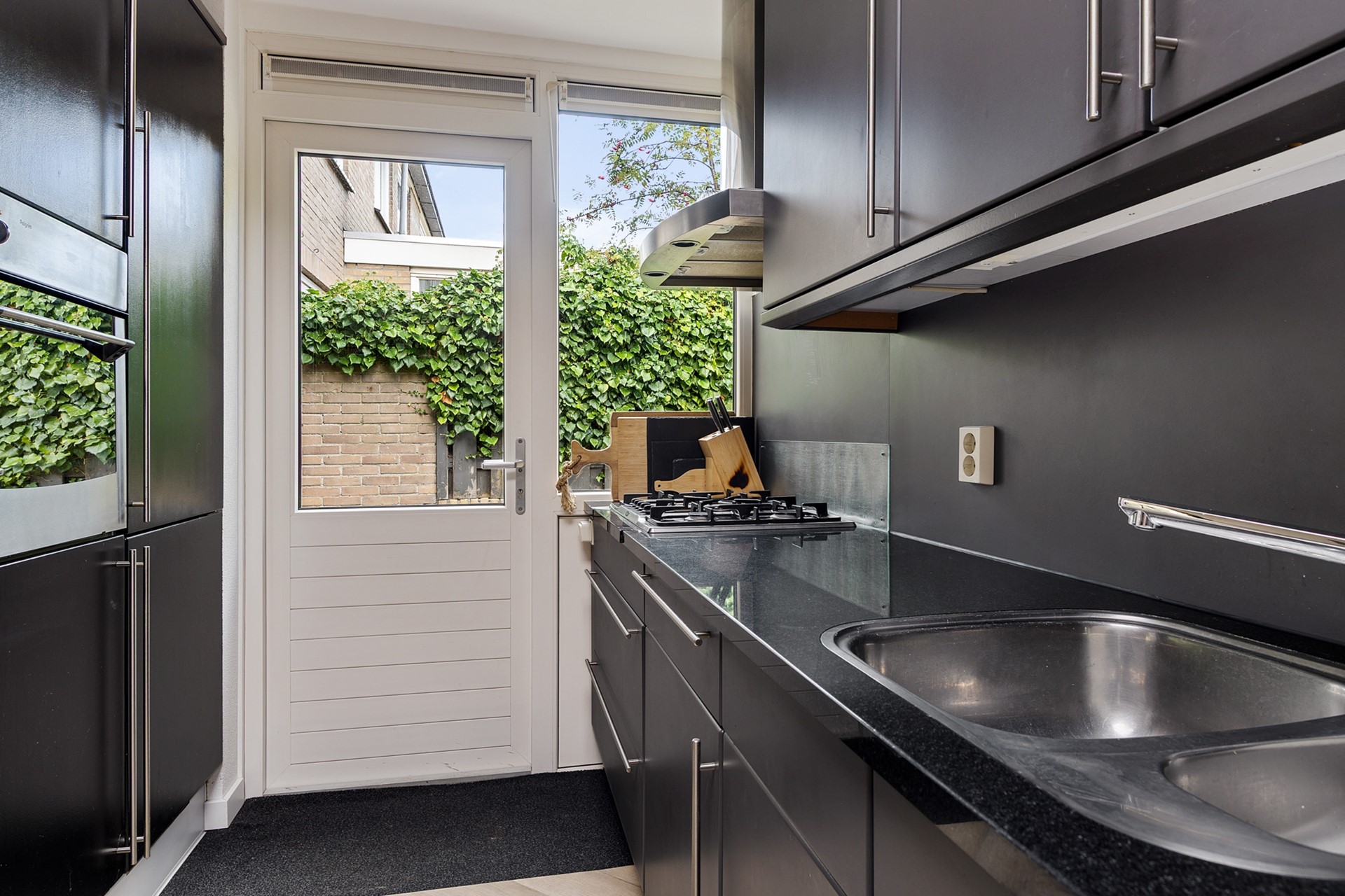 De woonkamer is straatgericht en voorzien van een fraaie PVC vloer in visgraatmotief. Vanuit hier kijk je zo naar de gezellige eethoek, waar de openslaande deuren naar de achtertuin voor een prettige lichtinval zorgen. De keuken, gelegen in de aanbouw, is uitgerust met alle gemakken: een vaatwasser, gaskookplaat, wasemkap, oven en koel-/vriescombinatie. Via de stijlvolle taatsdeur kom je in de hal met modern toilet en trapopgang.