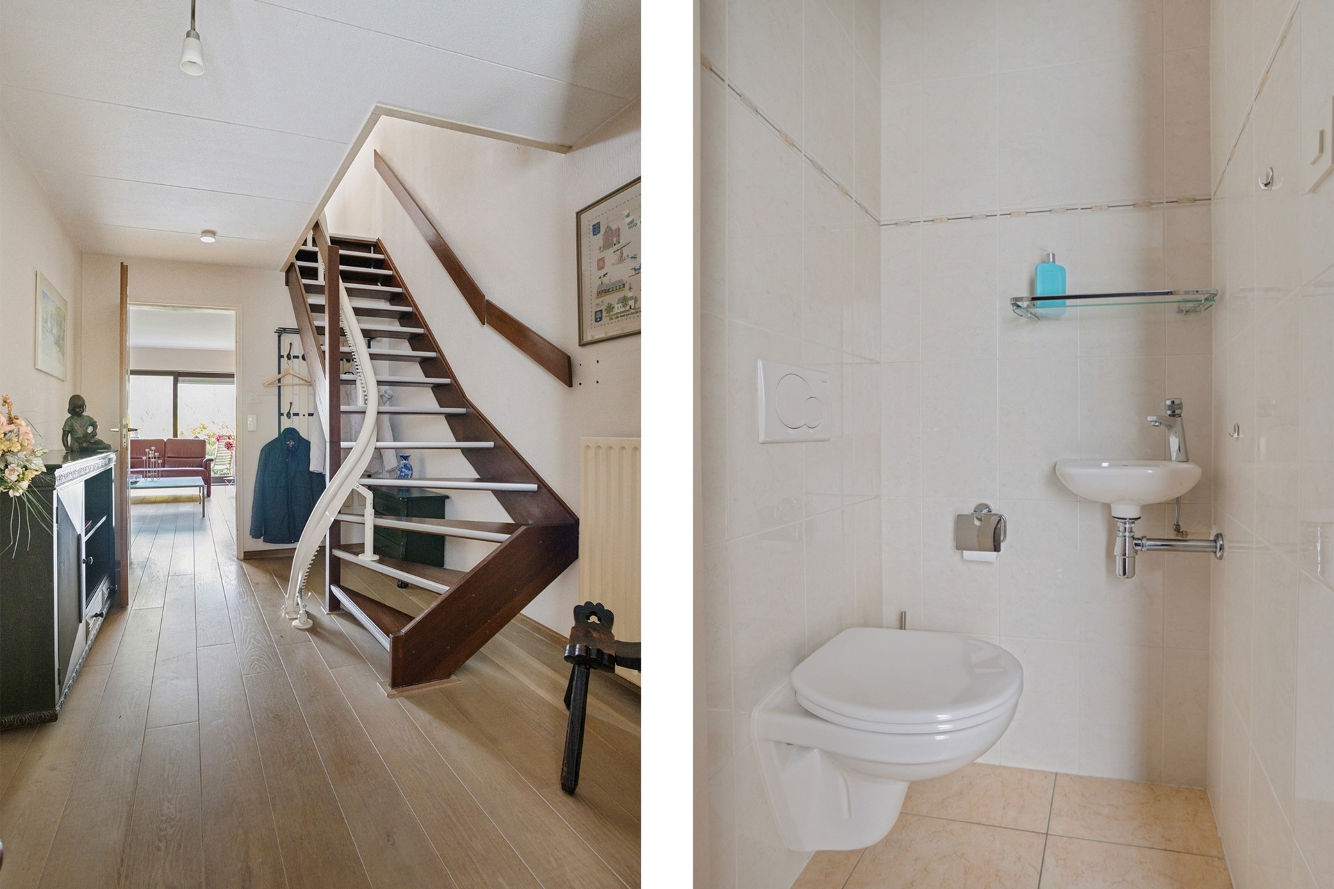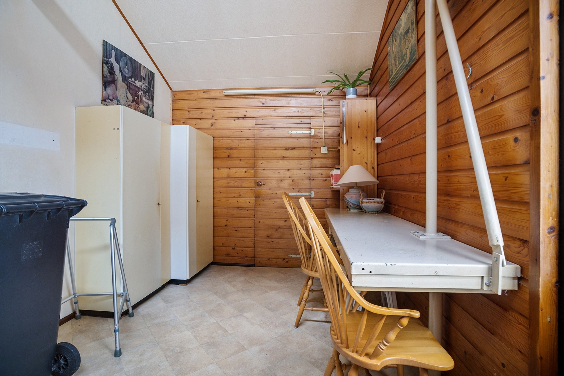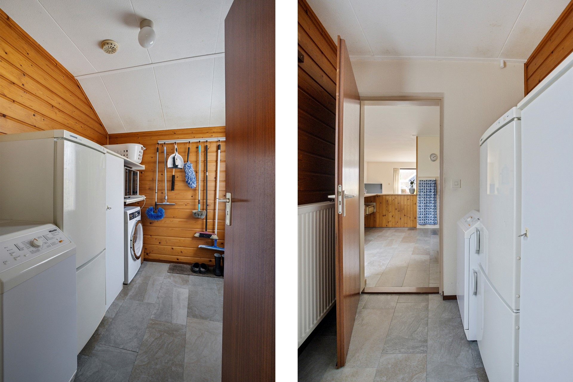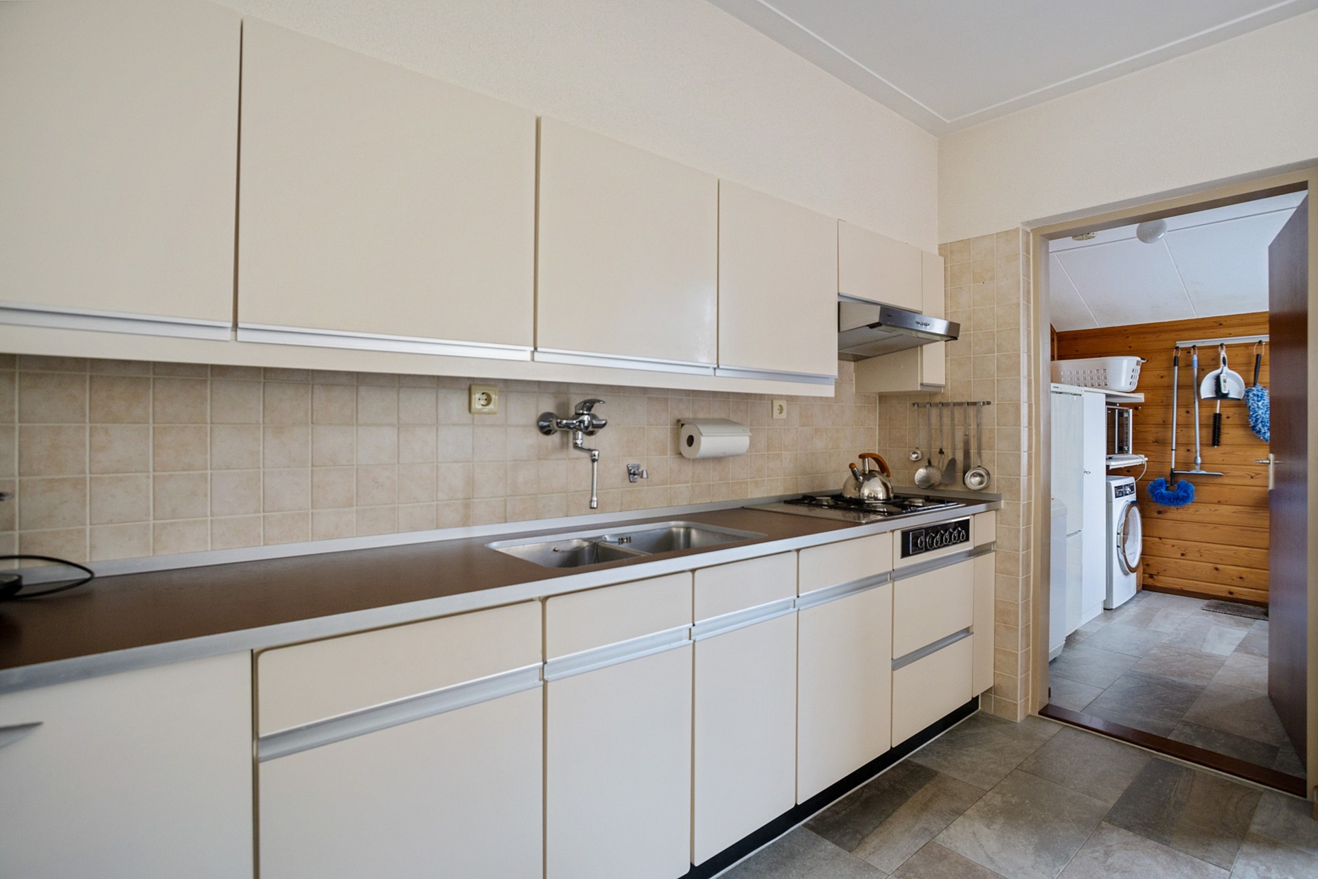 Aansluitend bevindt zich de praktische bijkeuken met wasmachine- en drogeraansluitingen en een loopdeur naar de tuin.