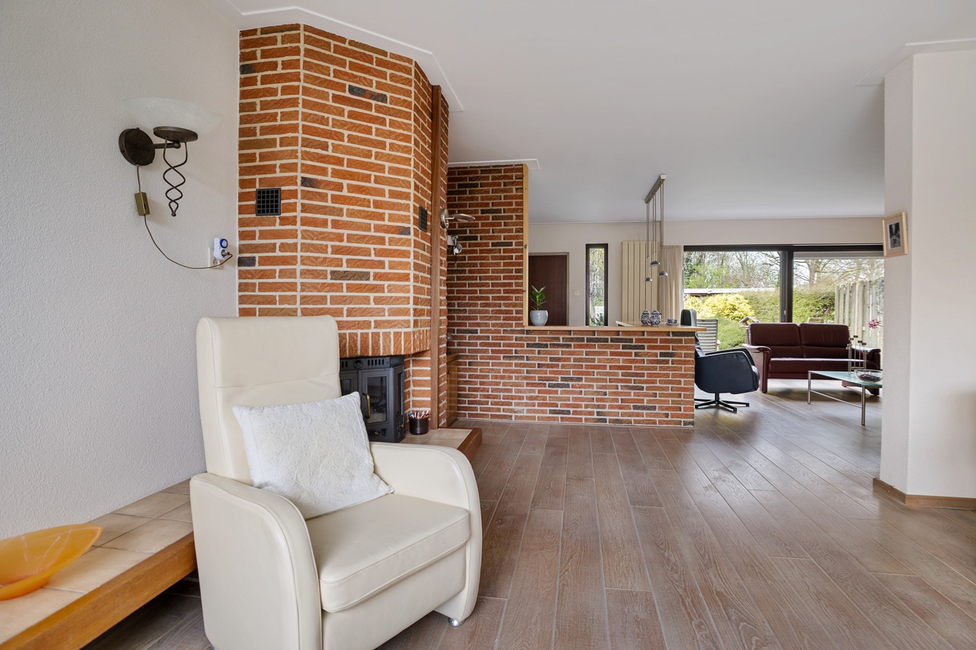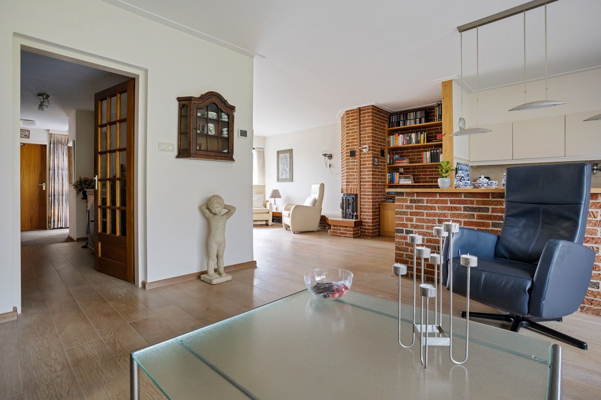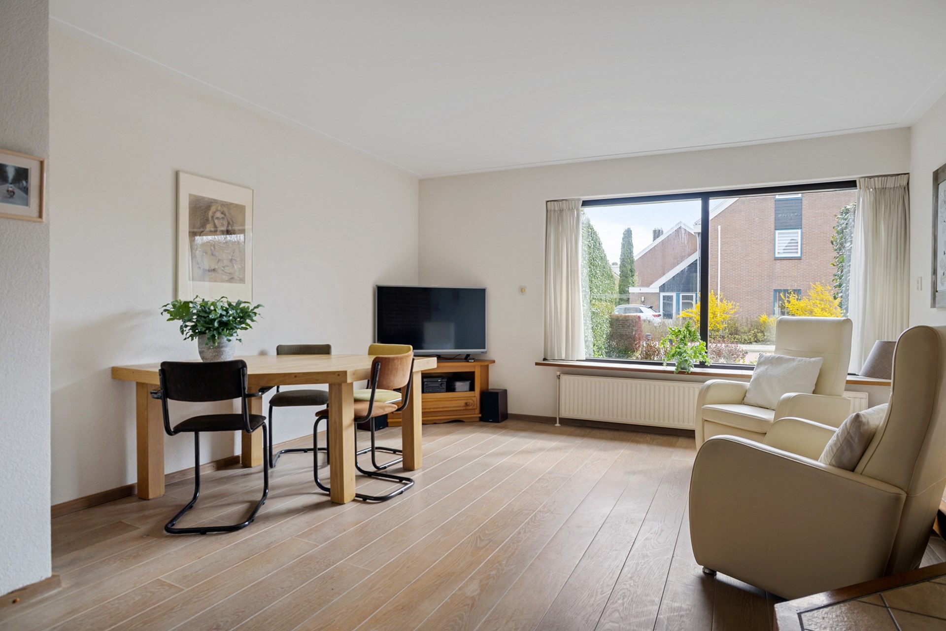 Via de voorentree bereikt u de hal met modern toilet en fontein, trapopgang naar de eerste verdieping en toegang tot de frontberging/garage met opstelplaats van de CV-ketel (Remeha, 2023). De woonverdieping is verrassend ruim opgezet en afgewerkt met een houten vloer en een strak gestukt plafond met sierlijst. De tuingerichte woonkamer beschikt over een brede schuifpui naar de achtertuin en biedt prettig zicht op het groen.