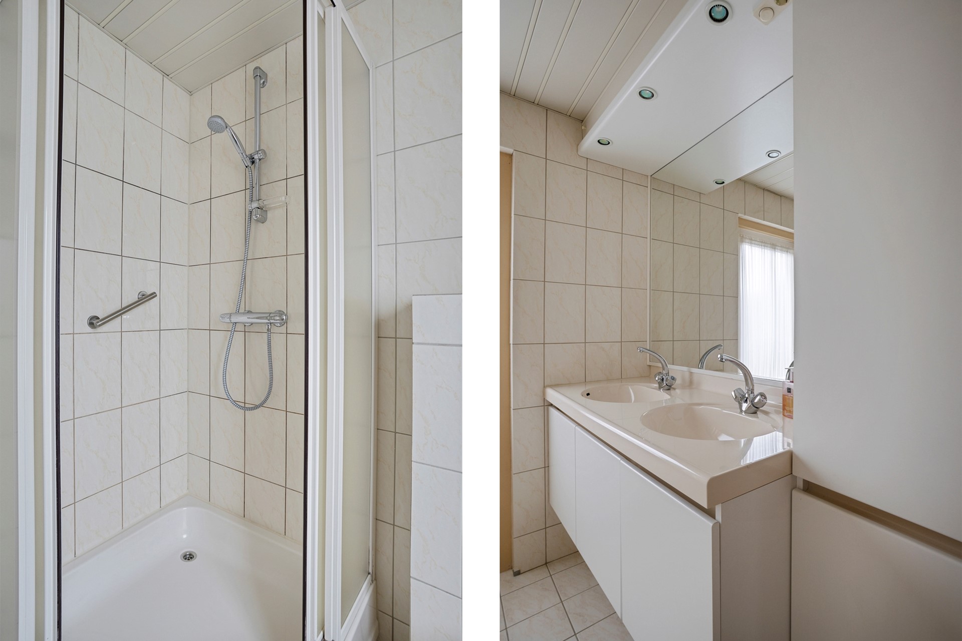 De nette badkamer is voorzien van een douchehoek, toilet, dubbele wastafel met meubel en een toegangsdeur tot een fijn balkon.