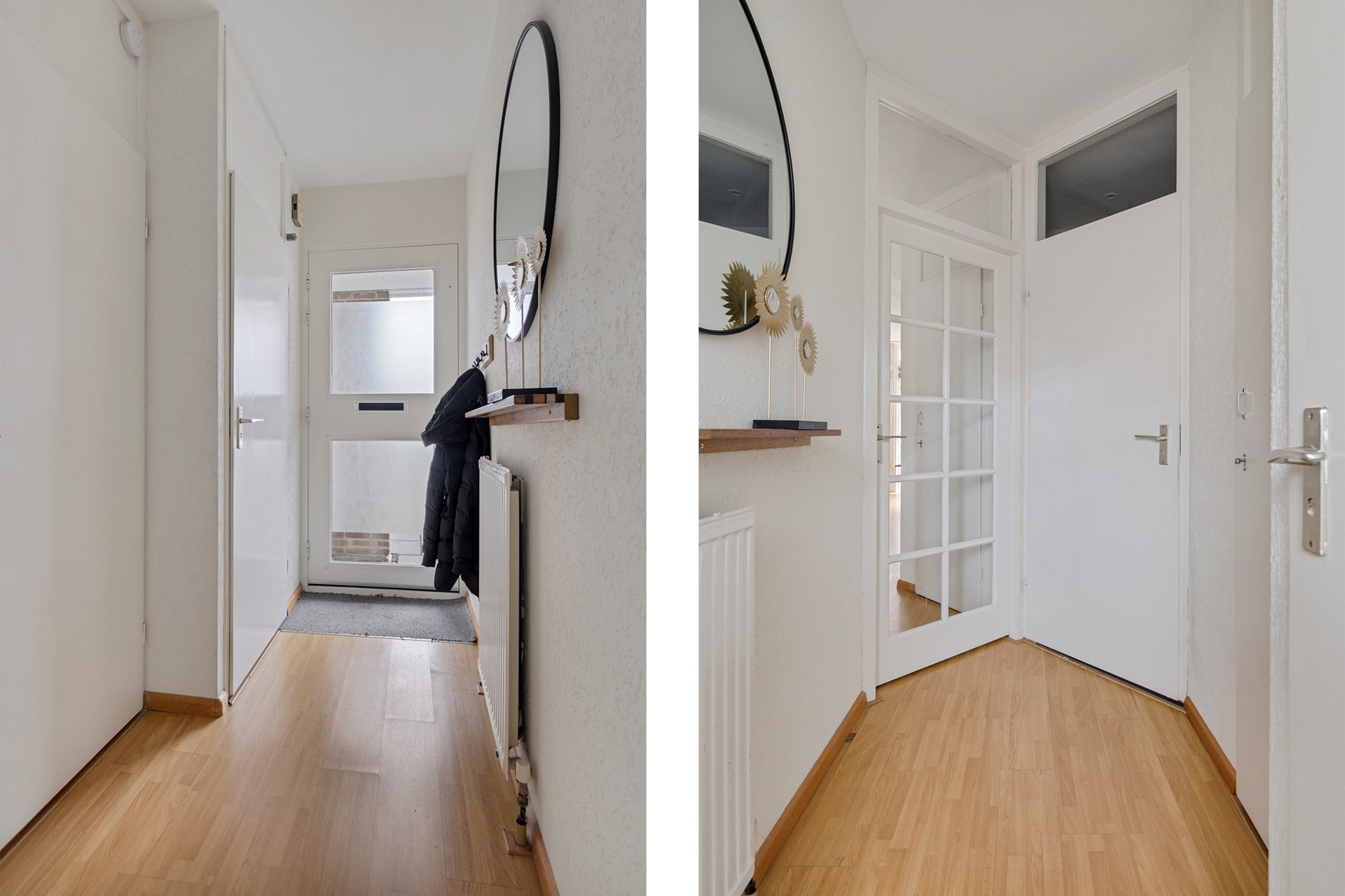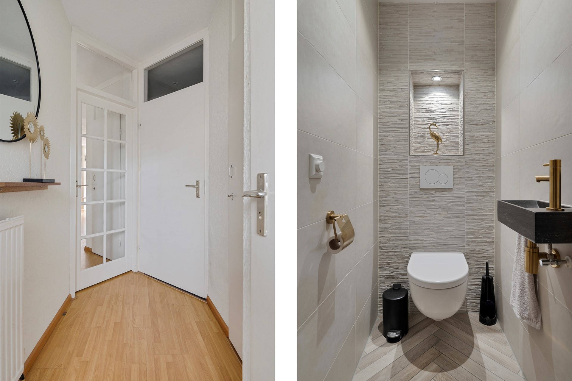 Via de entree/hal heb je toegang tot alle vertrekken. In de hal bevinden zich de wasruimte en het moderne, volledig betegelde toilet (2022), voorzien van een wandcloset en fontein.