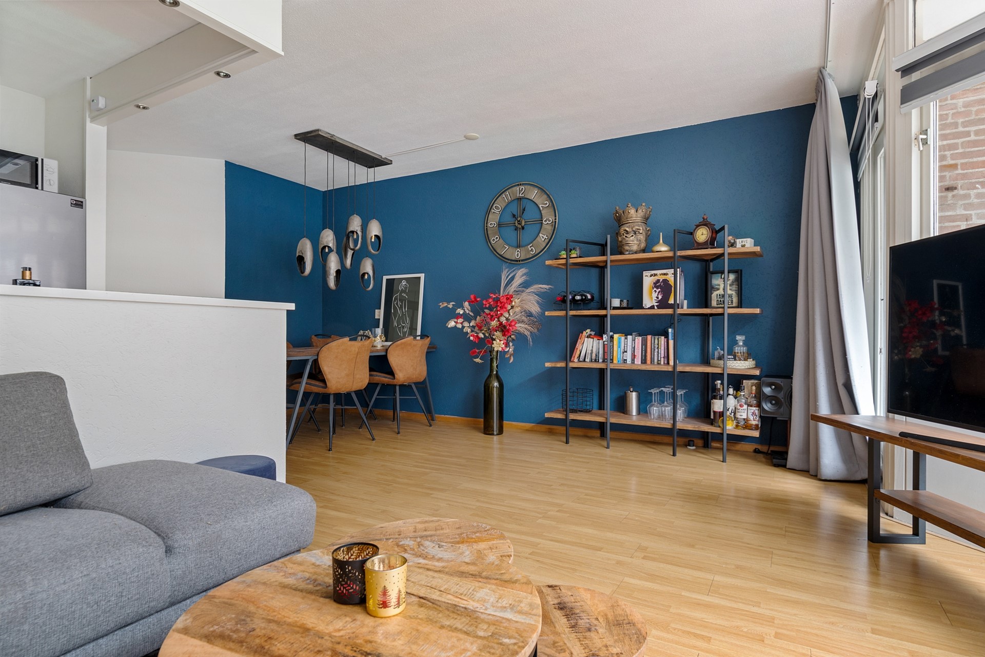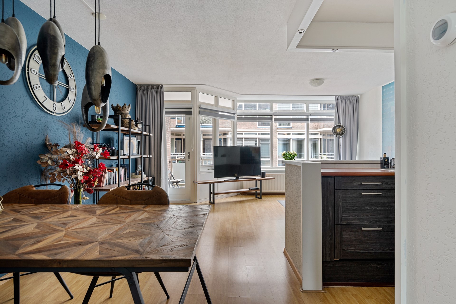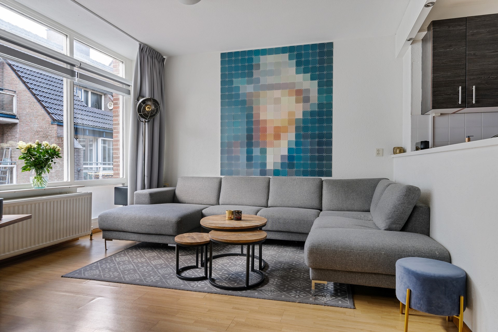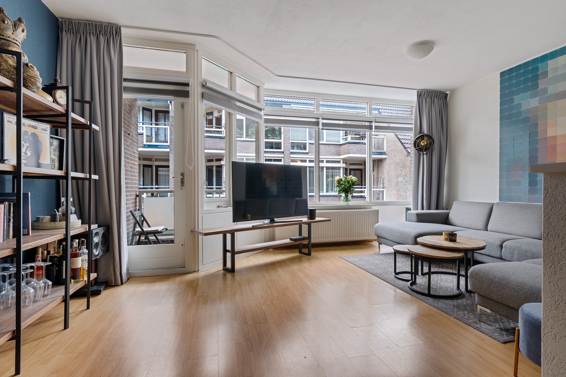 De lichte woonkamer is een fijne leefruimte met grote raampartijen en directe toegang tot het balkon. Het balkon is een heerlijk plekje om te ontspannen, met vrij uitzicht over de winkelpromenade van de Huesmolen.