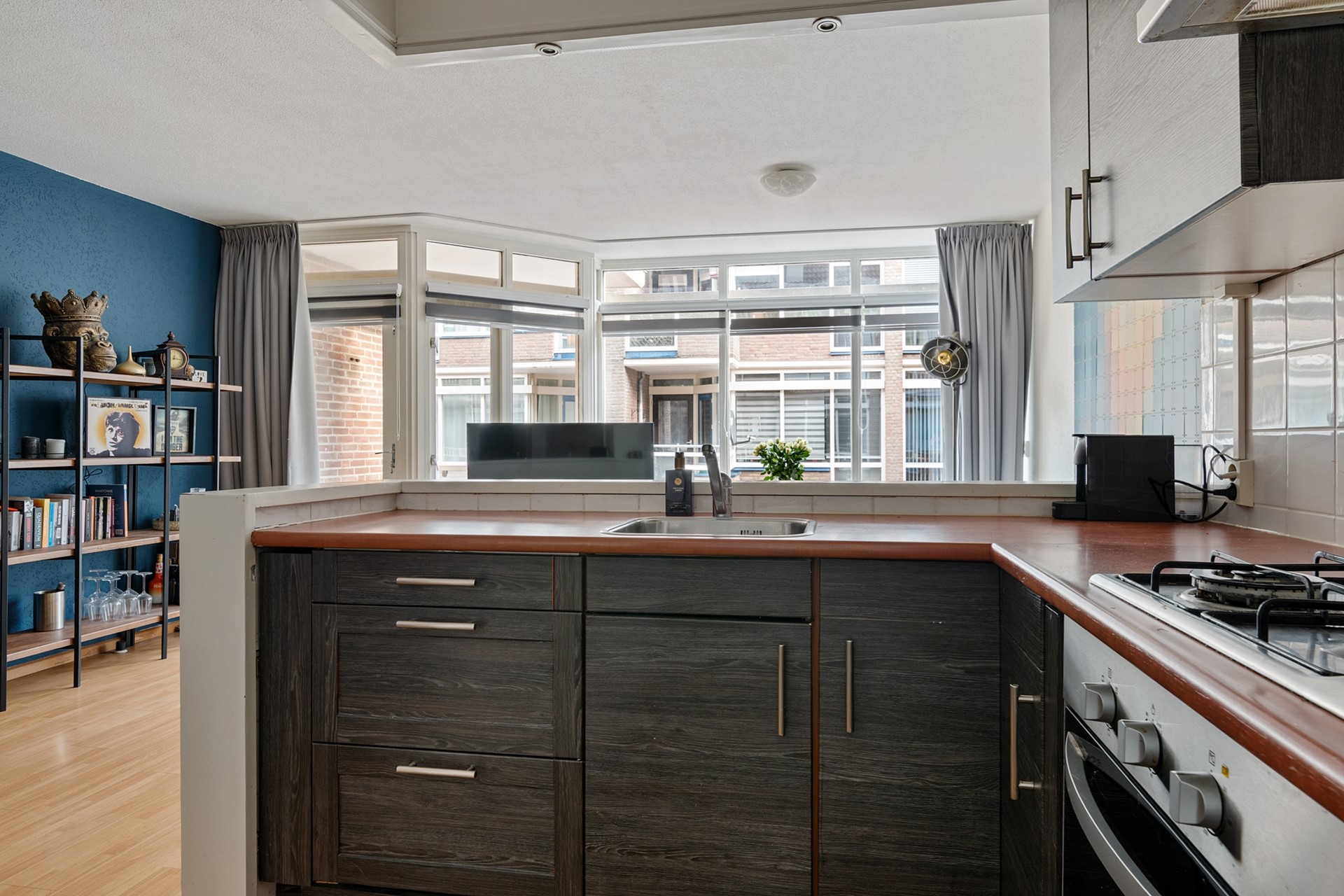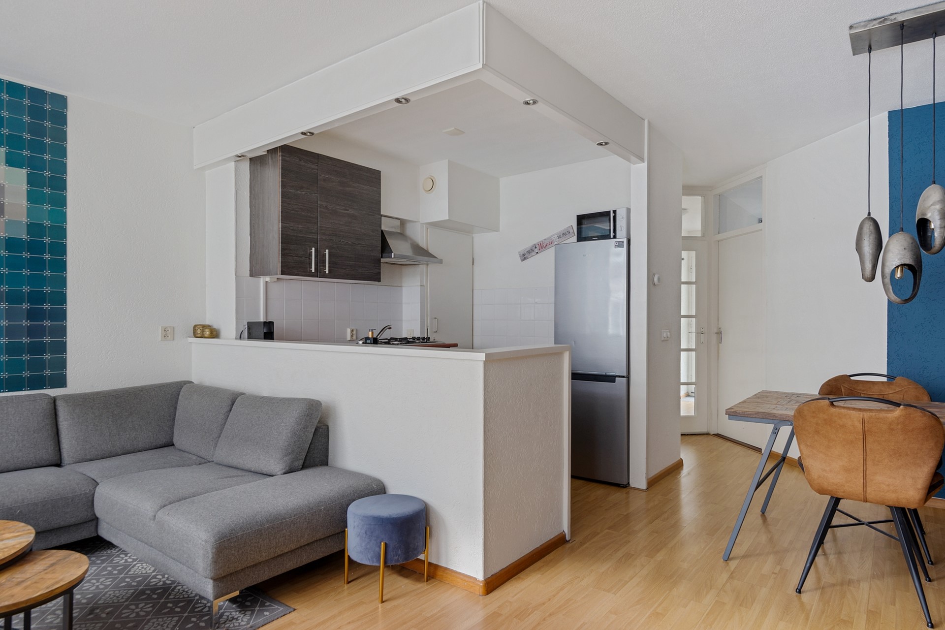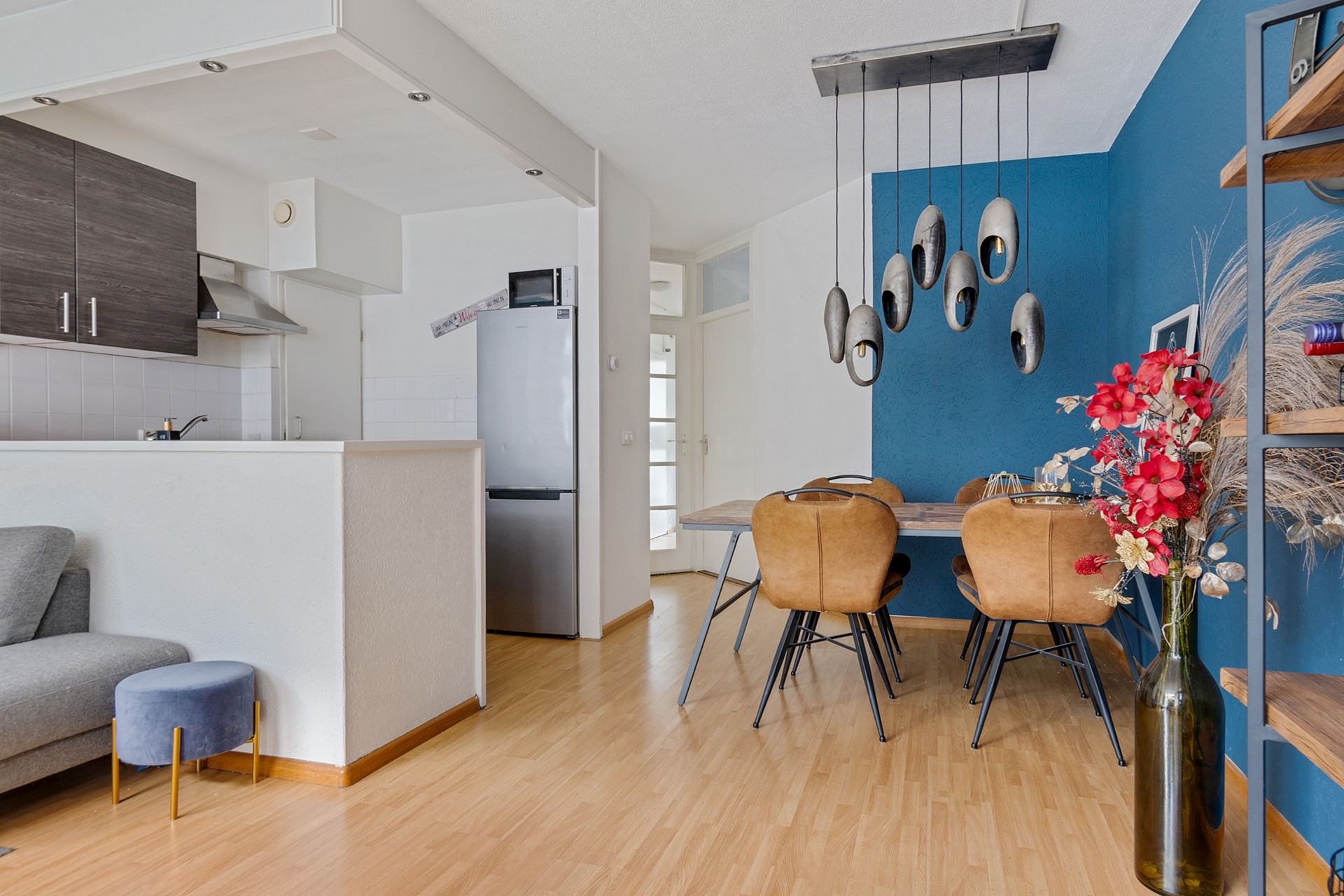 De eethoek vormt het centrale punt van de woning en verbindt de keuken met de woonkamer. De keuken is praktisch ingericht en voorzien van een oven, 4-pits gaskookplaat en spoelbak. Hier is tevens de cv-ketel (Nefit, 2025) opgesteld.