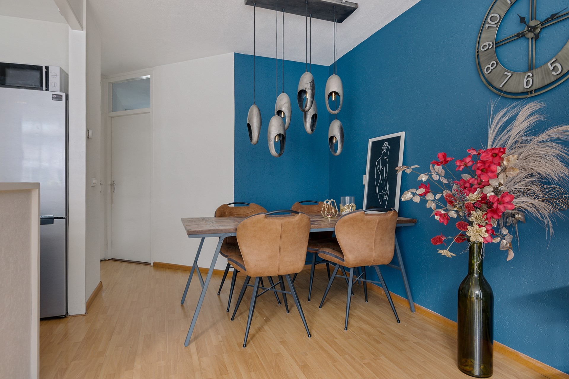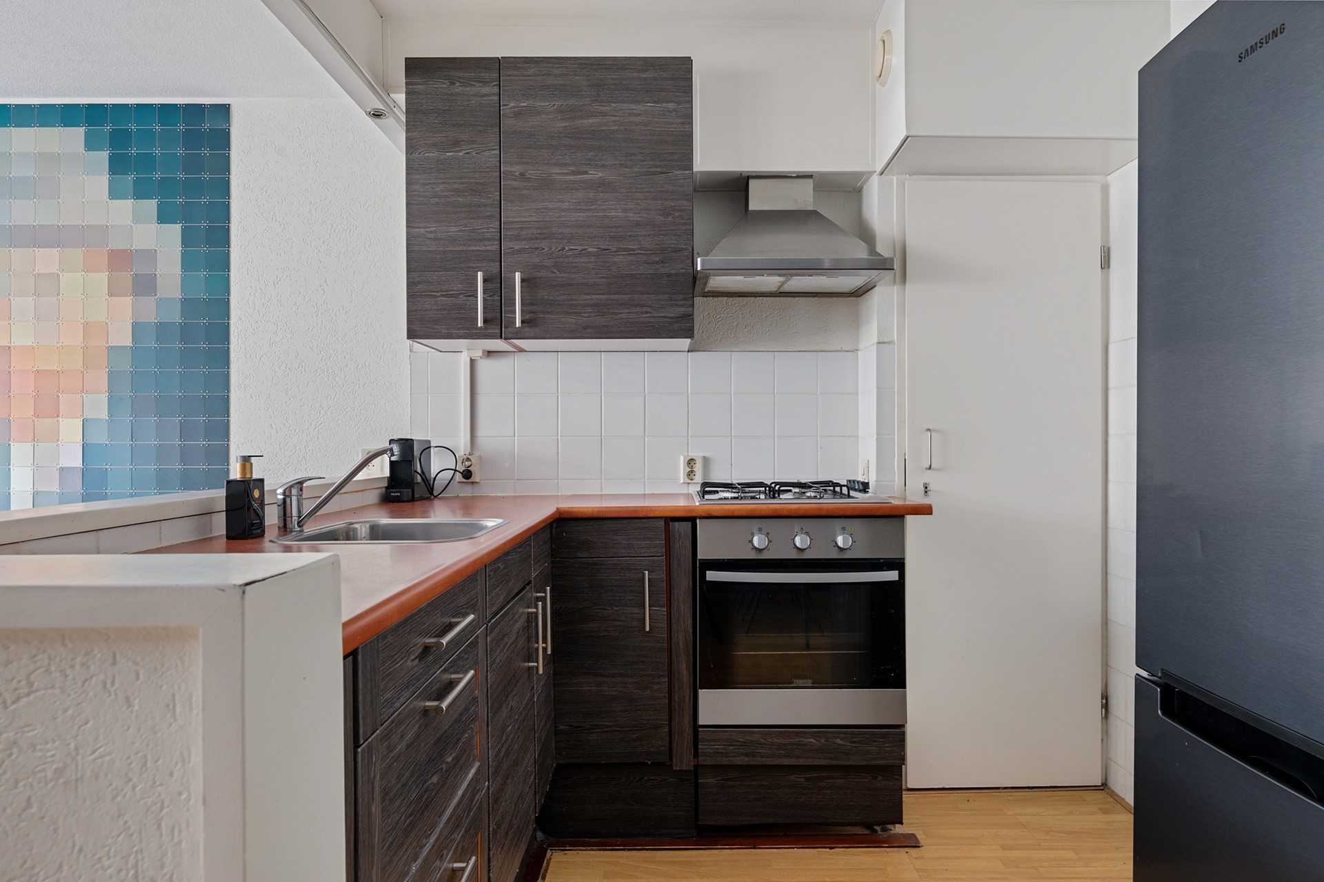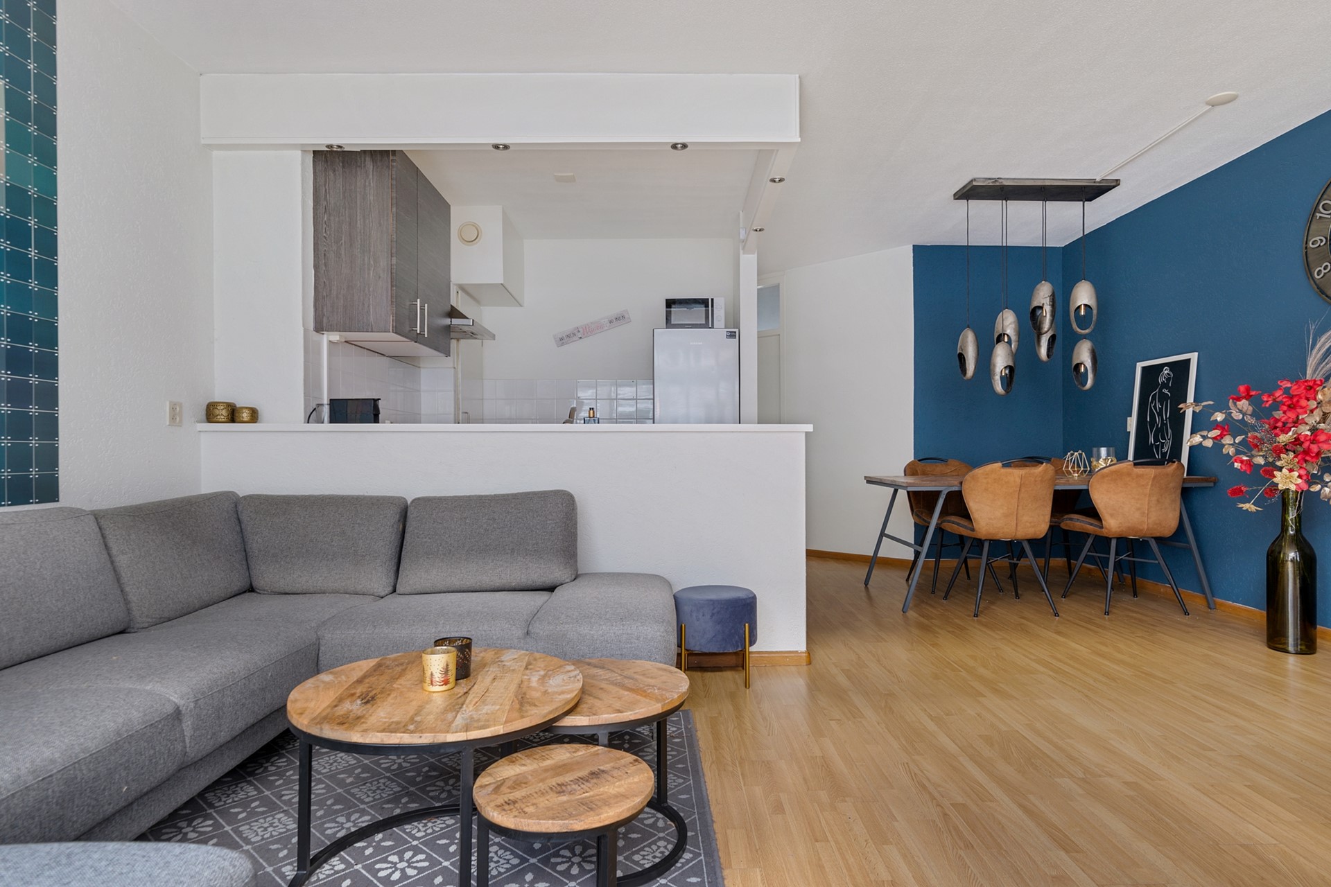De eethoek vormt het centrale punt van de woning en verbindt de keuken met de woonkamer. De keuken is praktisch ingericht en voorzien van een oven, 4-pits gaskookplaat en spoelbak. Hier is tevens de cv-ketel (Nefit, 2025) opgesteld.