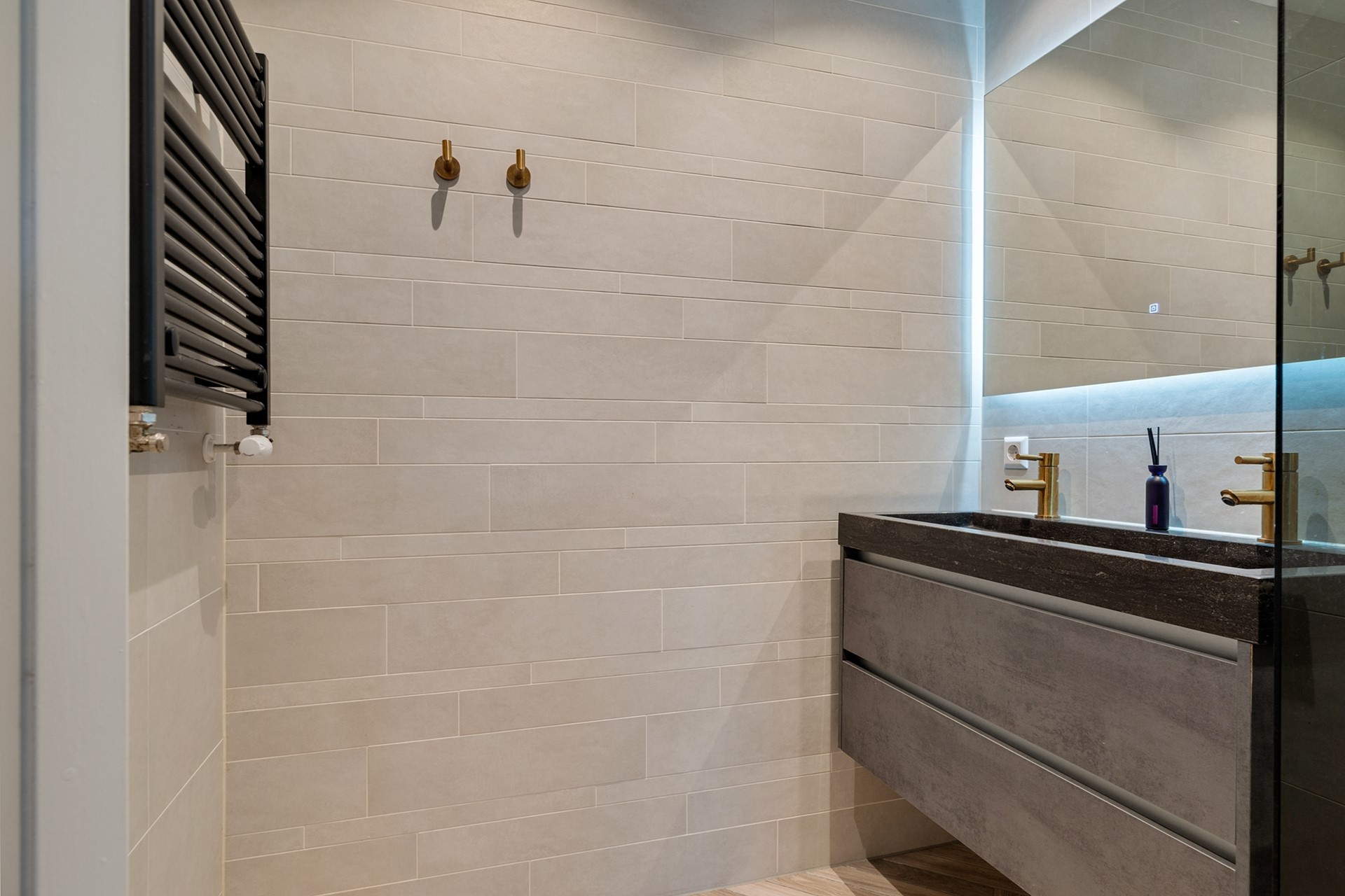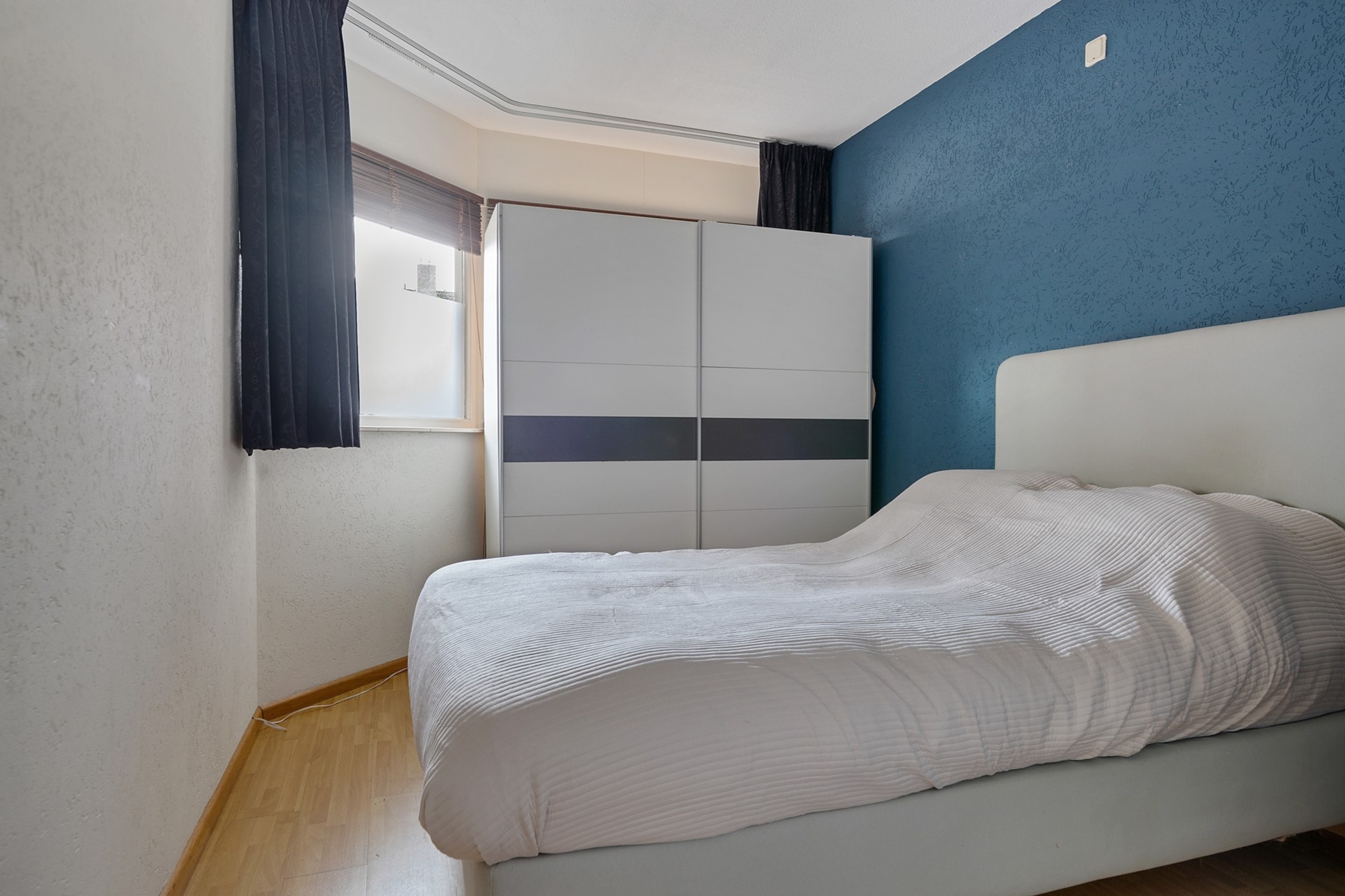 De slaapkamer is van goed formaat en biedt voldoende ruimte voor een tweepersoonsbed en kastruimte. Aangrenzend vind je de strakke badkamer (2022), eveneens volledig betegeld en uitgevoerd met een douchecabine en een dubbele wastafel met meubel.