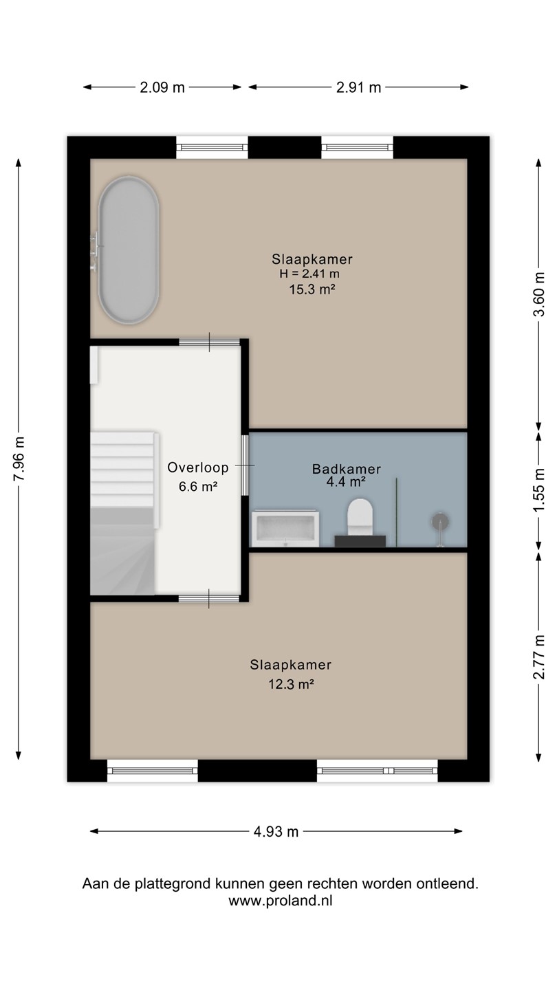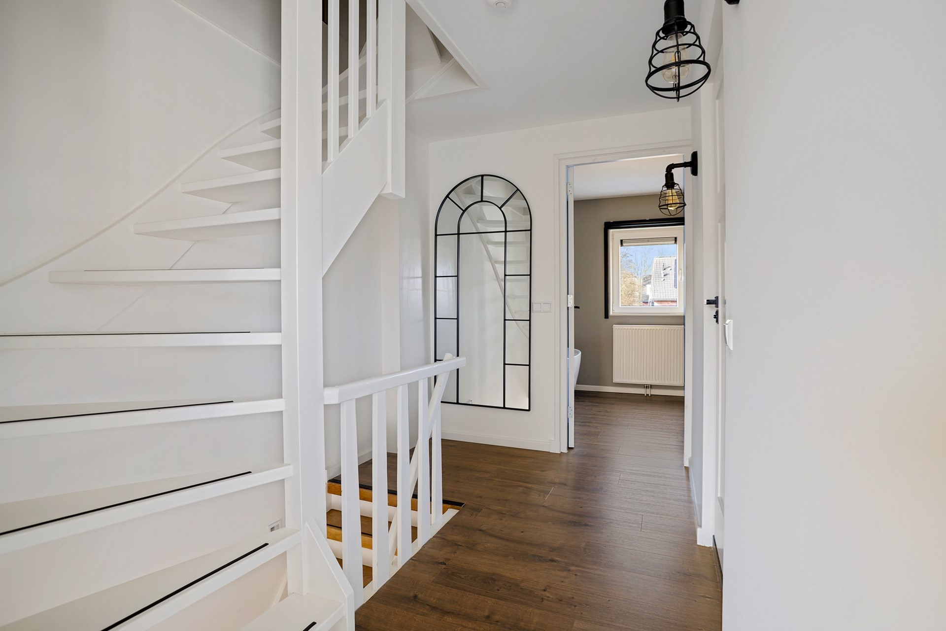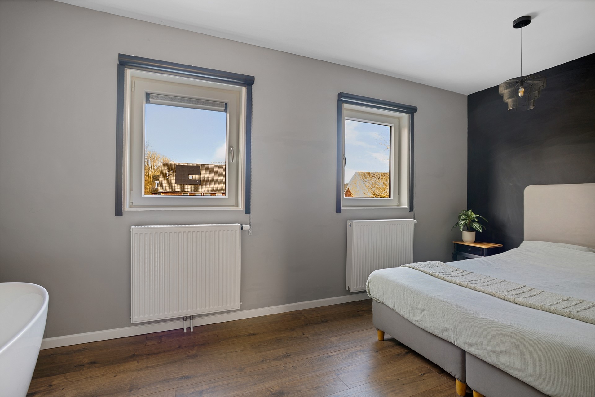 Op de eerste verdieping bevinden zich twee ruime slaapkamers. De slaapkamer aan de voorzijde is royaal en licht. De badkamer is modern uitgevoerd en voorzien van een douche, toilet en een wastafel met meubel. De slaapkamer aan de achterzijde heeft een bijzonder detail: een vrijstaand ligbad dat zorgt voor een hotelchique gevoel.