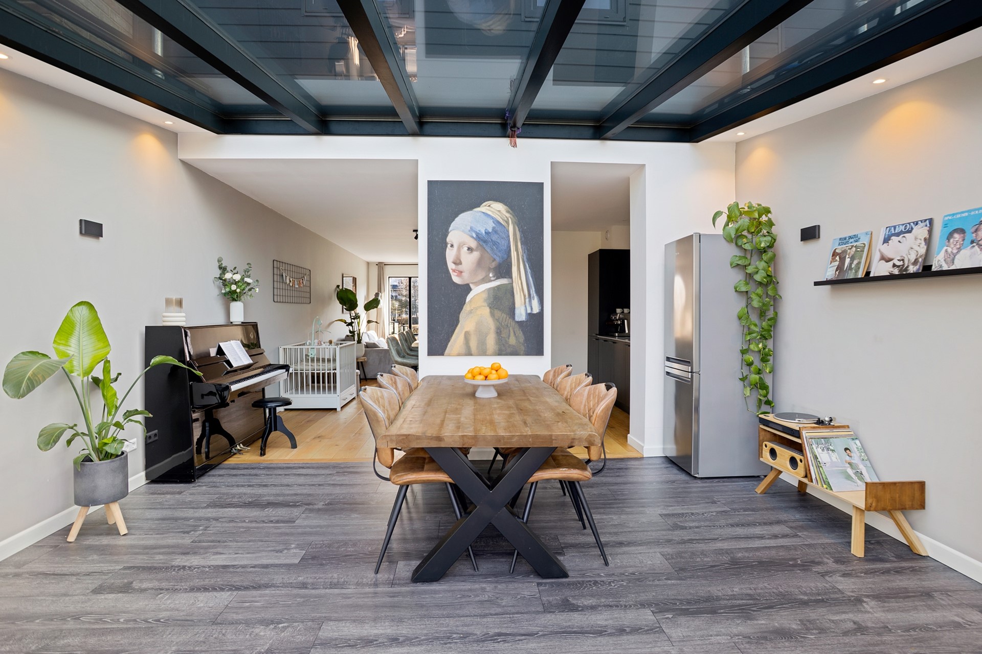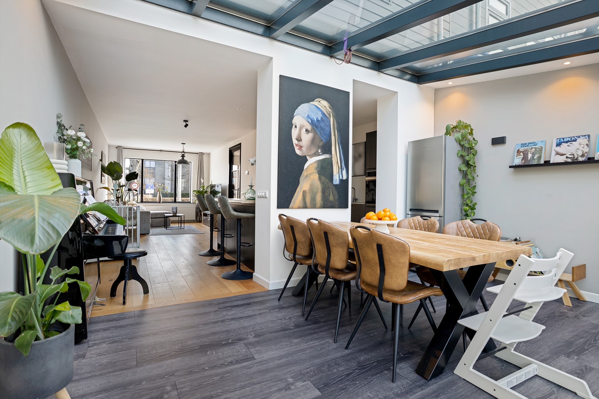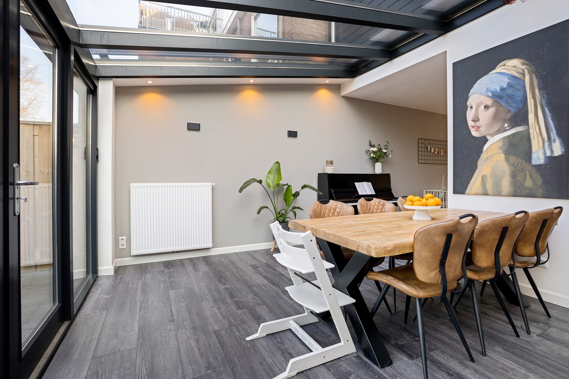Aan de achterzijde van de woning bevindt zich de fraaie woonkeuken. De keuken is strak uitgevoerd en voorzien van diverse inbouwapparatuur, waardoor koken hier een feestje wordt. Aansluitend ligt de eetkamer, waar de prachtige glaspartij en het glazen dak zorgen voor een enorme hoeveelheid daglicht. Een heerlijke plek om lang te tafelen met familie en vrienden terwijl je uitkijkt op de tuin.