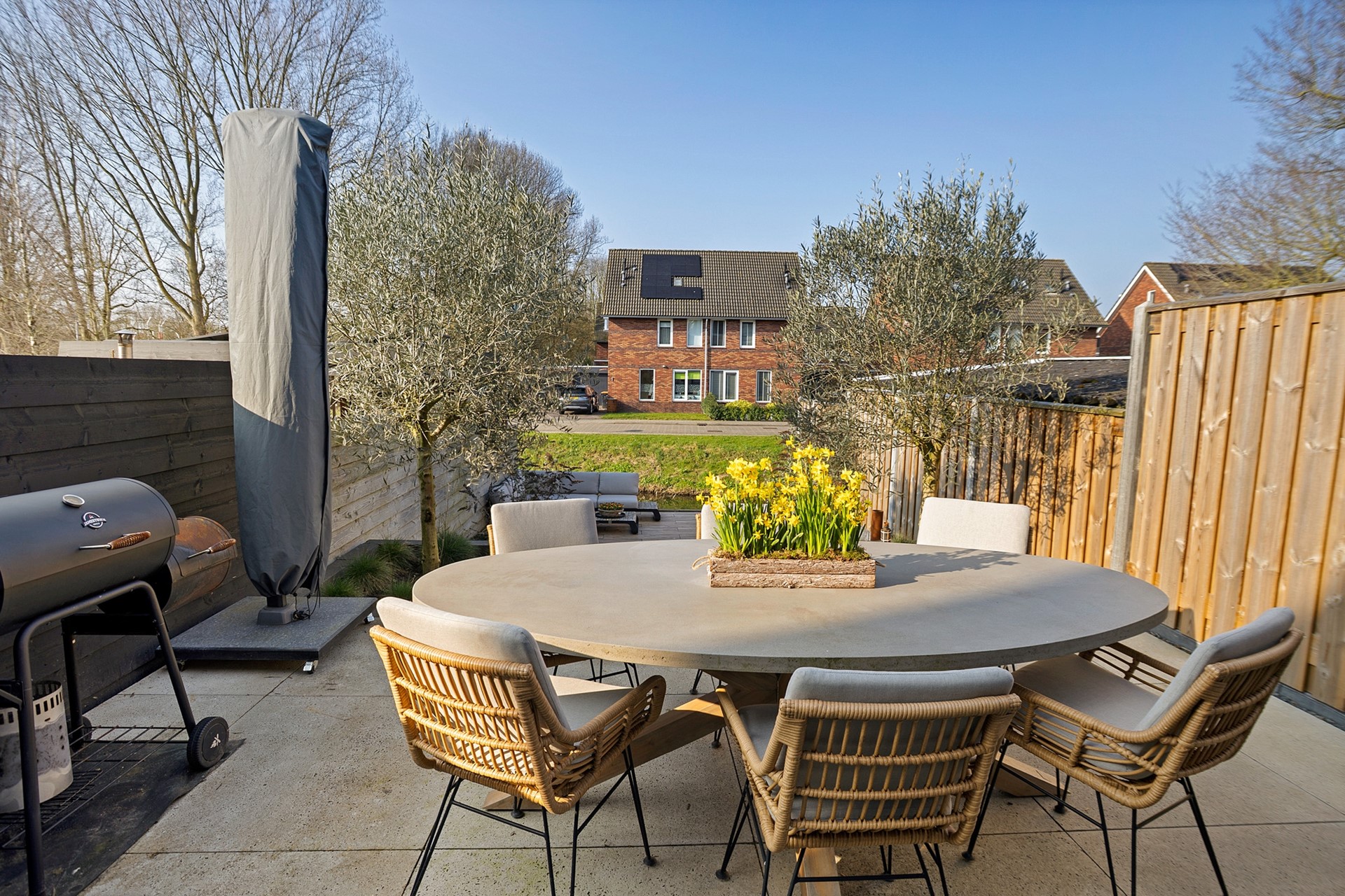 Ook de achtertuin is met veel zorg aangelegd. De tuin beschikt over meerdere terrassen zodat je altijd een fijne plek in de zon of juist in de schaduw kunt vinden. Helemaal achterin ligt een terras aan het water, een heerlijke plek om te ontspannen en te genieten van de rust. Dit terras ligt op grond van het hoogheemraadschap; deze grond wordt aangeboden ter overname of huur, afhankelijk van de wens van de nieuwe eigenaar.
