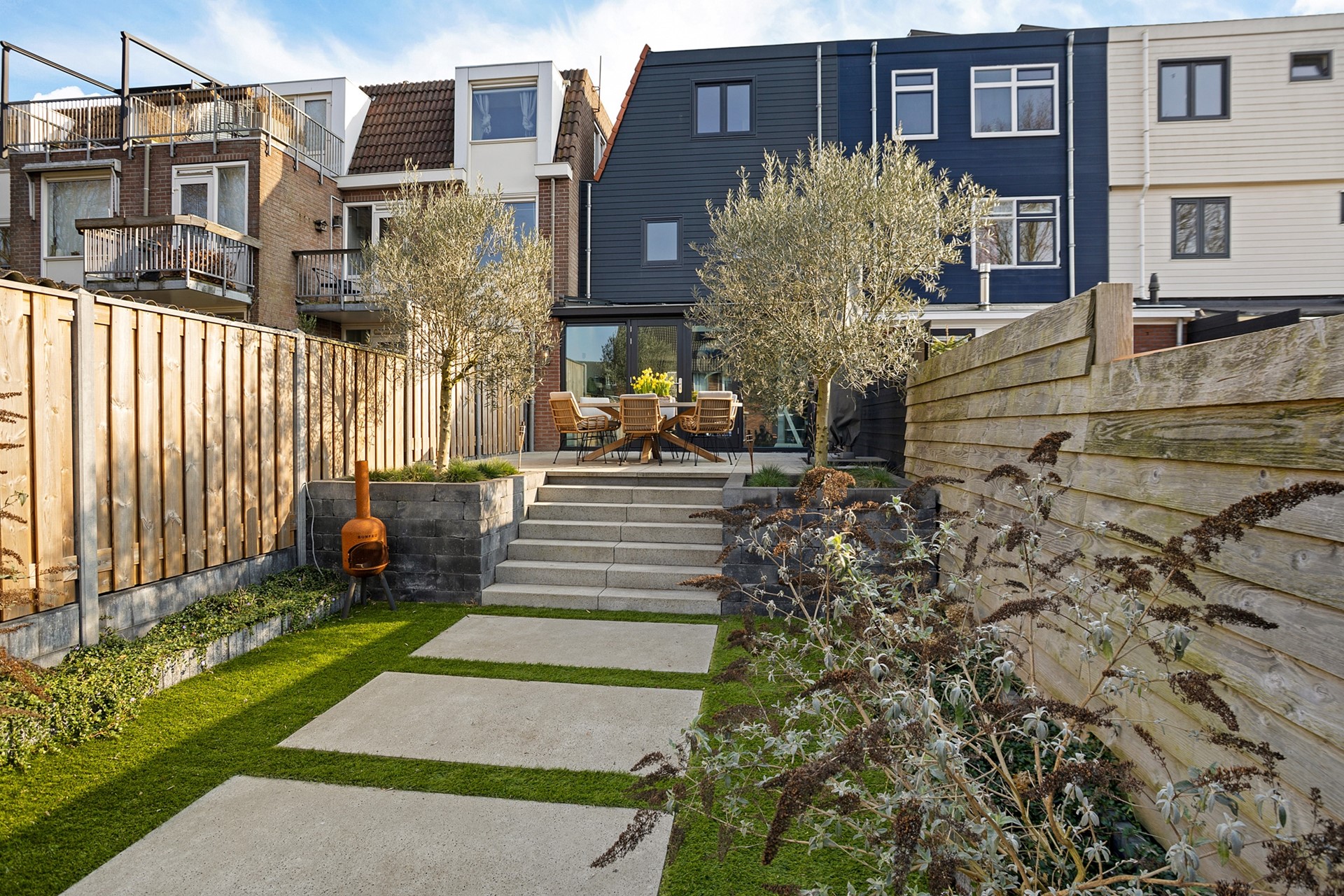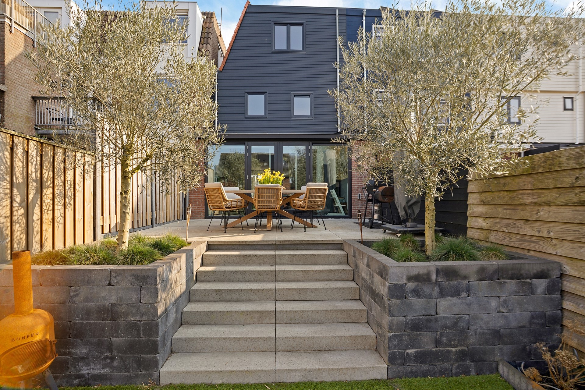 • Fraai aangelegde achtertuin met meerdere terrassen