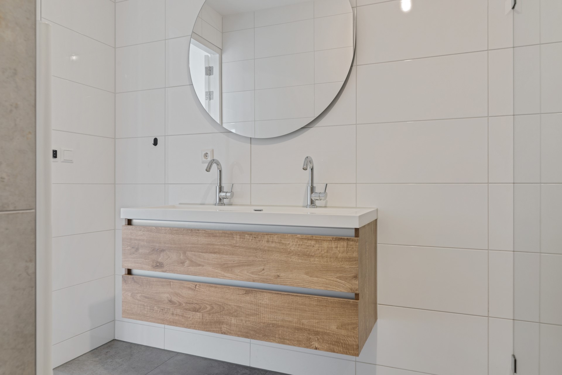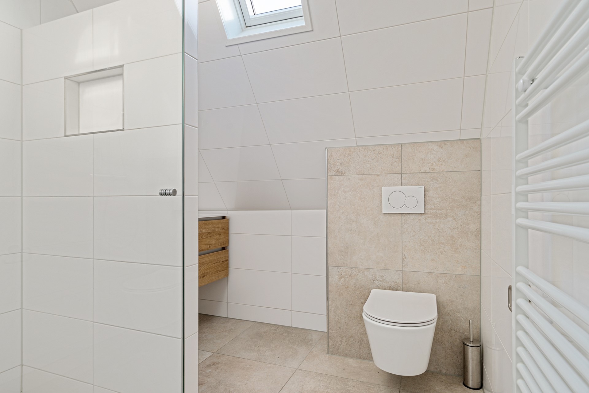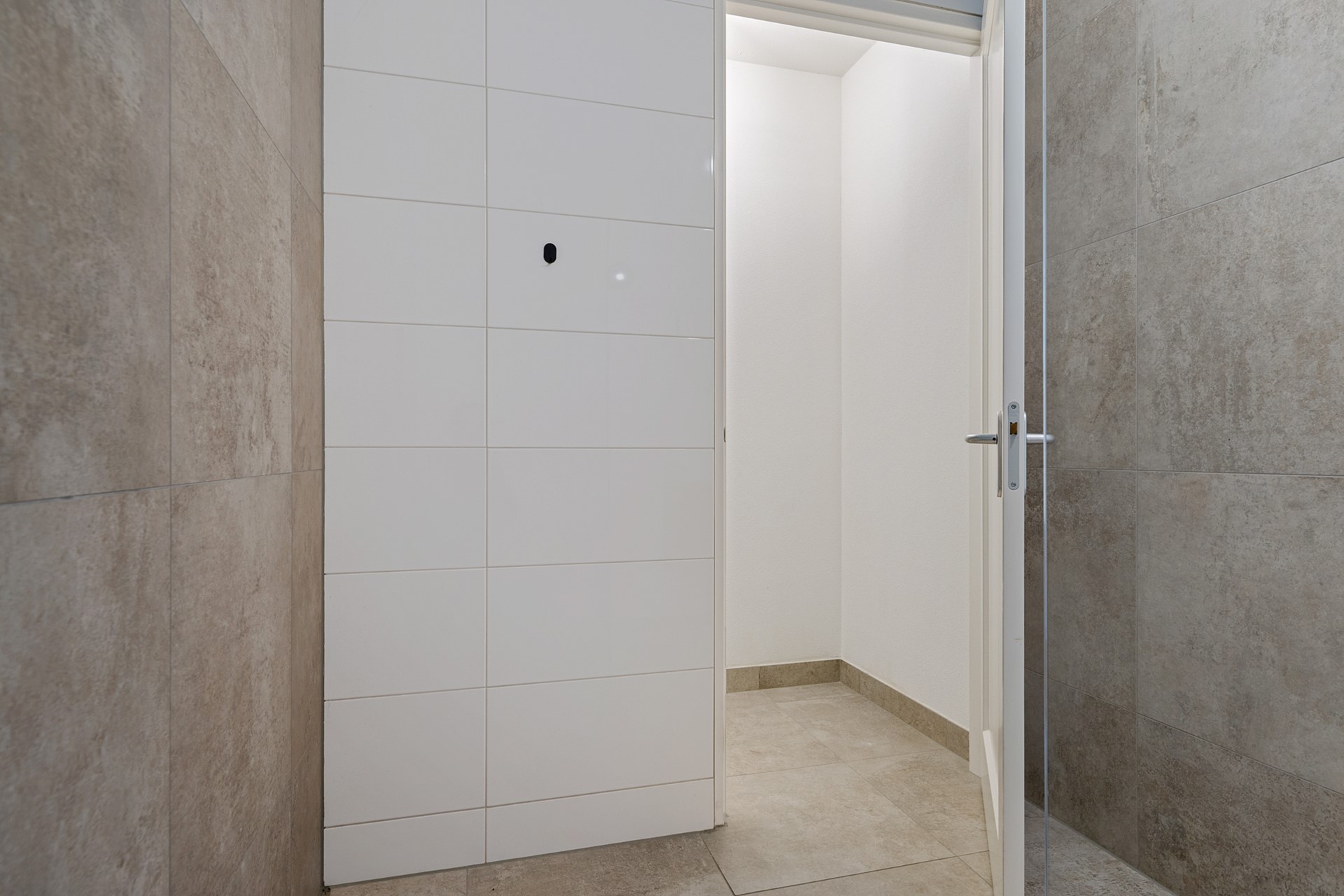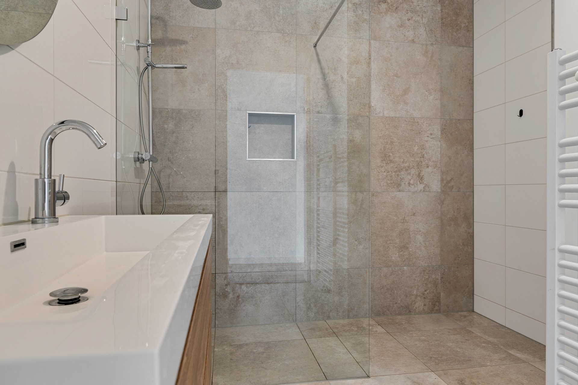 De hal geeft toegang tot de stijlvolle badkamer met inloopdouche en wastafelmeubel, een separaat toilet en een bergkast met aansluitingen voor wasmachine en droger.
