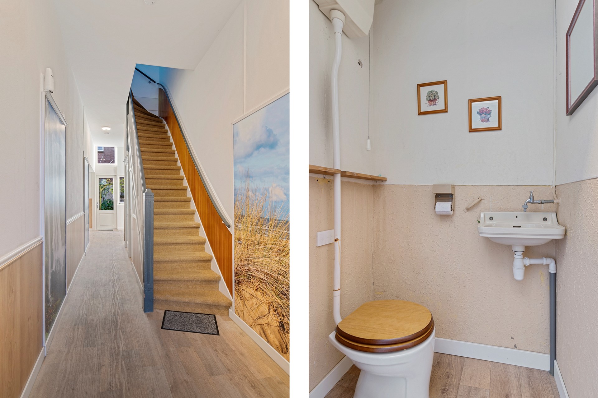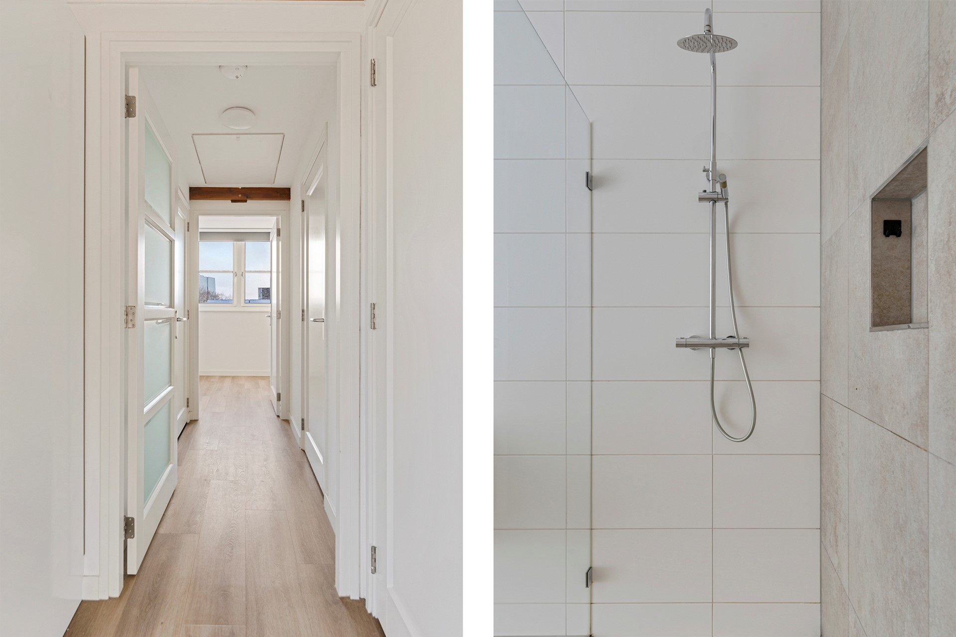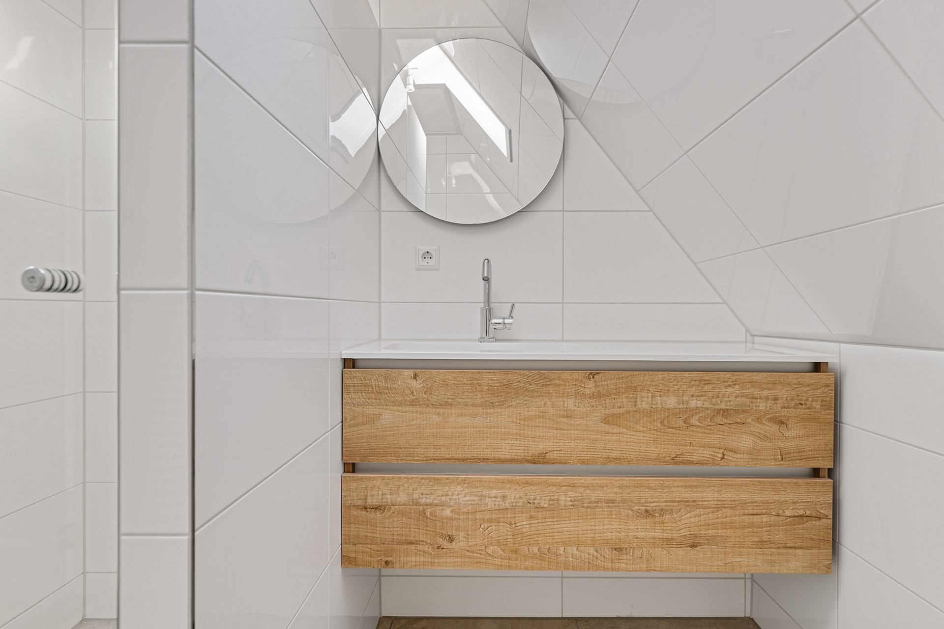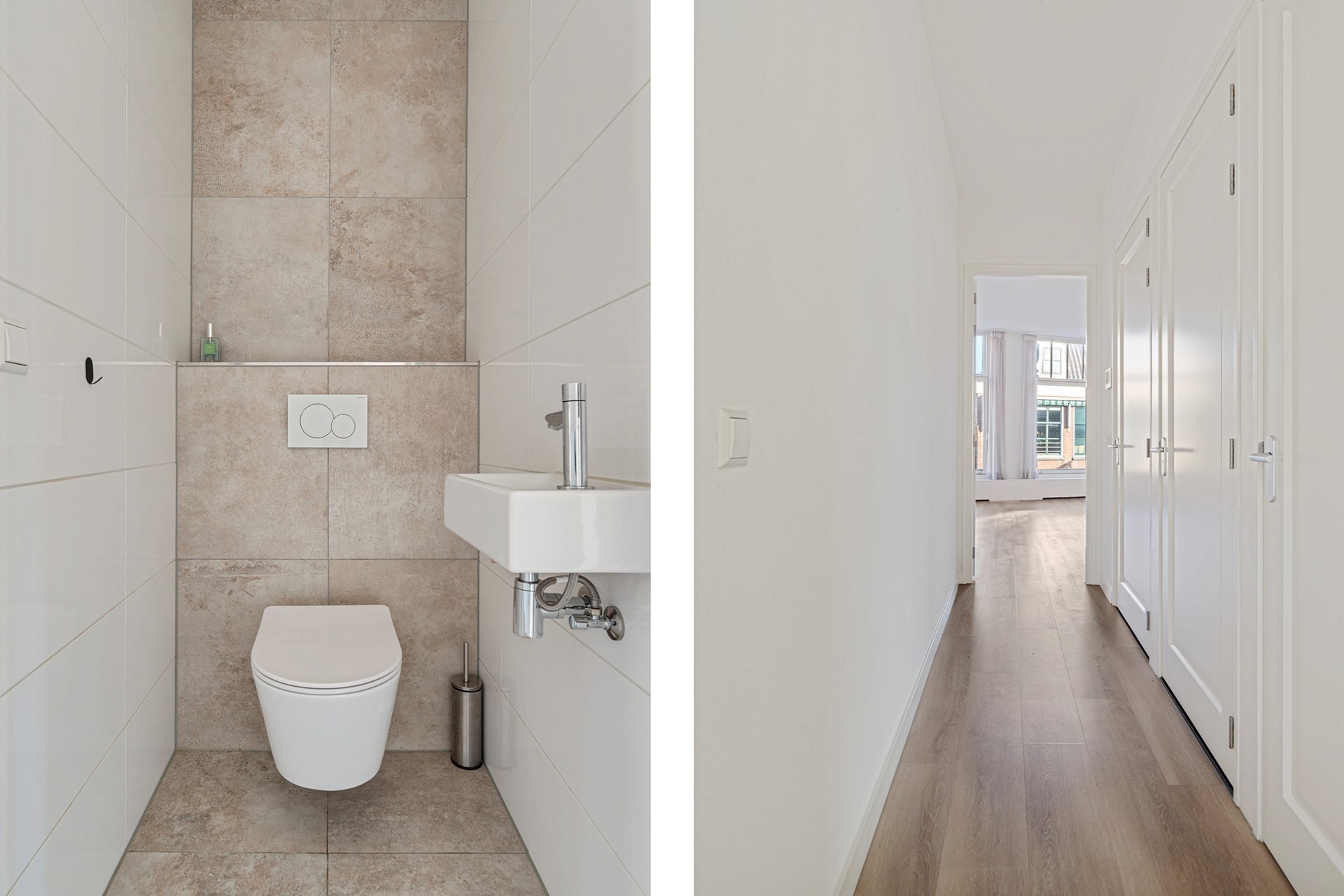 De hal geeft toegang tot de stijlvolle badkamer met inloopdouche en wastafelmeubel, een separaat toilet en een bergkast met aansluitingen voor wasmachine en droger.