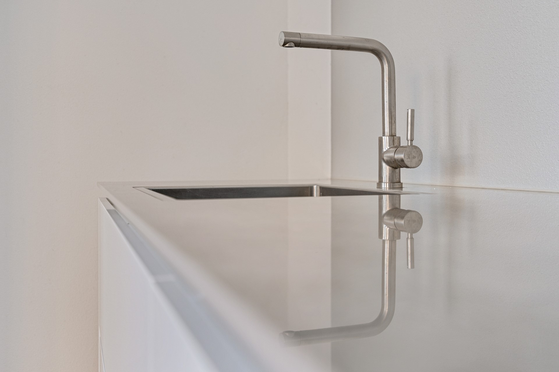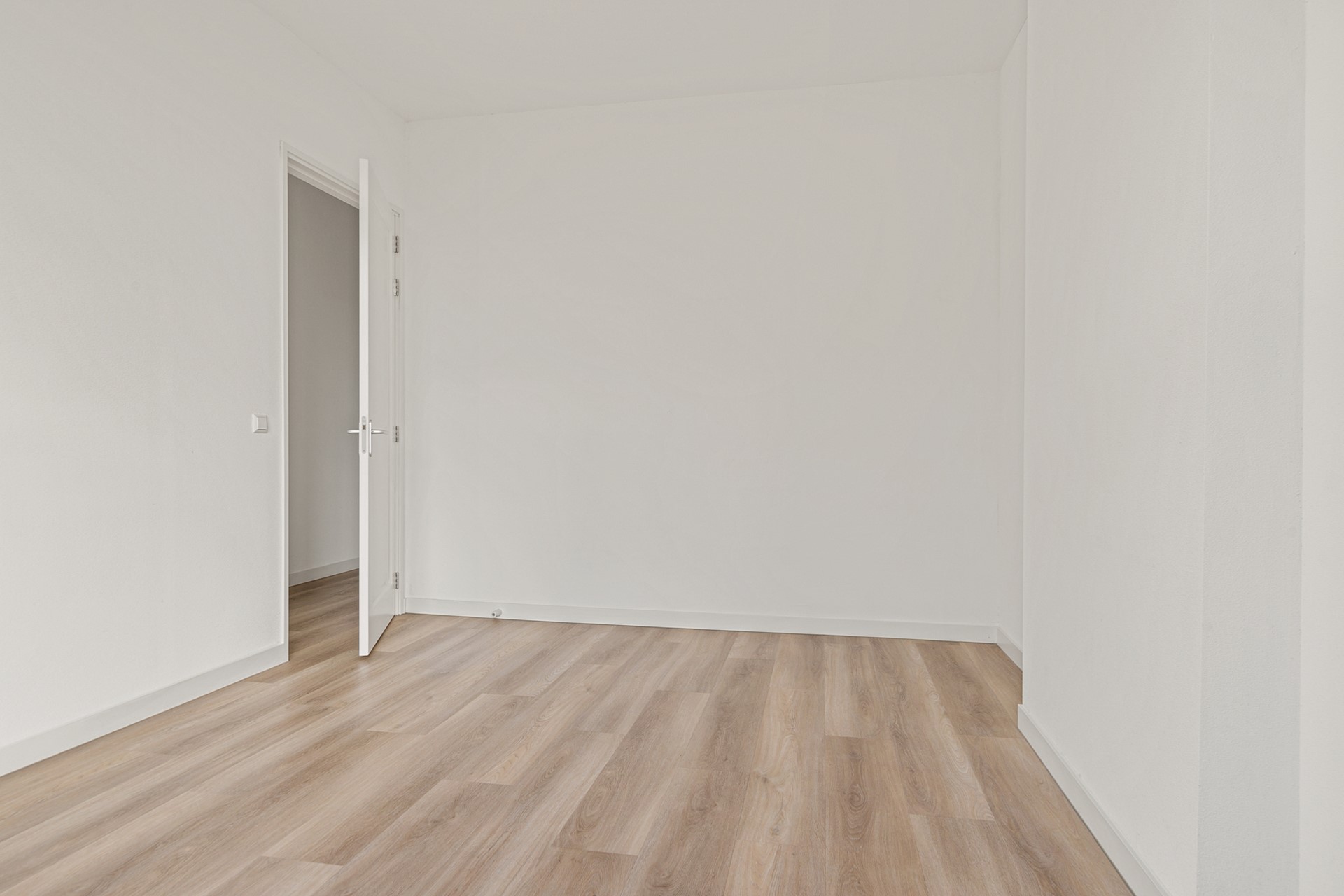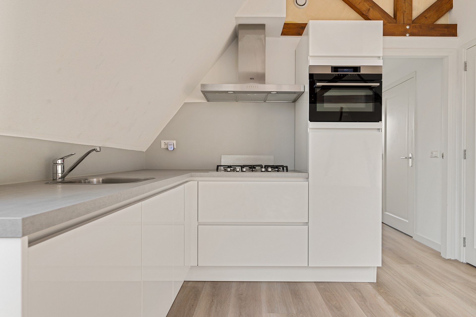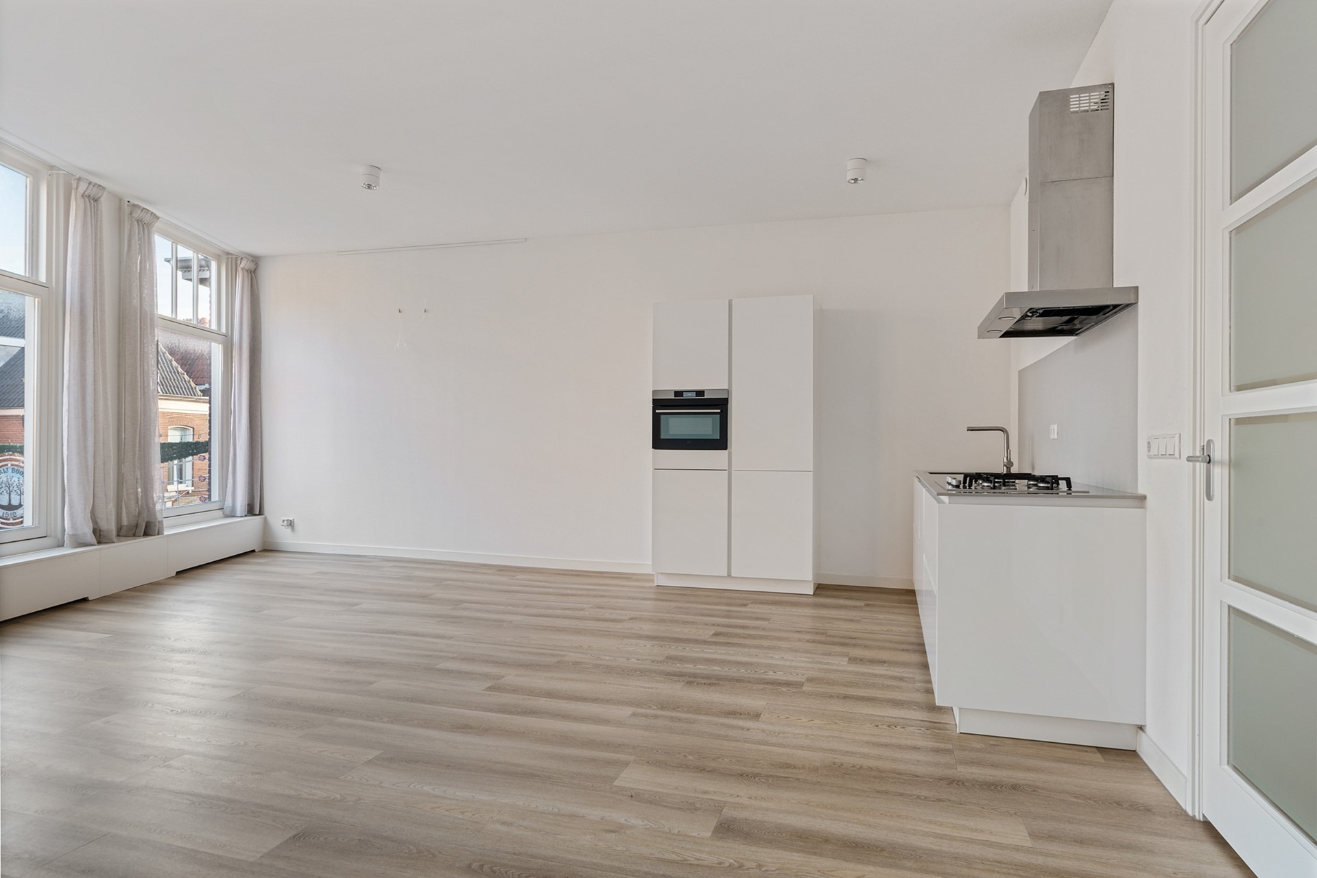 Het eerste appartement is met zorg en oog voor detail vernieuwd. Aan de voorzijde bevindt zich de lichte woonkamer met moderne, volledig uitgeruste keuken.