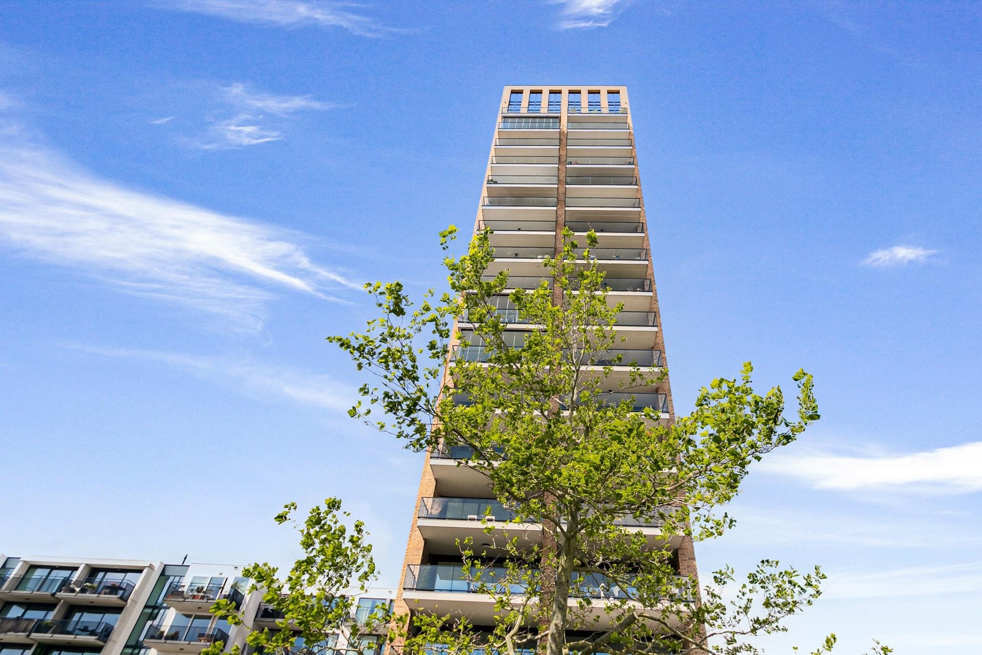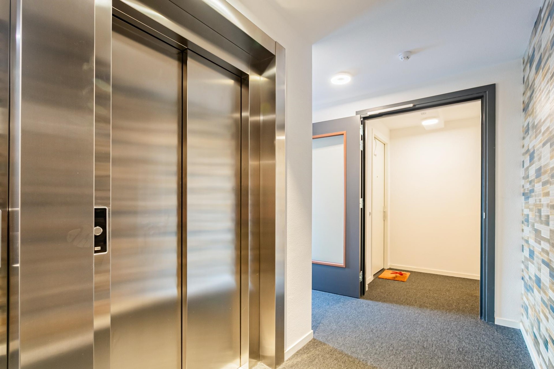 De luxe centrale entree mét huismeester onderstreept het hoogwaardige karakter van het complex. Hier bevinden zich de brievenbussen en neem je één van de twee liften naar de verdiepingen.