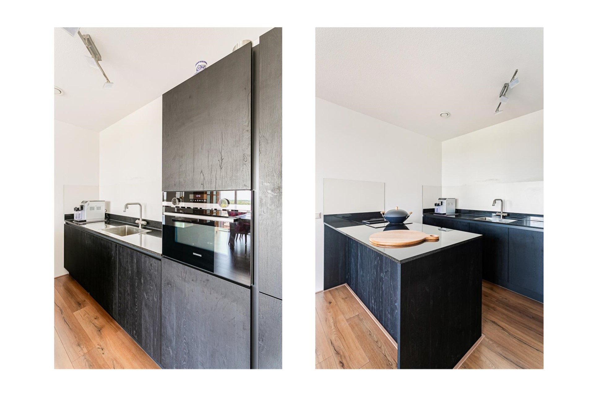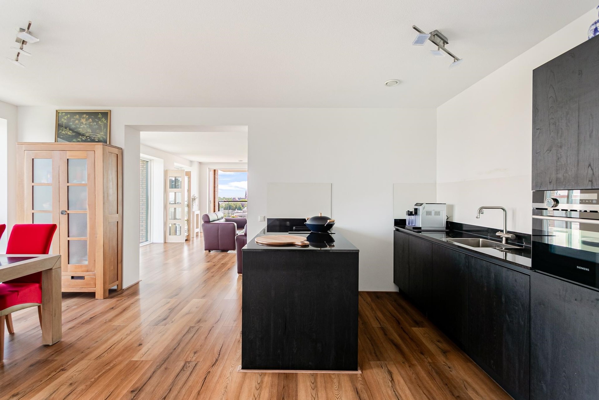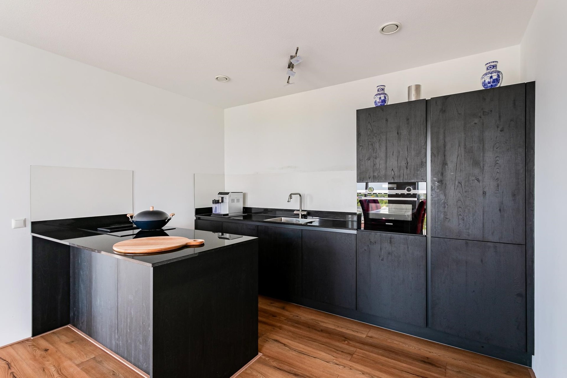 De woonkeuken is uitgevoerd met een kastenwand en een schiereiland en voorzien van diverse inbouwapparatuur, waaronder: een inductiekookplaat met geïntegreerde afzuiging, combi-oven, kokendwaterkraan, vaatwasser en koel-/vriescombinatie.