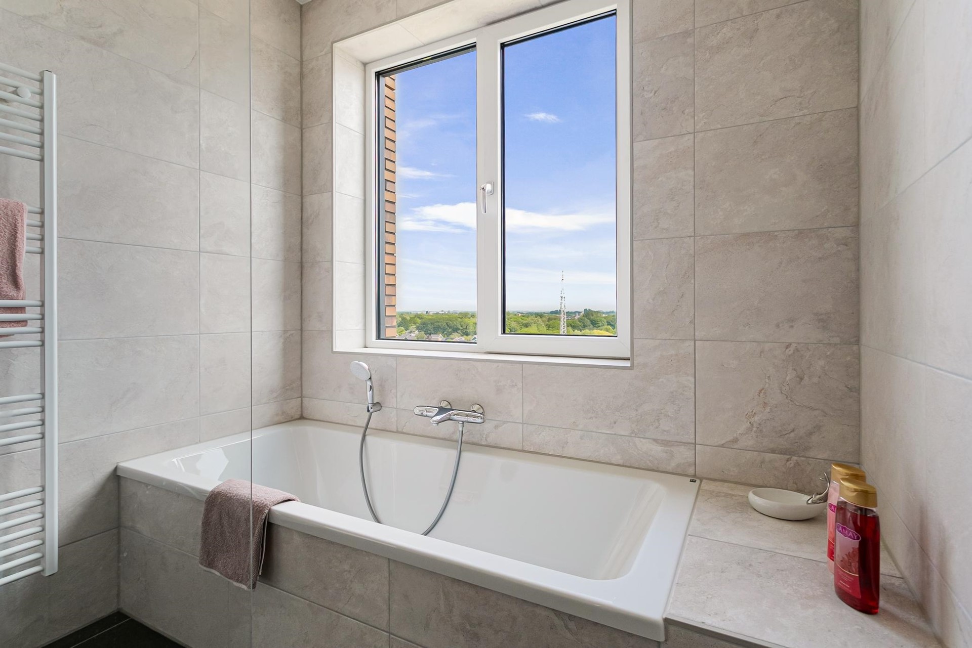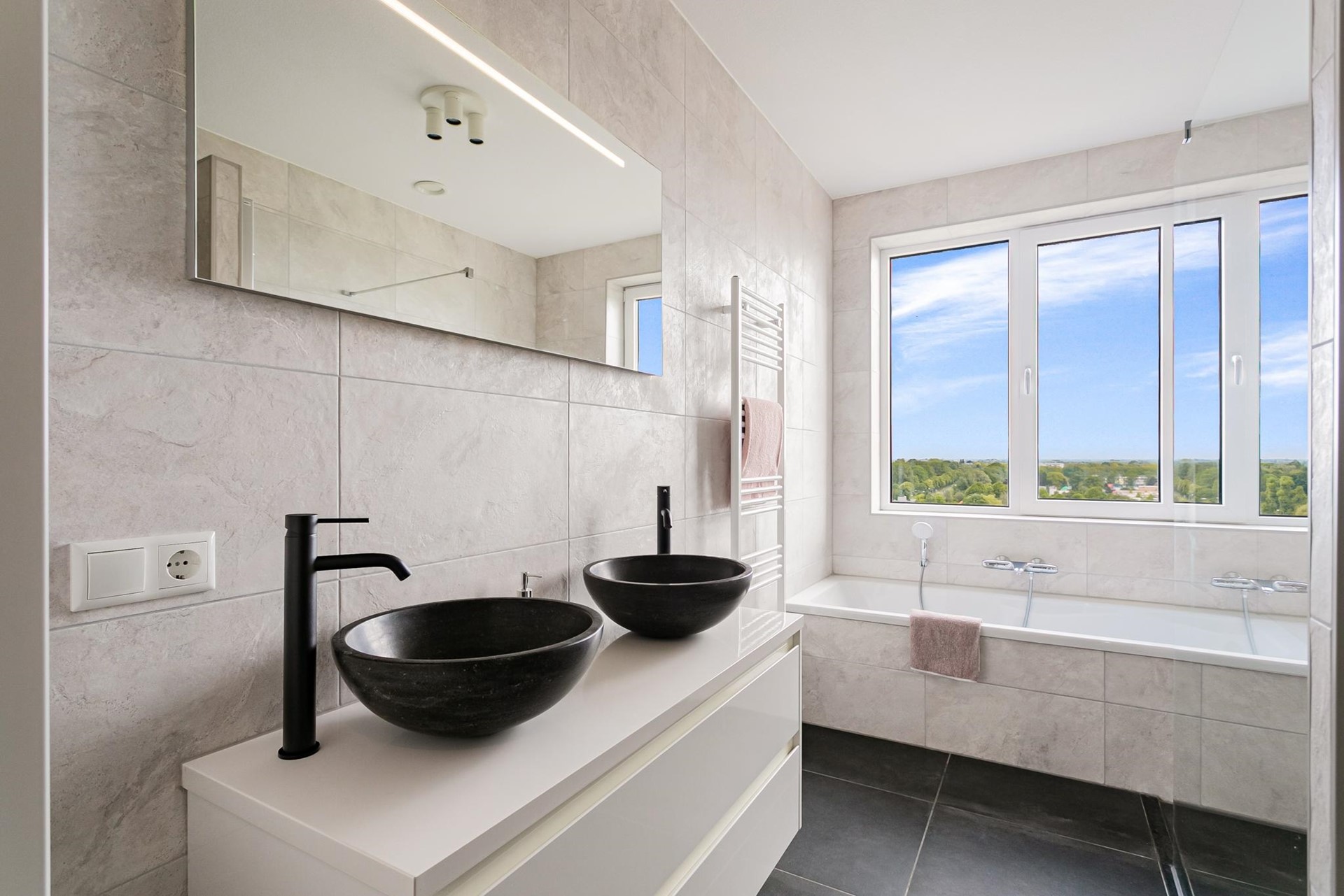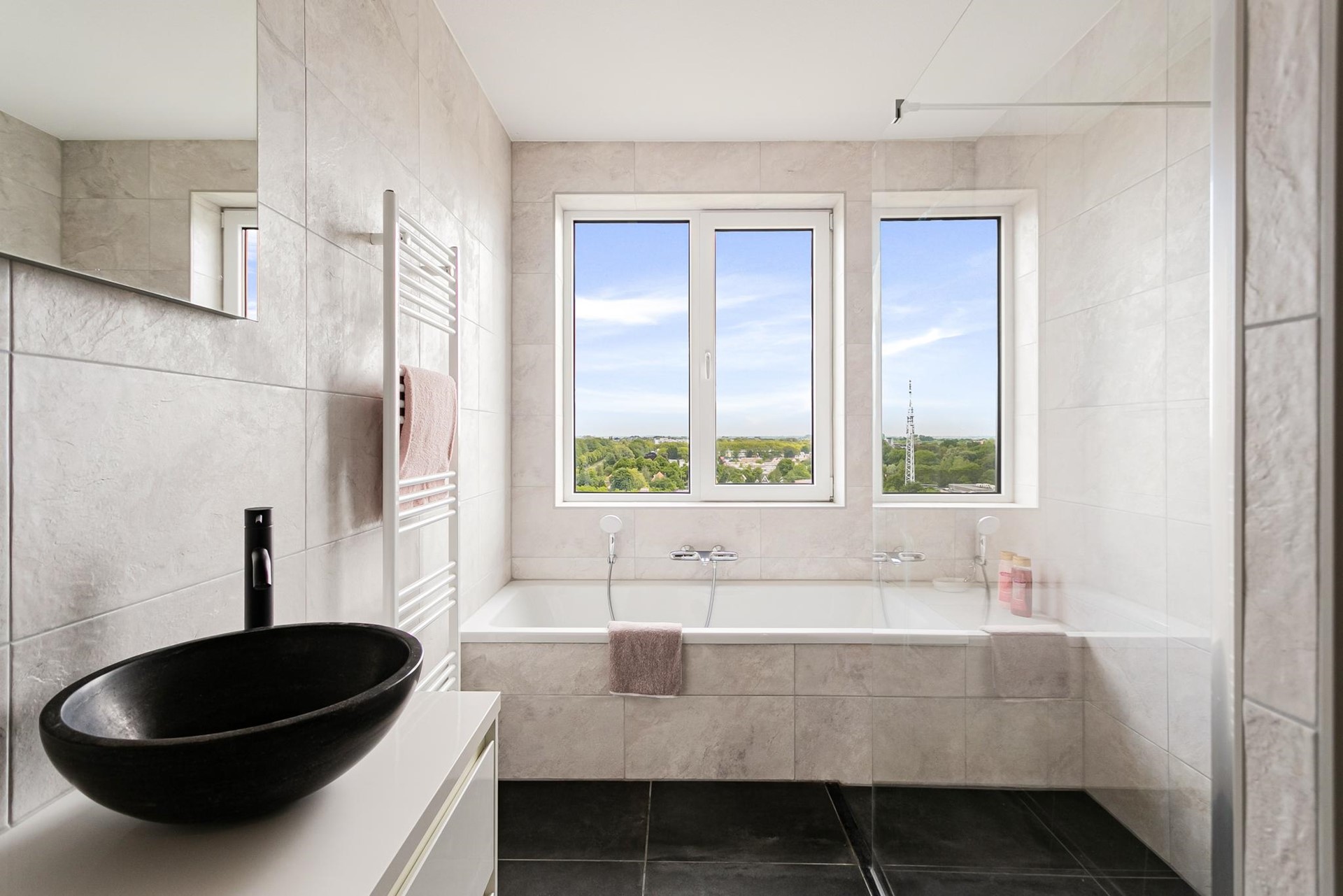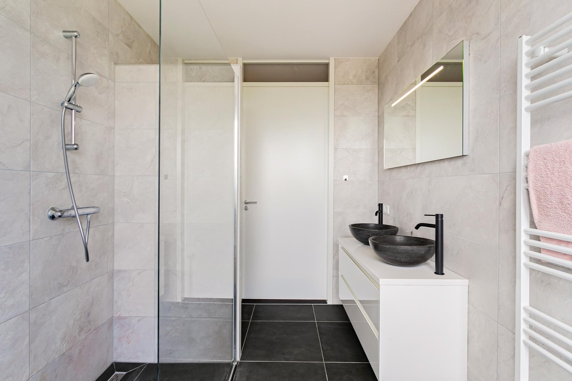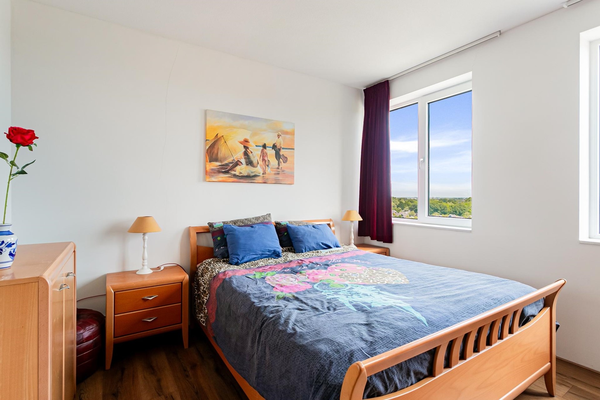Het appartement beschikt over twee goed bemeten slaapkamers. De nette badkamer is ingericht met een ligbad, inloopdouche en dubbele wastafel met meubel. Daarnaast is er een praktische inpandige berging met aansluiting voor wasmachine en/of droger. De woning is vrijwel geheel voorzien van een moderne, stijlvolle vloer met vloerverwarming en -koeling.
