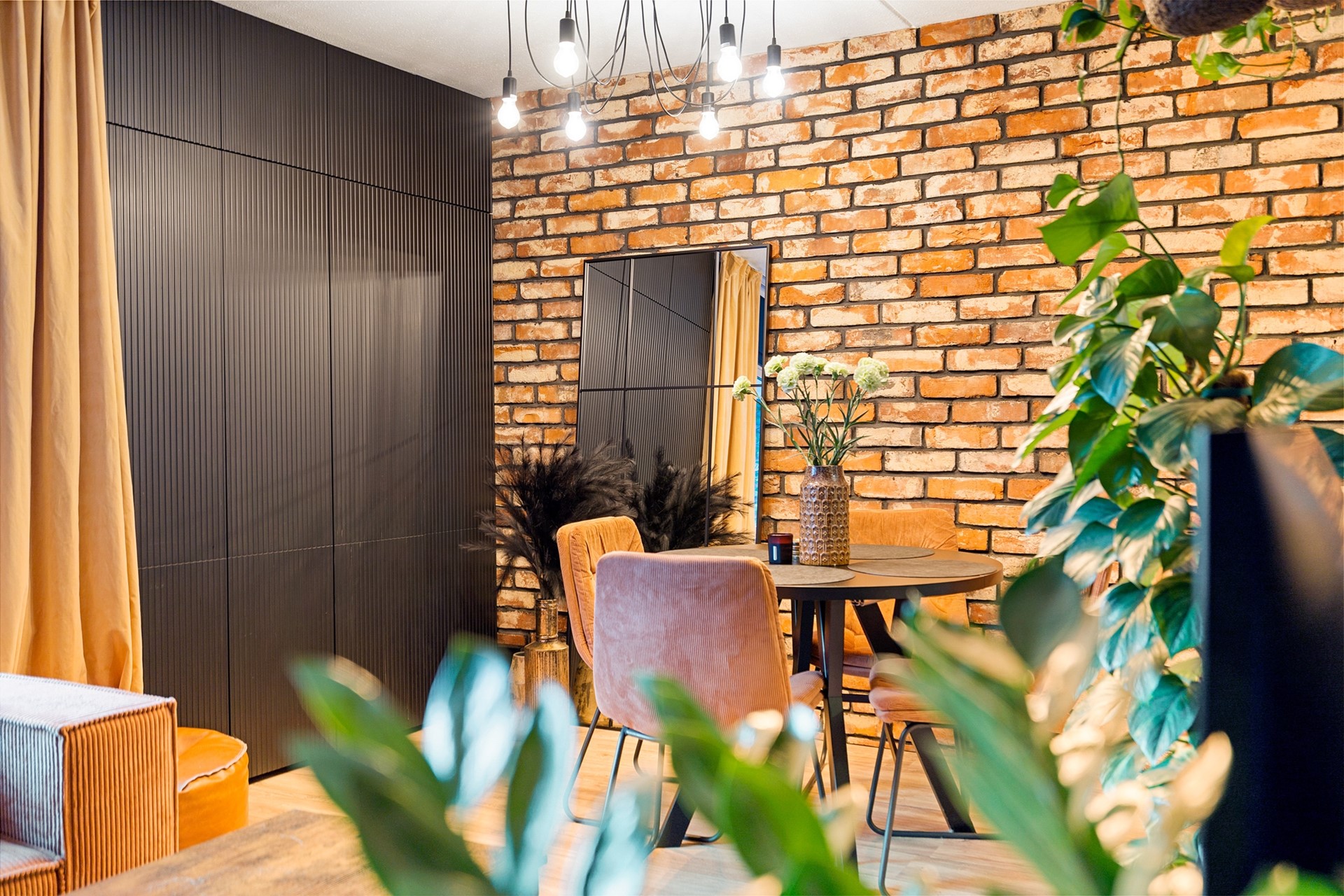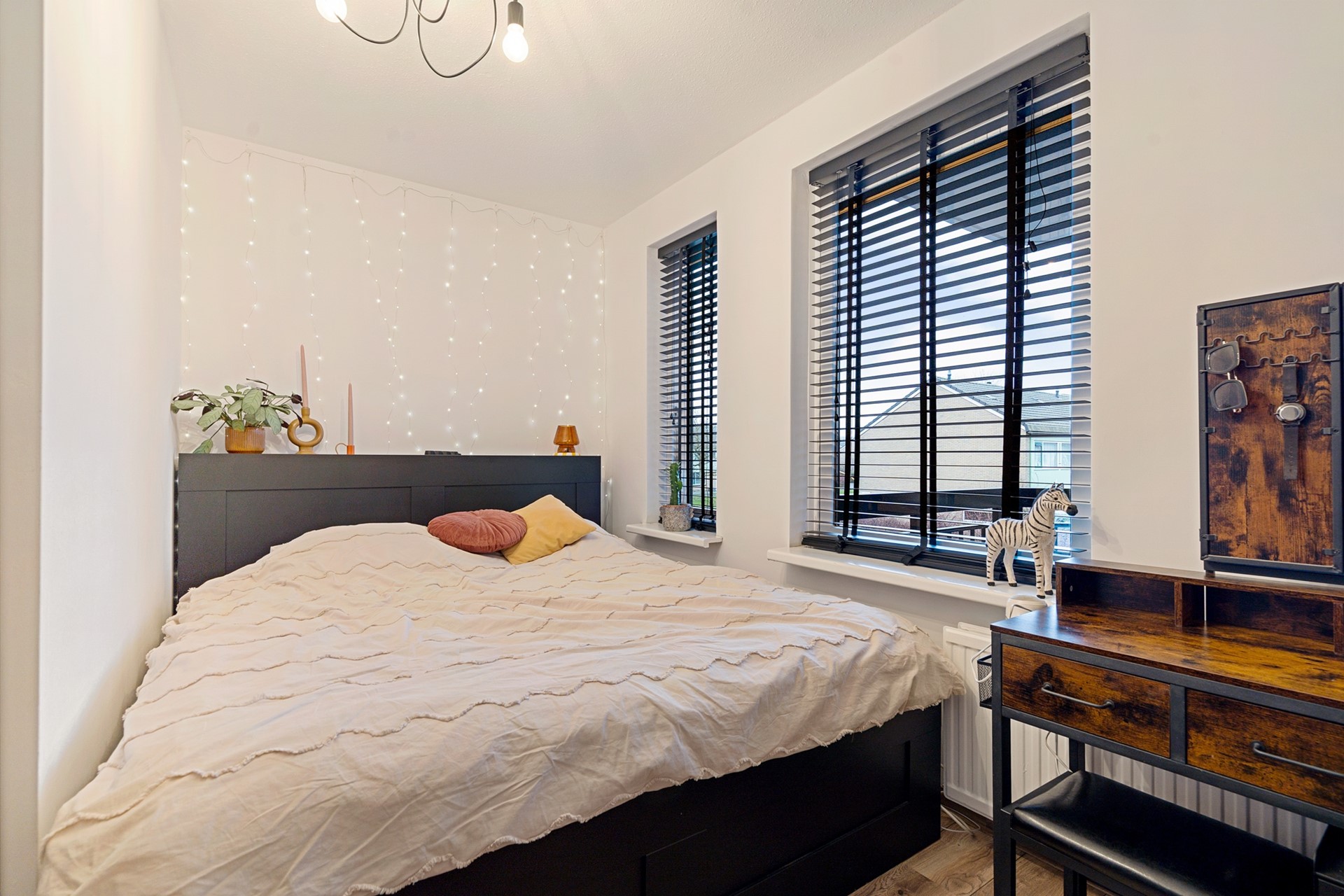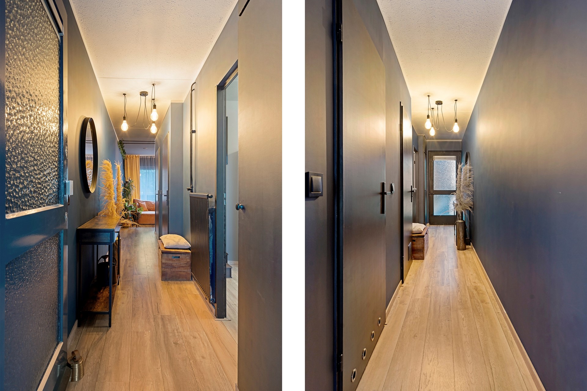 Via het open portiek bereik je het appartement. Je stapt binnen in de netjes afgewerkte hal, die direct de toon zet: warme kleuren, mooie materialen – hier is duidelijk met gevoel voor stijl gewoond. Aan de voorzijde bevindt zich de slaapkamer. Compact maar verrassend praktisch in te delen, met ruimte voor een tweepersoonsbed en kastruimte.