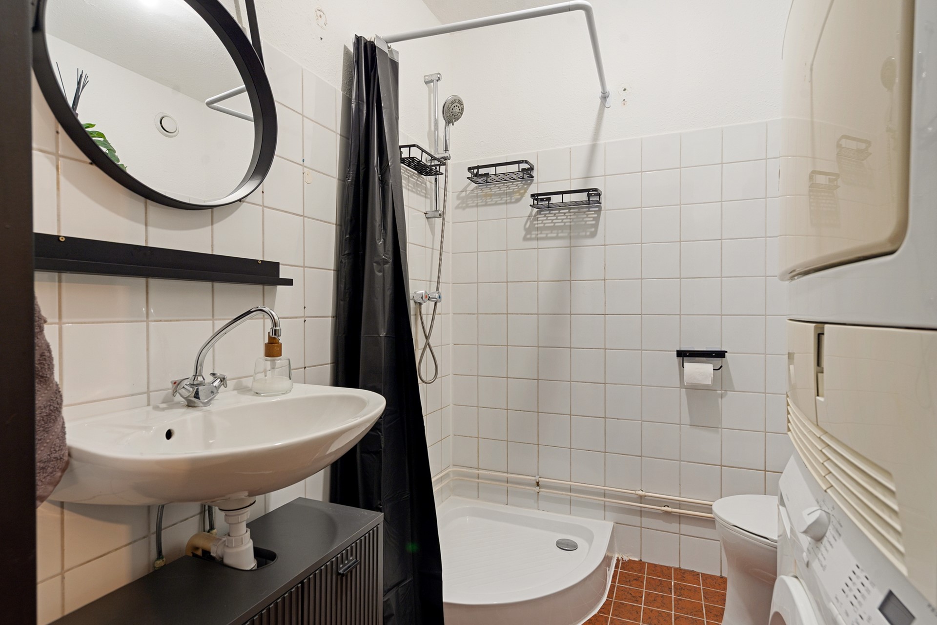 De badkamer is functioneel uitgevoerd en voorzien van een douchehoek, toilet en wastafelmeubel. Precies wat je nodig hebt, zonder poespas, maar wel netjes verzorgd.