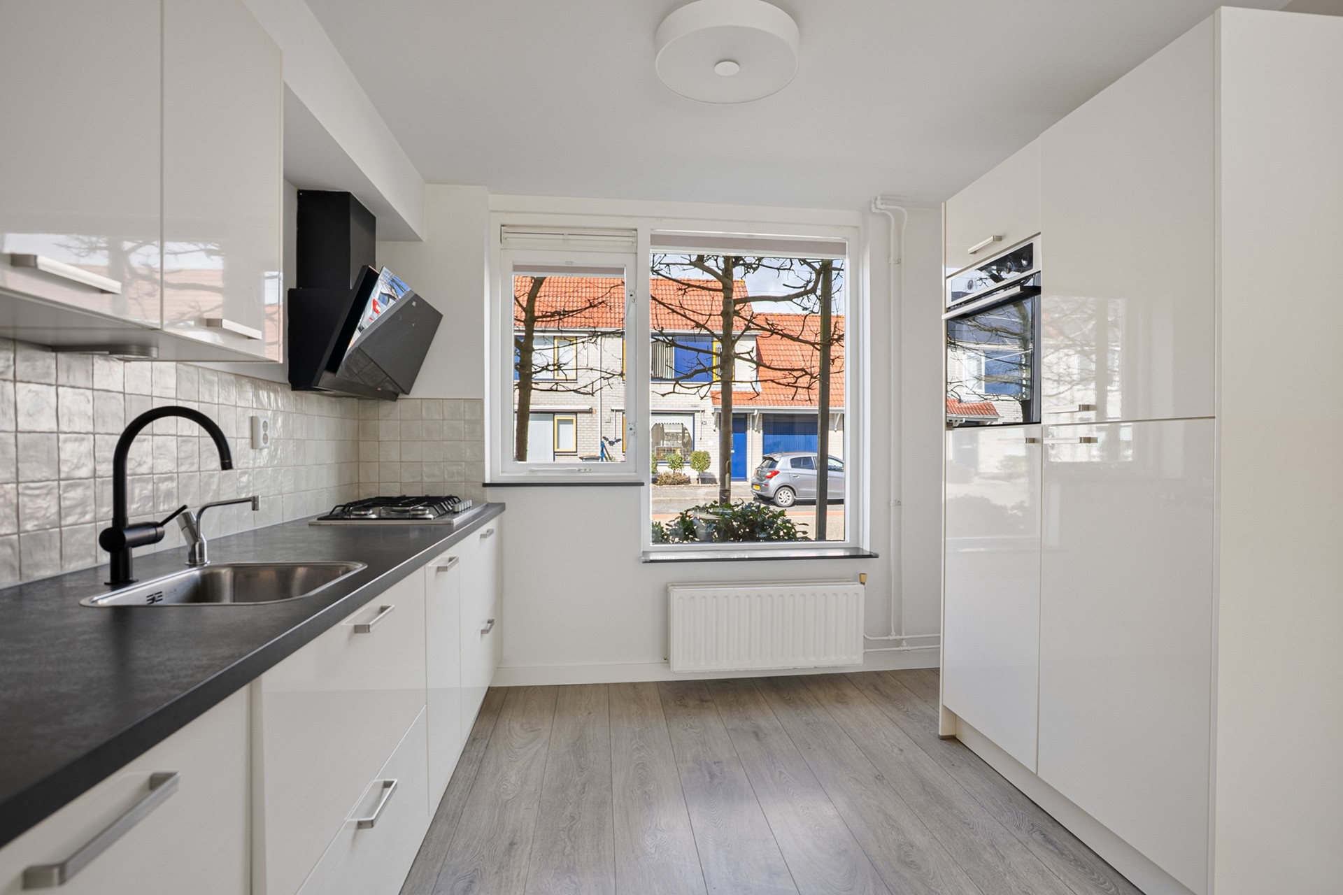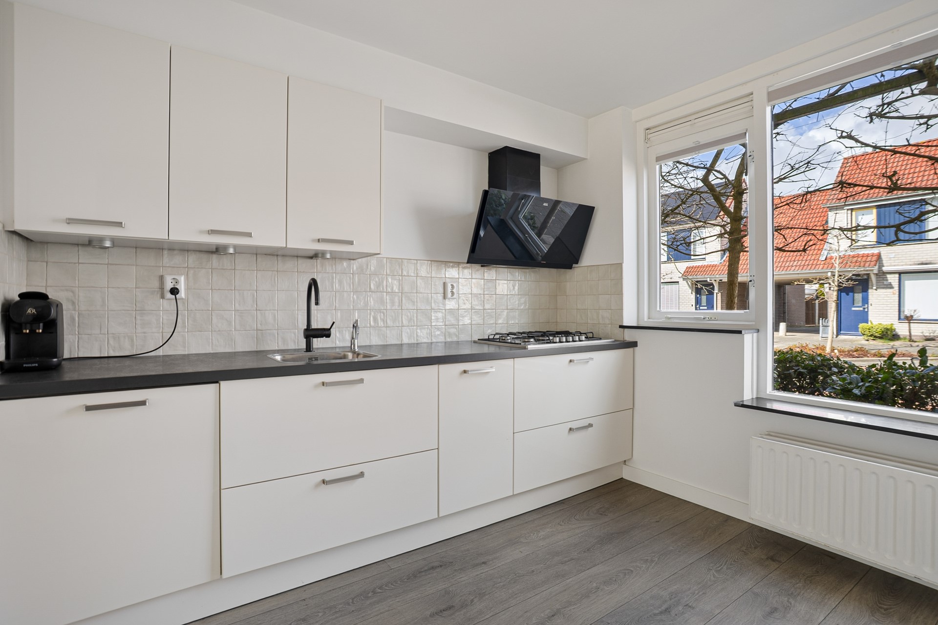 Aan de voorzijde de straatgerichte keuken, compleet uitgevoerd met alle benodigde inbouwapparatuur. Gewoon een goede, functionele keuken waar alles klopt.