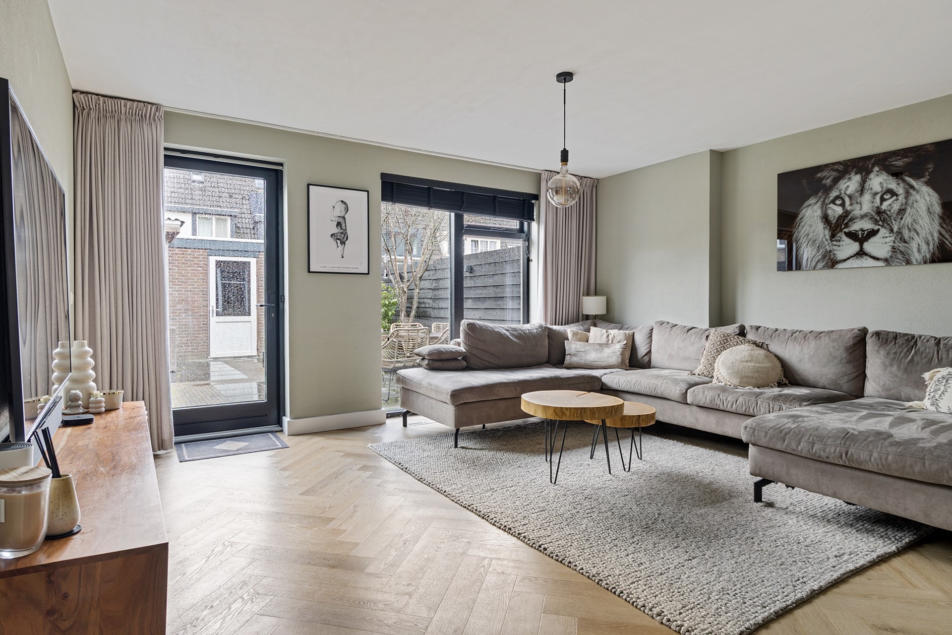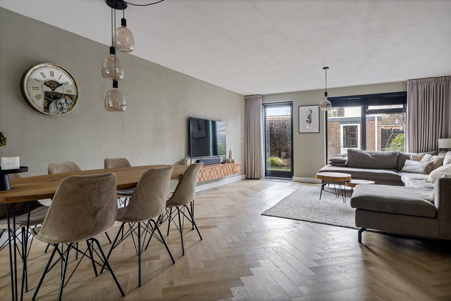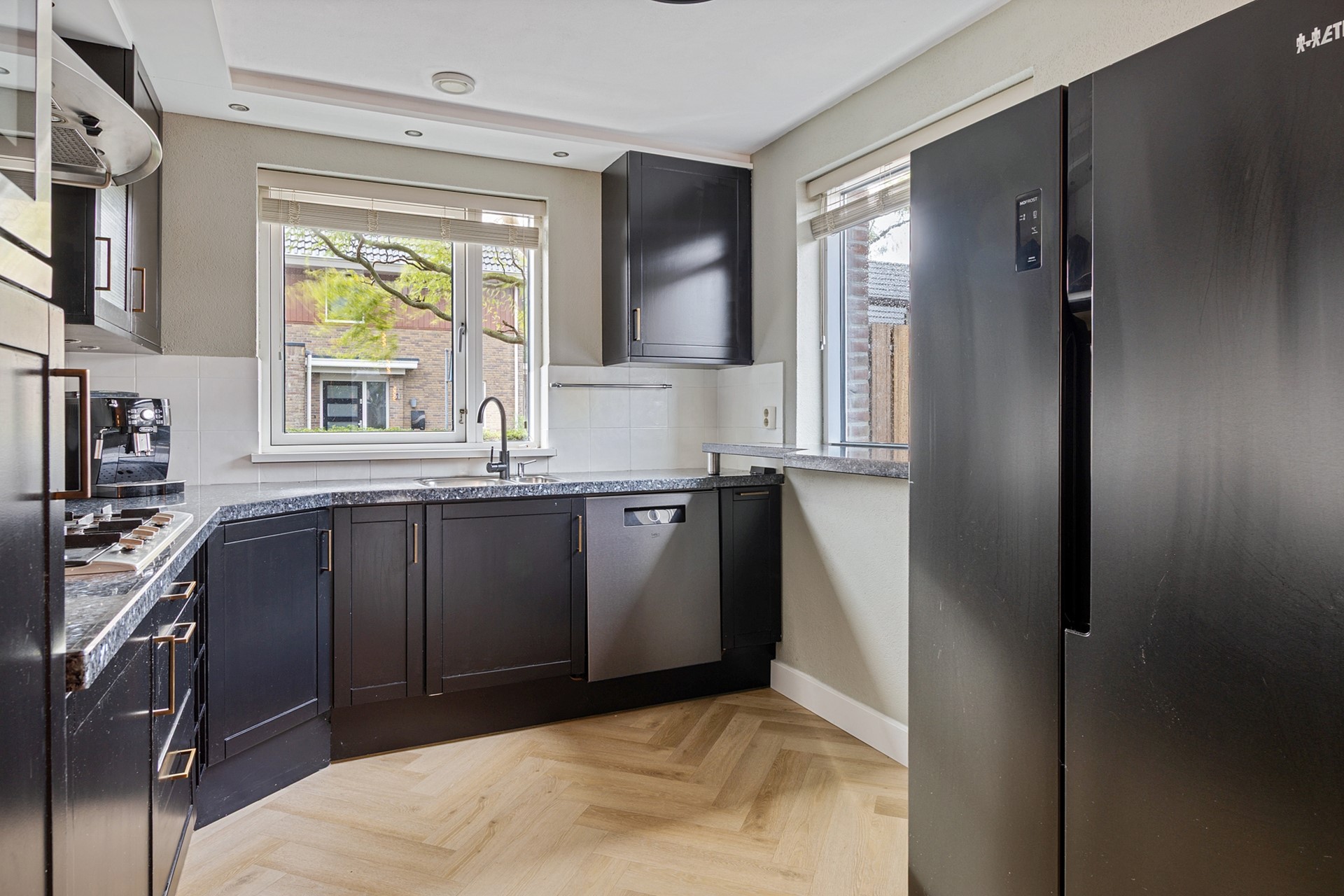 Via de entree bereik je de uitgebouwde woonkamer, die dankzij de extra ruimte aan de voorzijde heerlijk licht en ruim aanvoelt. De gehele begane grond is voorzien van een stijlvolle PVC vloer in visgraatmotief, wat zorgt voor een moderne uitstraling. De nette keuken aan de voorzijde is uitgerust met diverse inbouwapparatuur zoals een combi-oven, vaatwasser en gaskookplaat.