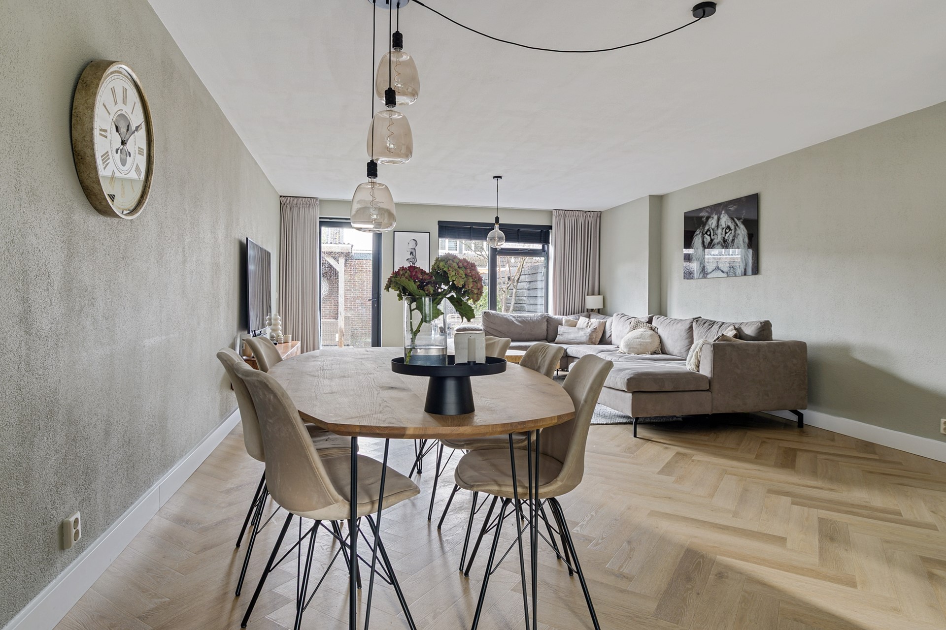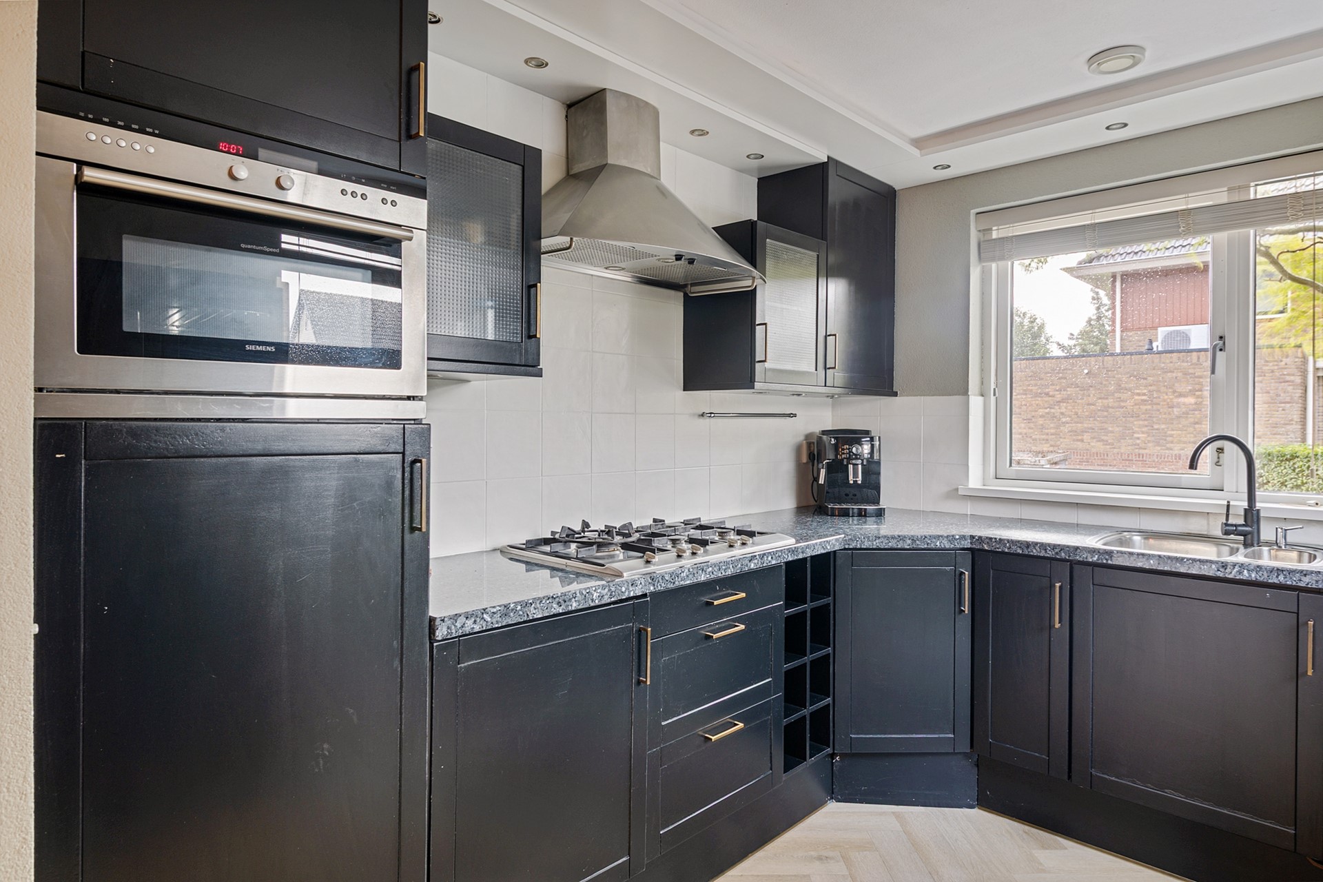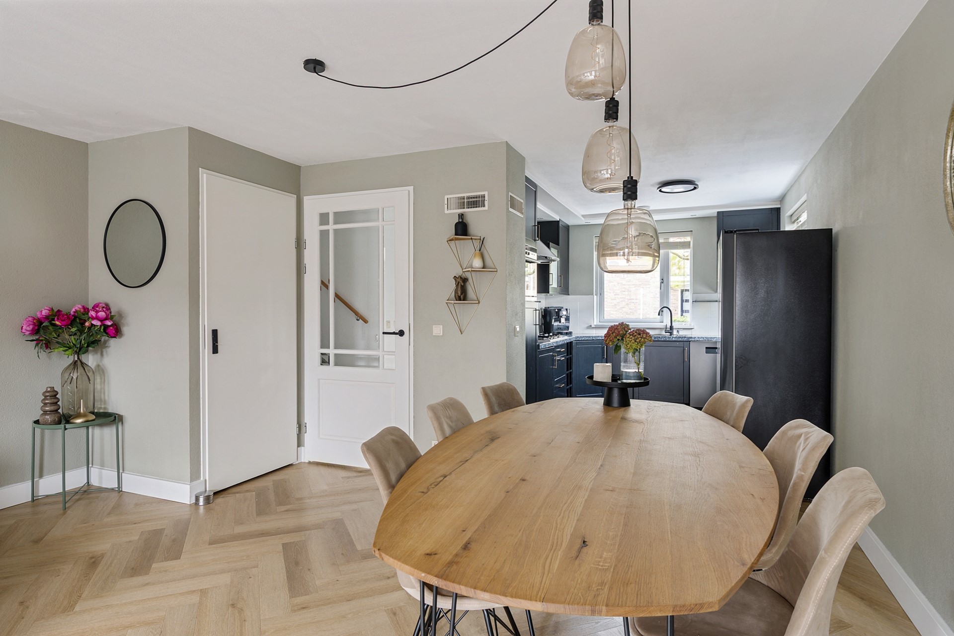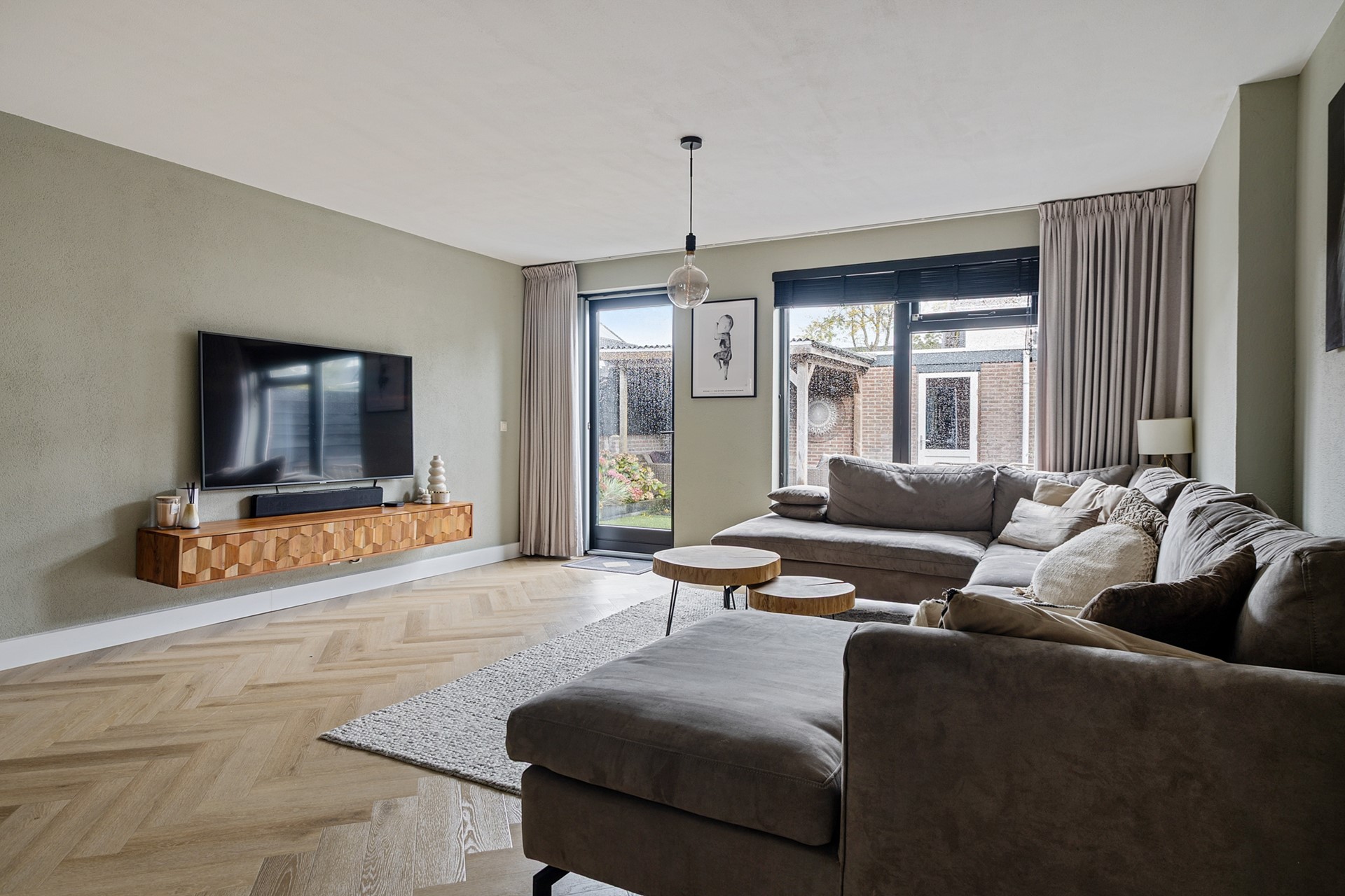 Via de entree bereik je de uitgebouwde woonkamer, die dankzij de extra ruimte aan de voorzijde heerlijk licht en ruim aanvoelt. De gehele begane grond is voorzien van een stijlvolle PVC vloer in visgraatmotief, wat zorgt voor een moderne uitstraling. De nette keuken aan de voorzijde is uitgerust met diverse inbouwapparatuur zoals een combi-oven, vaatwasser en gaskookplaat.