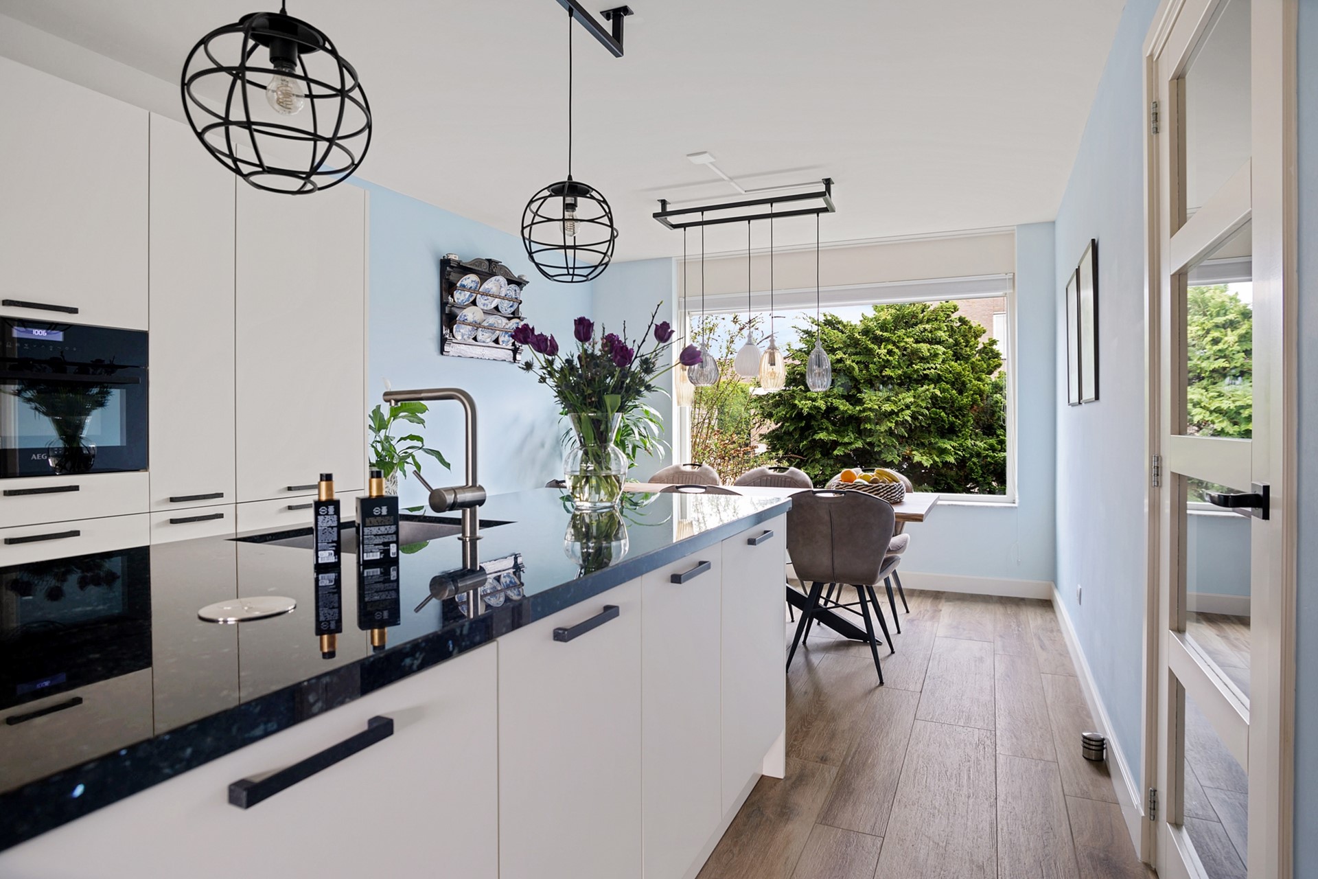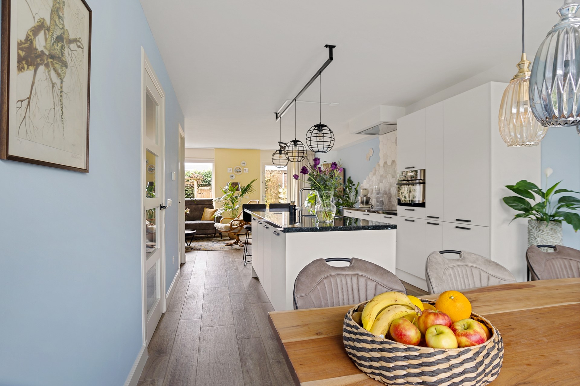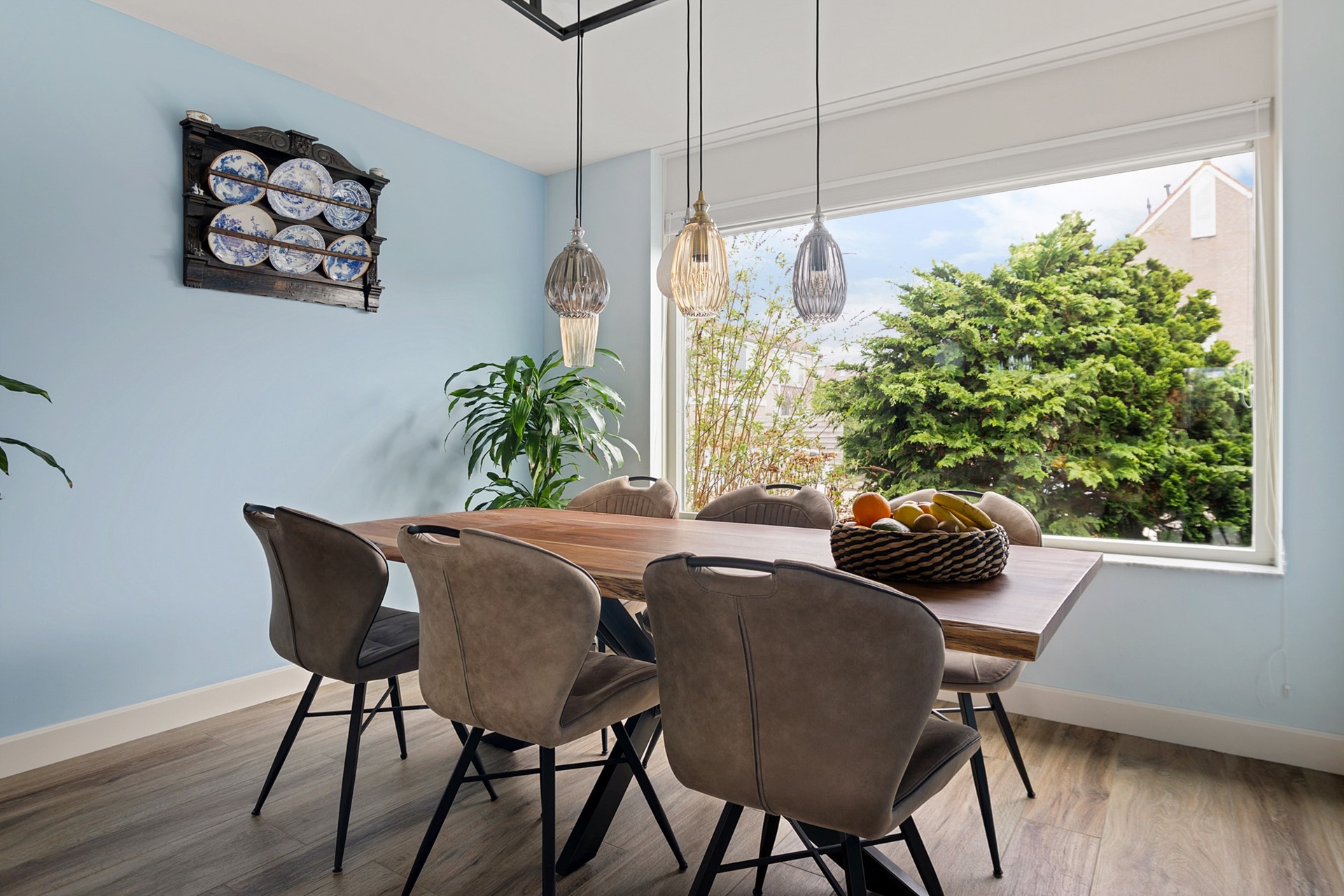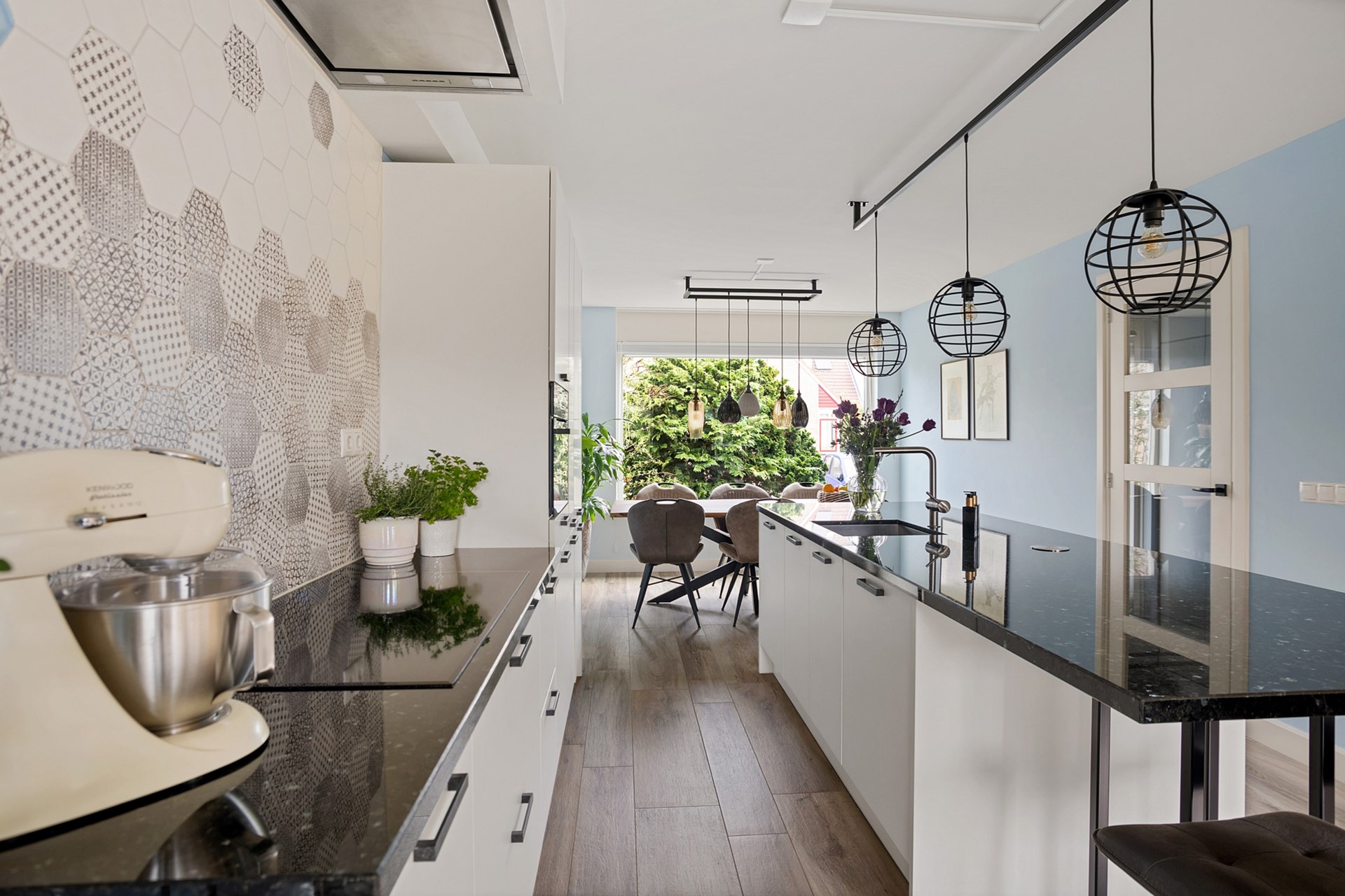 Aan de voorzijde van de woning bevindt zich de straatgerichte eetkamer, een heerlijke plek voor diners of gezellige avonden met vrienden en familie. De eetkamer staat in open verbinding met de super deluxe keuken, die is voorzien van diverse inbouwapparatuur waaronder een inductiekookplaat, vaatwasser, koel-vriescombinatie en een combi-oven. De keuken biedt veel werk- en bergruimte en vormt het hart van de woning.
