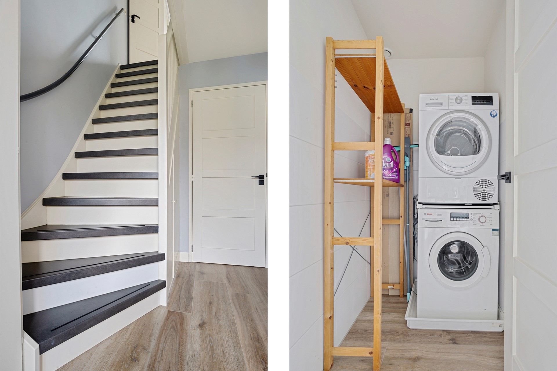 Aansluitend aan de keuken bevindt zich een praktische bijkeuken met de opstelplaats voor de wasmachine en droger.