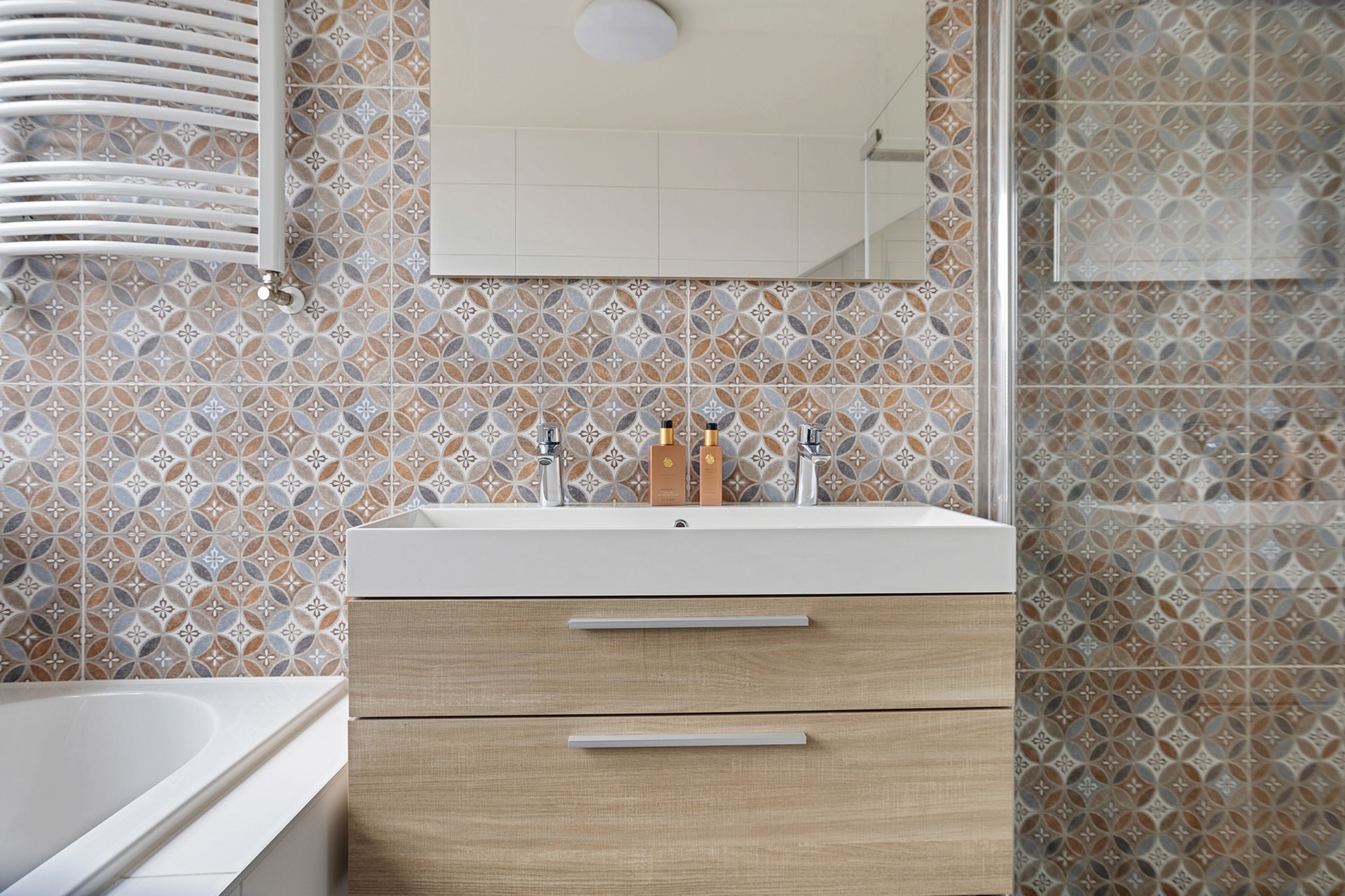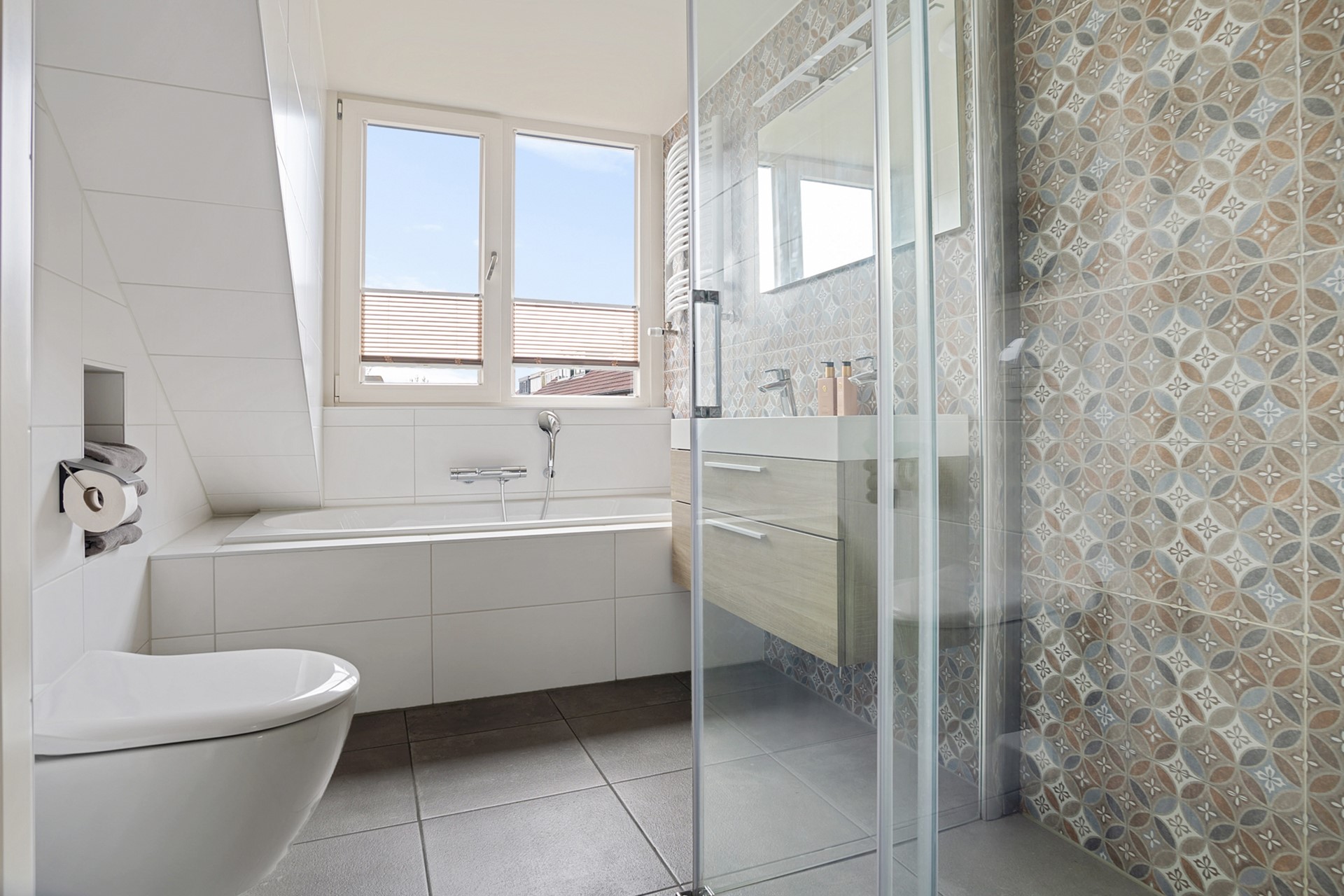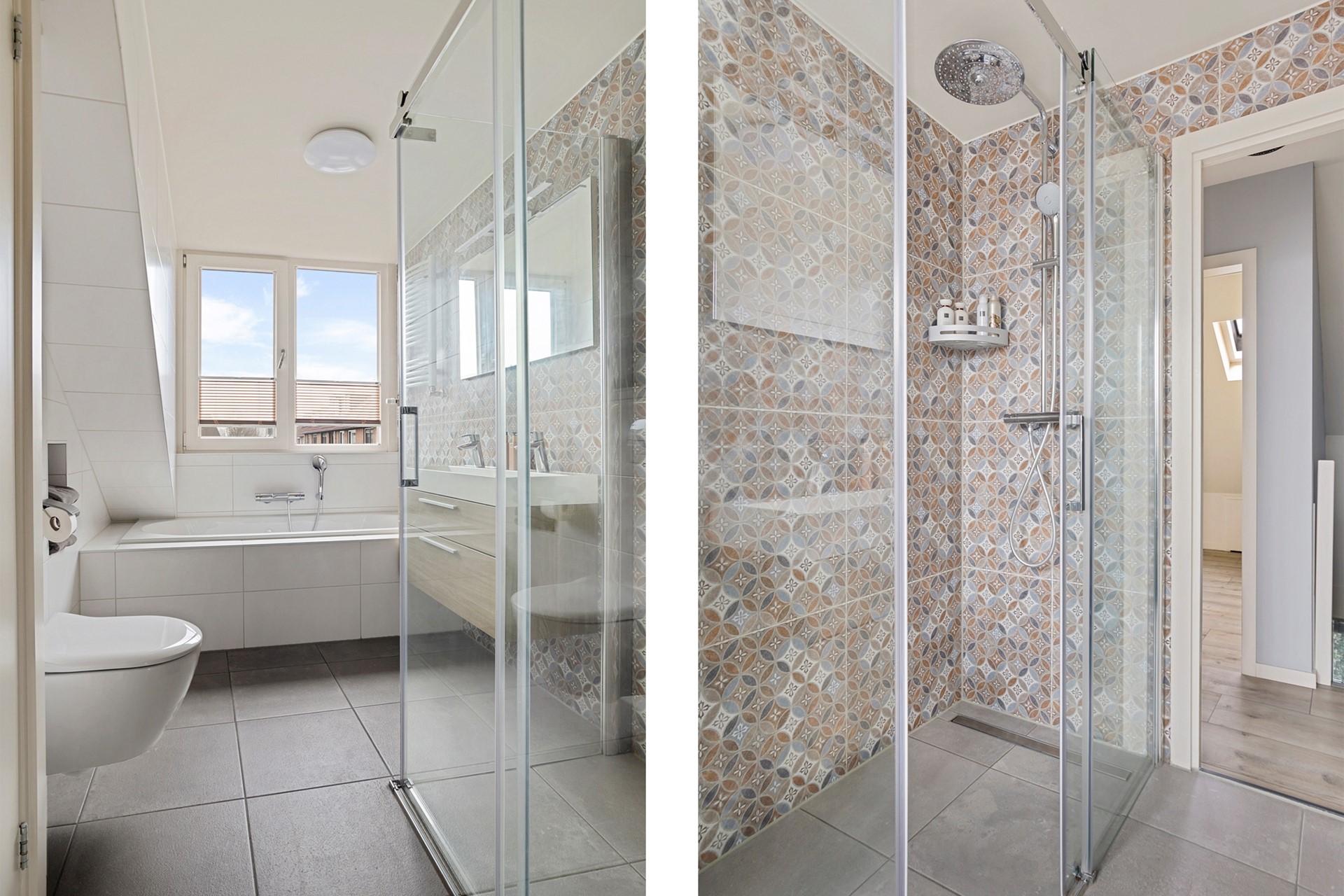 Ook vind je hier de stijlvolle badkamer, die eveneens is voorzien van vloerverwarming. De badkamer beschikt over een toilet, ligbad, dubbele wastafel met meubel en een ruime inloopdouche. Tevens bevindt zich hier de opstelplaats van de CV-ketel.