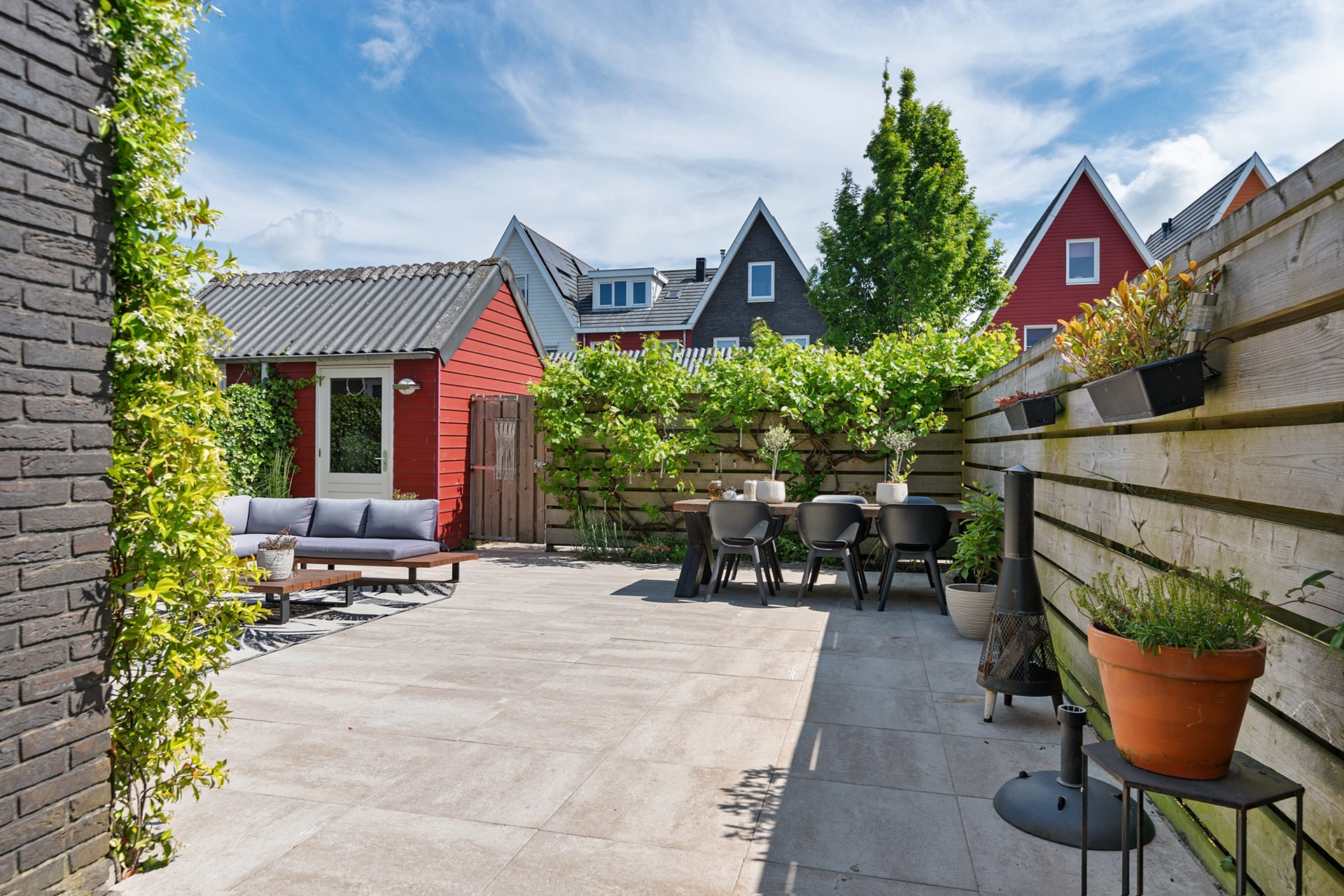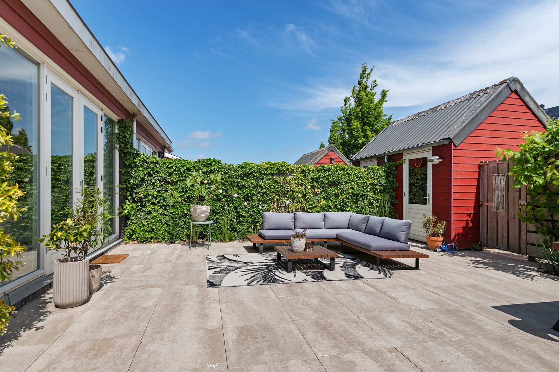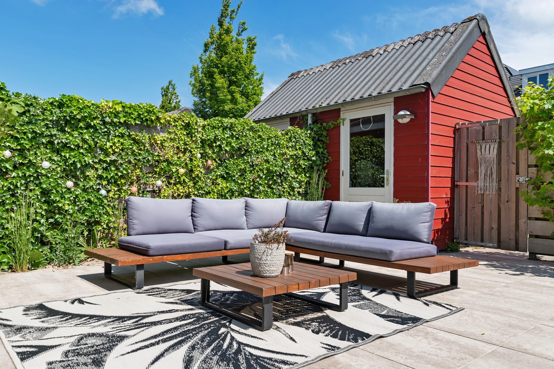 De zonnige en onderhoudsvriendelijke achtertuin is een verlengstuk van je woonkamer. Hier geniet je van lange zomeravonden met vrienden of gewoon in alle rust. De berging is voorzien van elektra en biedt plek voor je fietsen en tuinspullen.