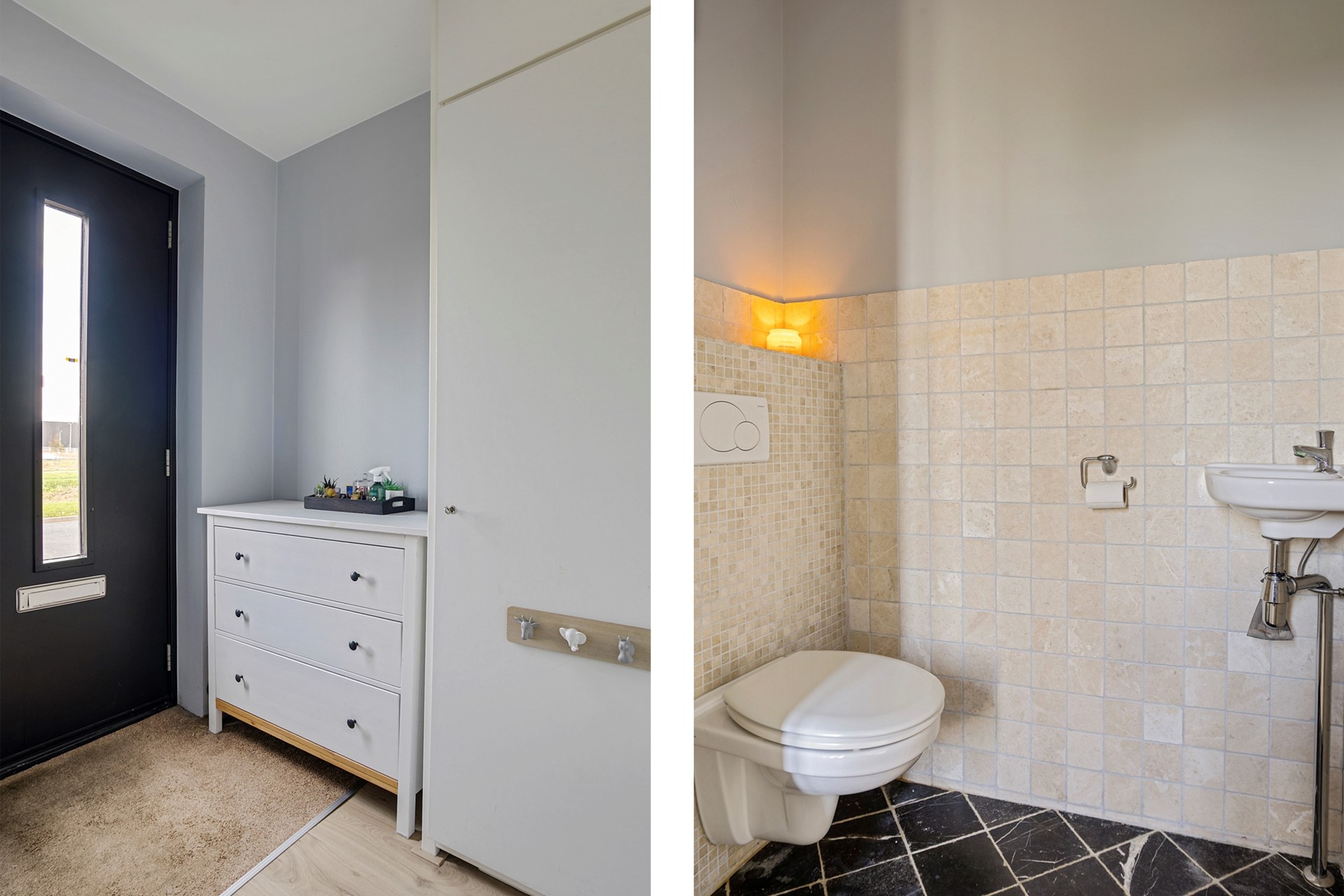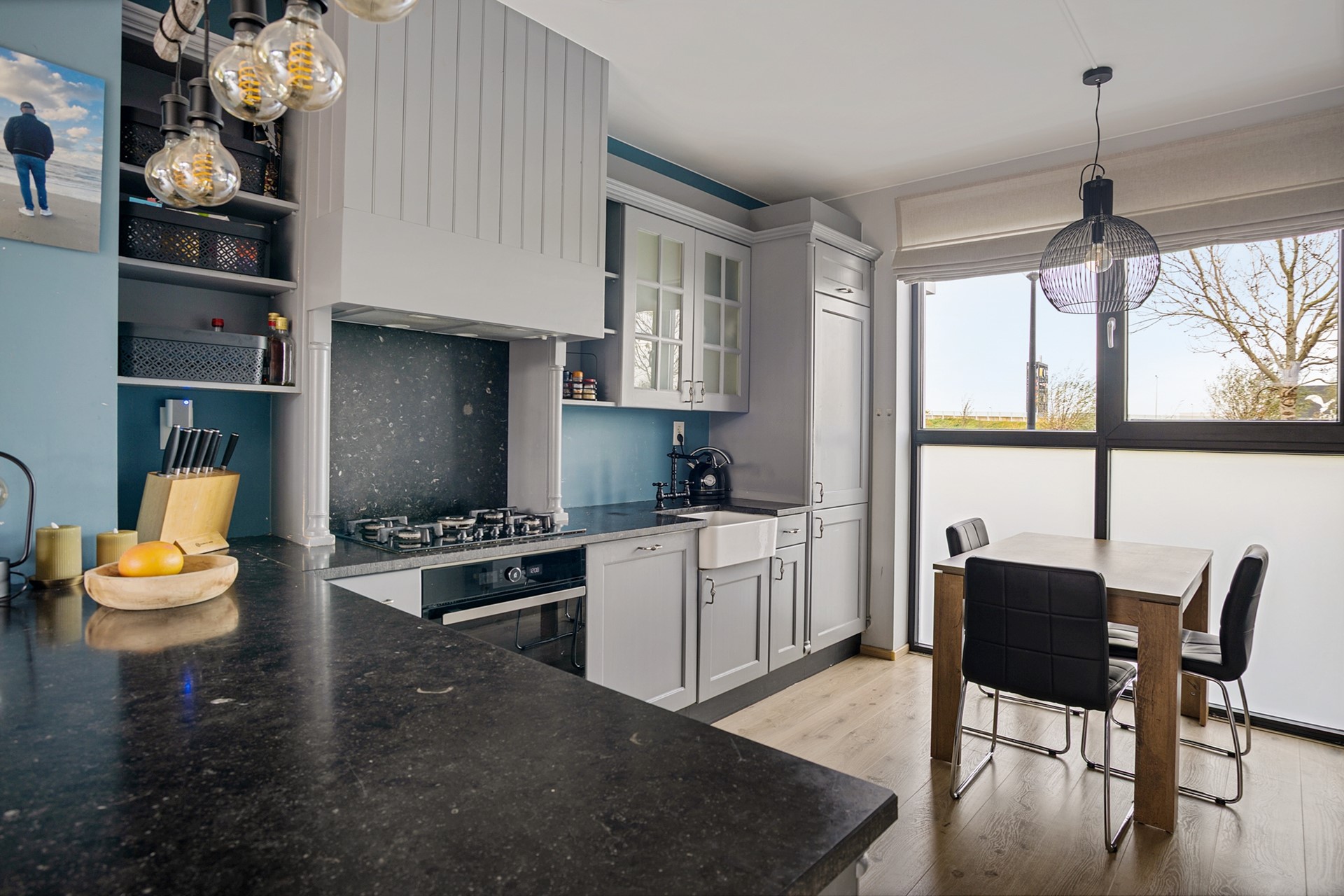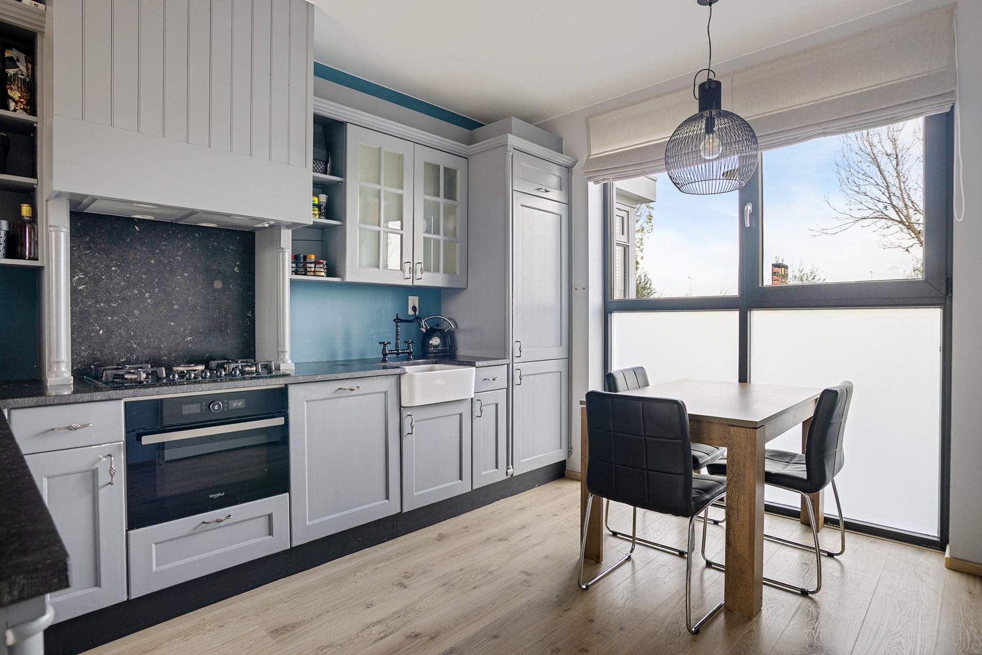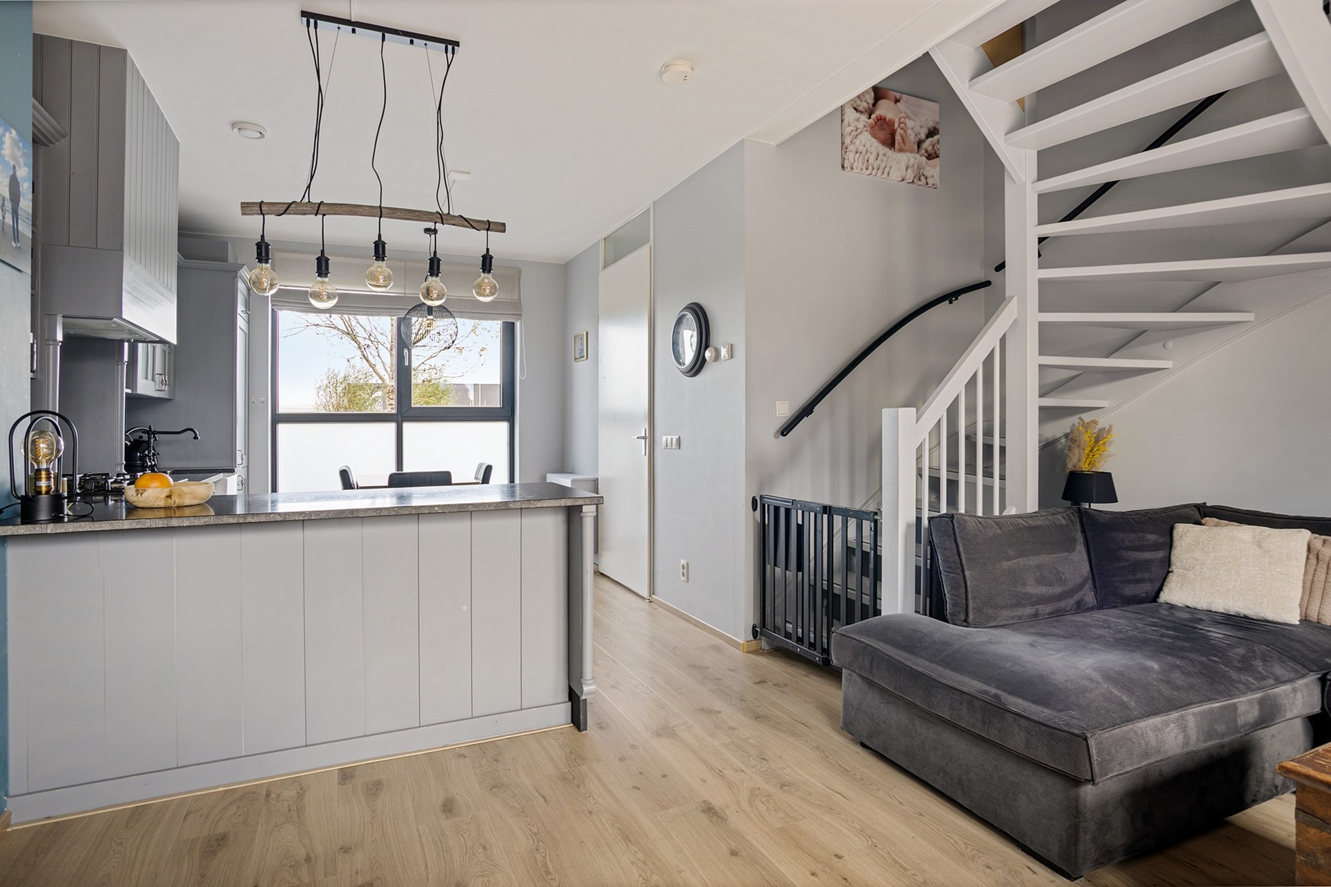 Via de entree kom je binnen in de hal met toilet (wandcloset en fontein). Vervolgens stap je de royale leefkeuken in, waar het vrije uitzicht direct de aandacht trekt. De keuken is ruim opgezet, beschikt over veel kastruimte en biedt voldoende plek voor een gezellige eethoek.