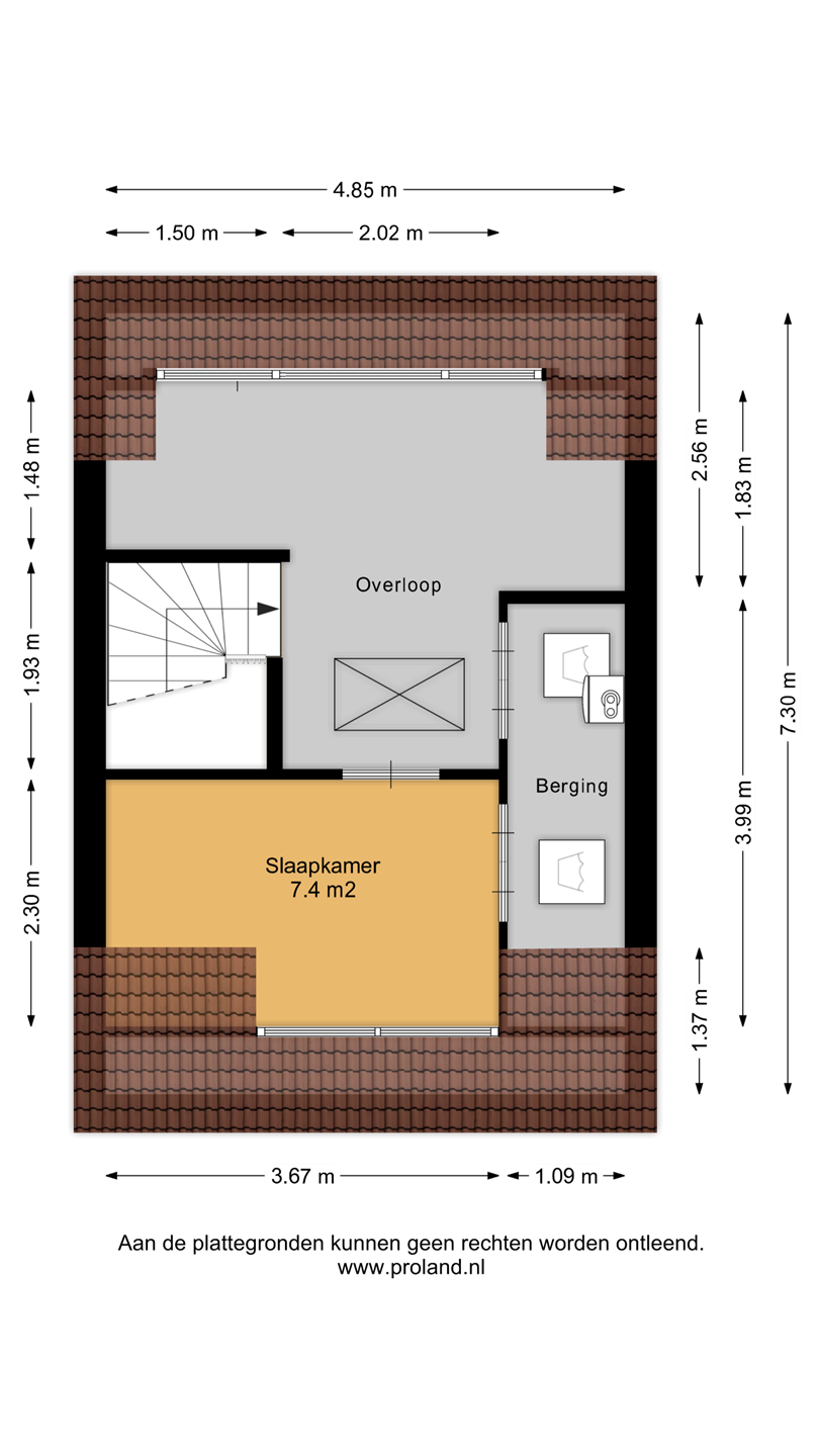 De tweede verdieping is dankzij twee dakkapellen een volwaardige woonlaag. Aan de voorzijde bevindt zich een fijne slaapkamer, terwijl aan de achterzijde een ideale kantoorruimte is gerealiseerd. Tussen deze kamers vind je de opstelplaats voor de CV-installatie en de aansluitingen voor wasmachine en droger.