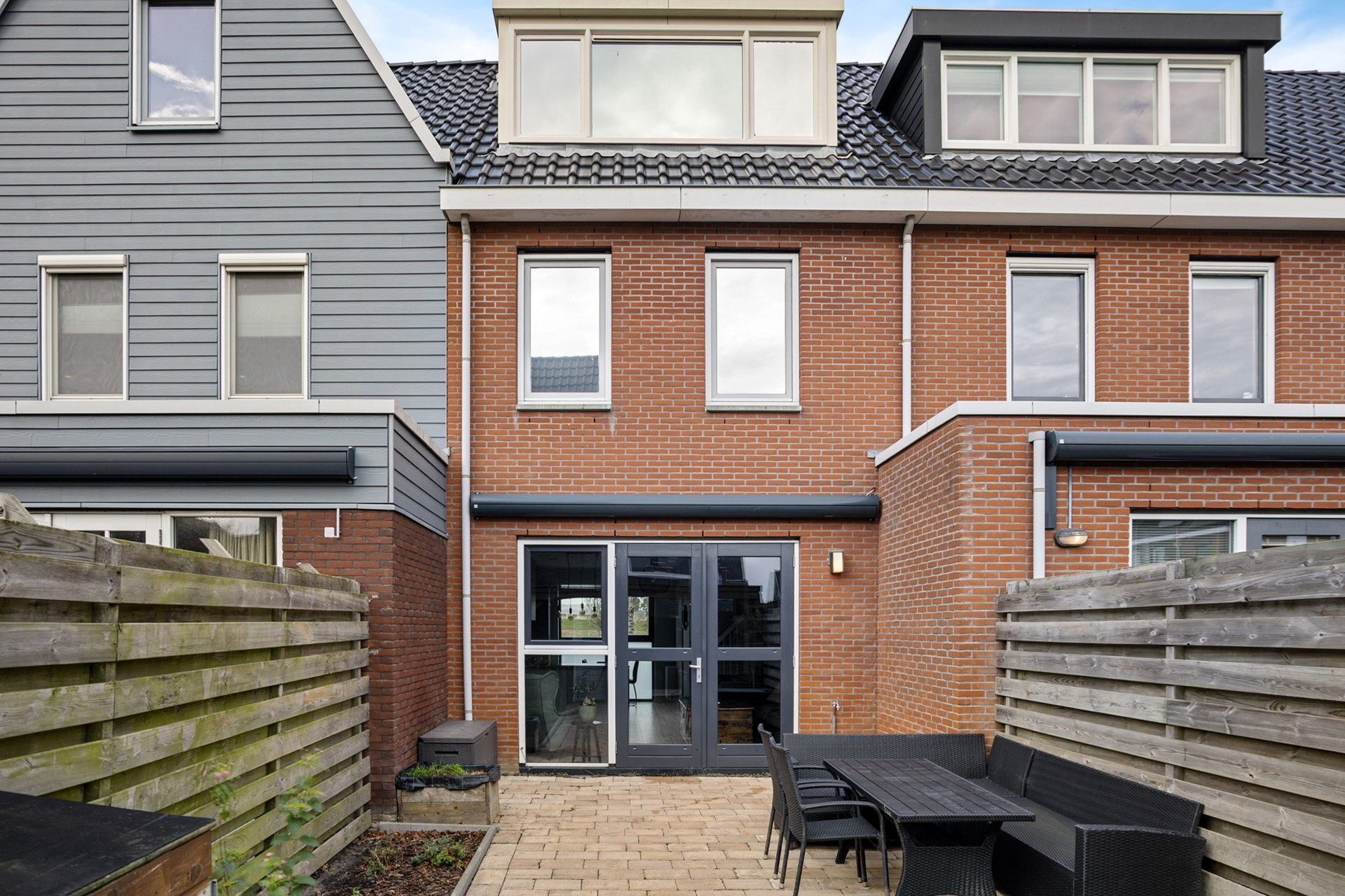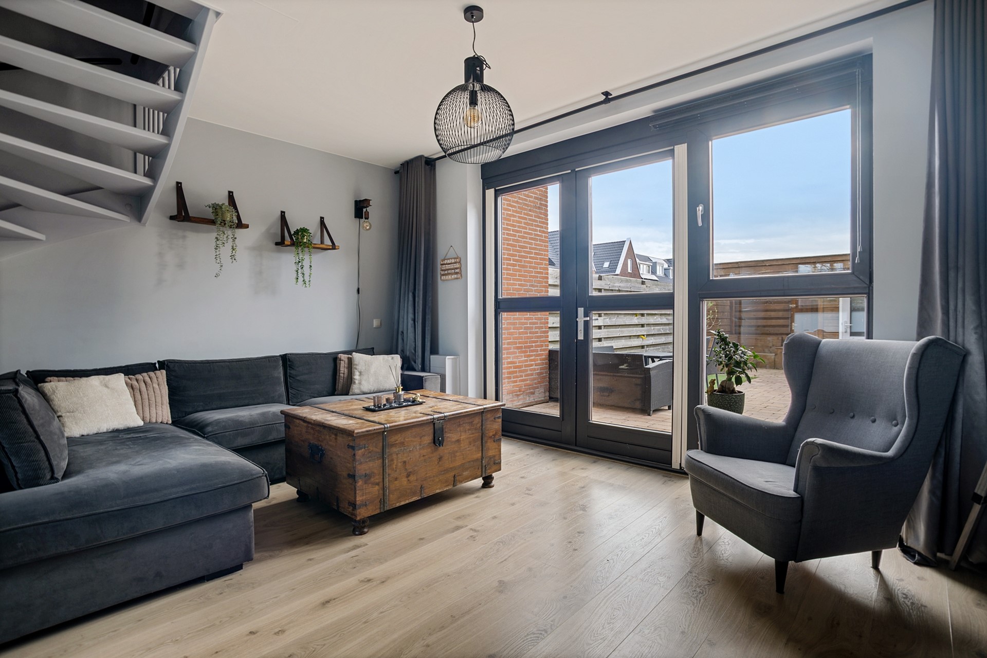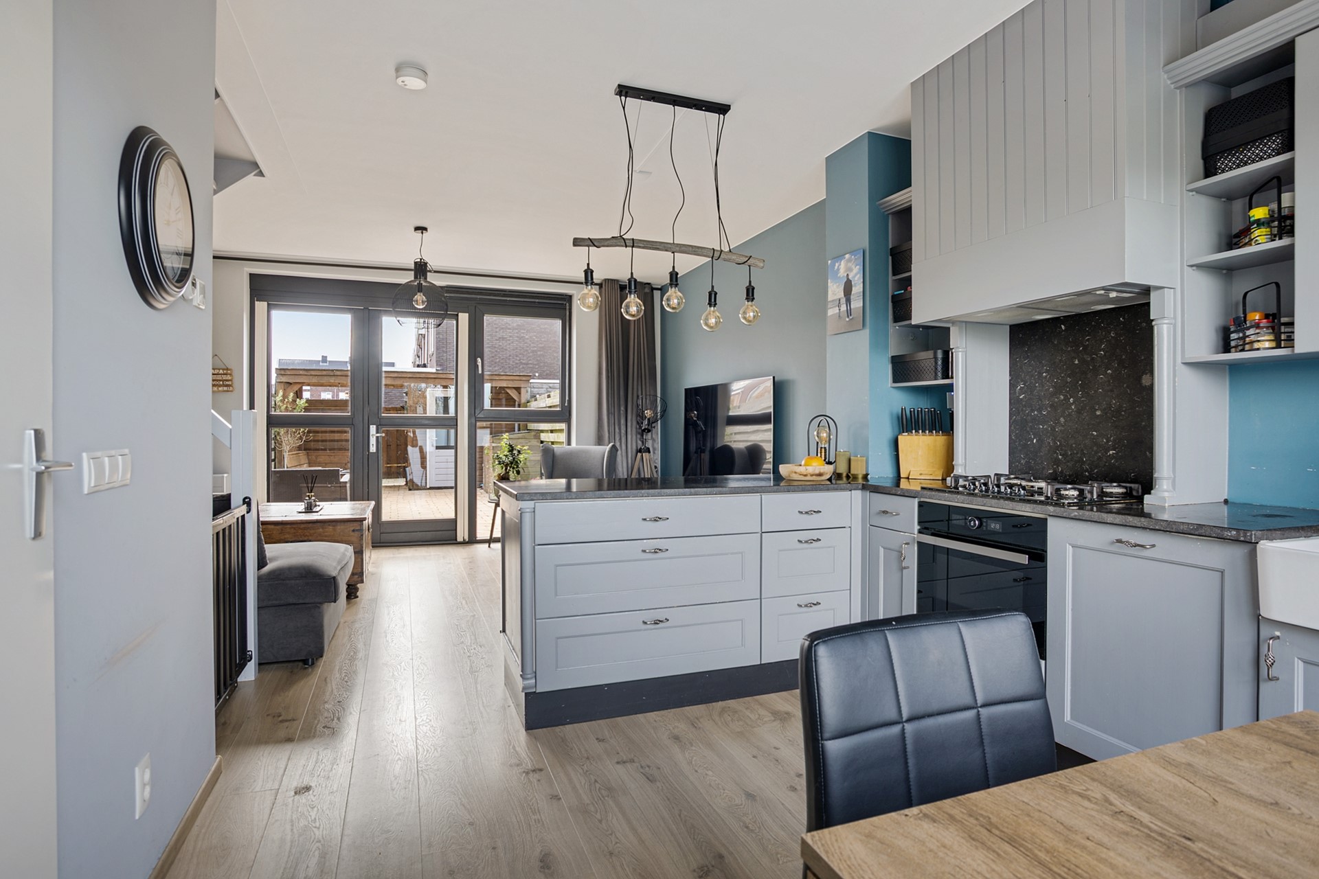 Aan de achterzijde bevindt zich de tuingerichte woonkamer met dubbele openslaande deuren naar de zonnige zuidtuin. Hierdoor vormt binnen naadloos één geheel met buiten, ideaal voor lange avonden en gezellige momenten.