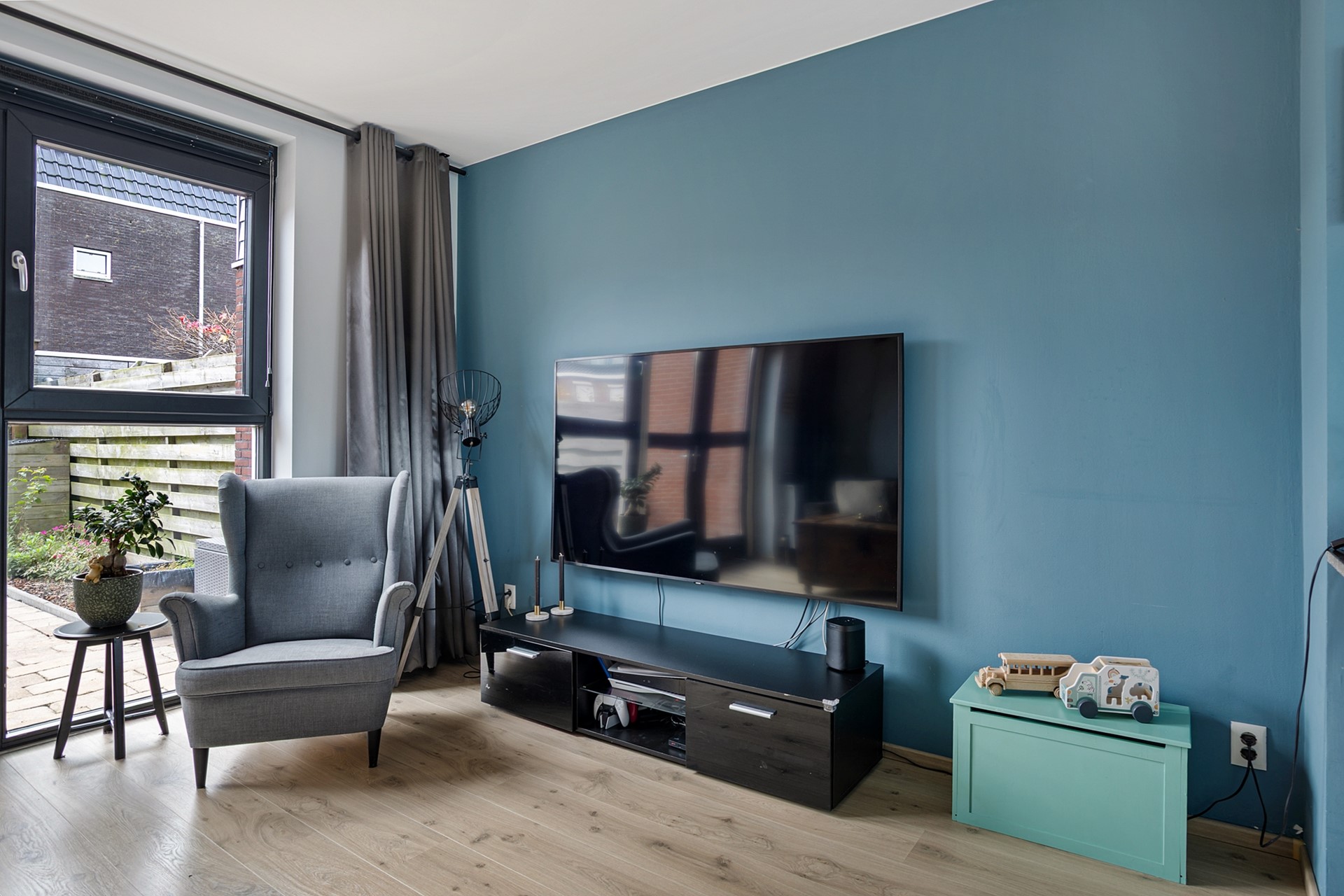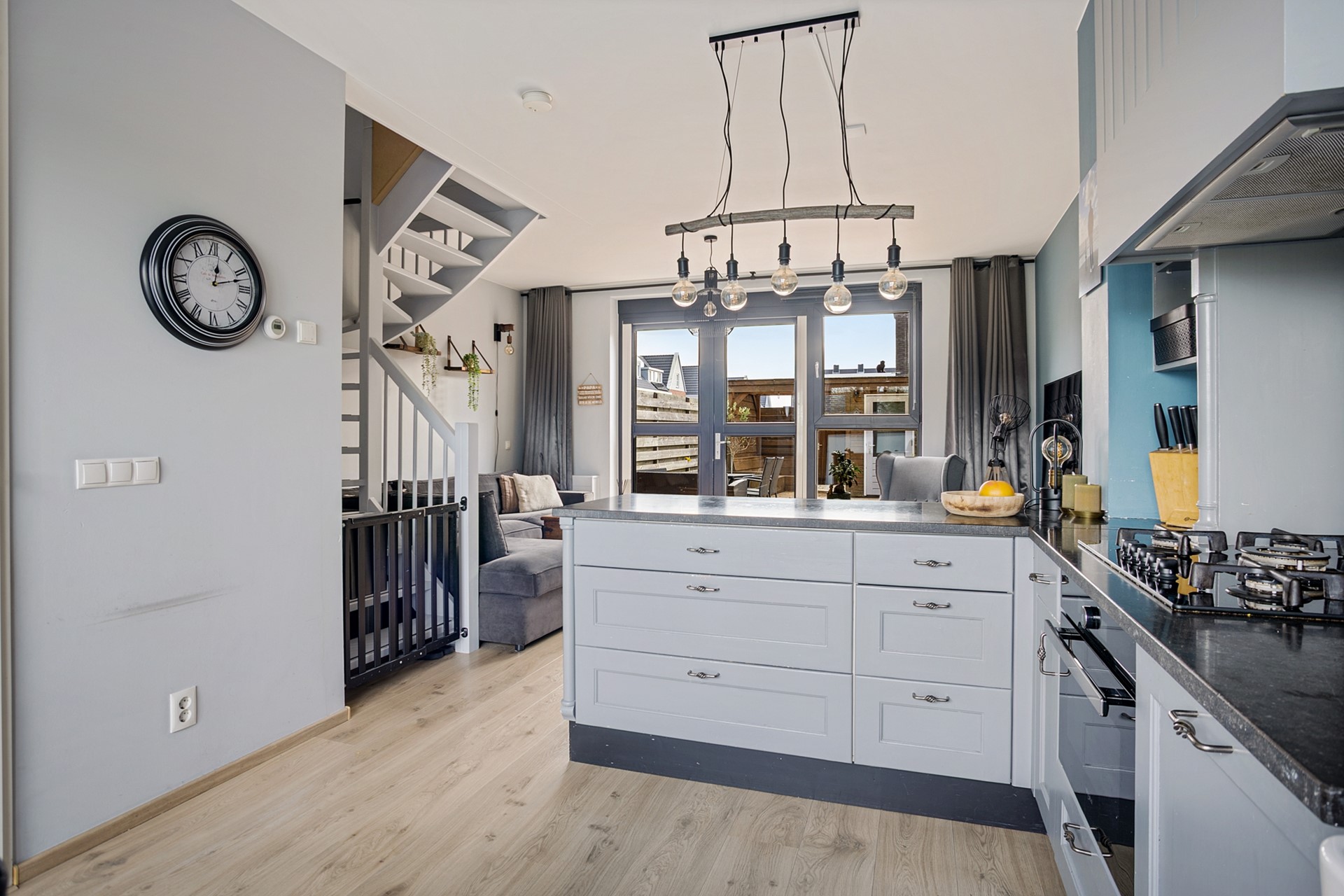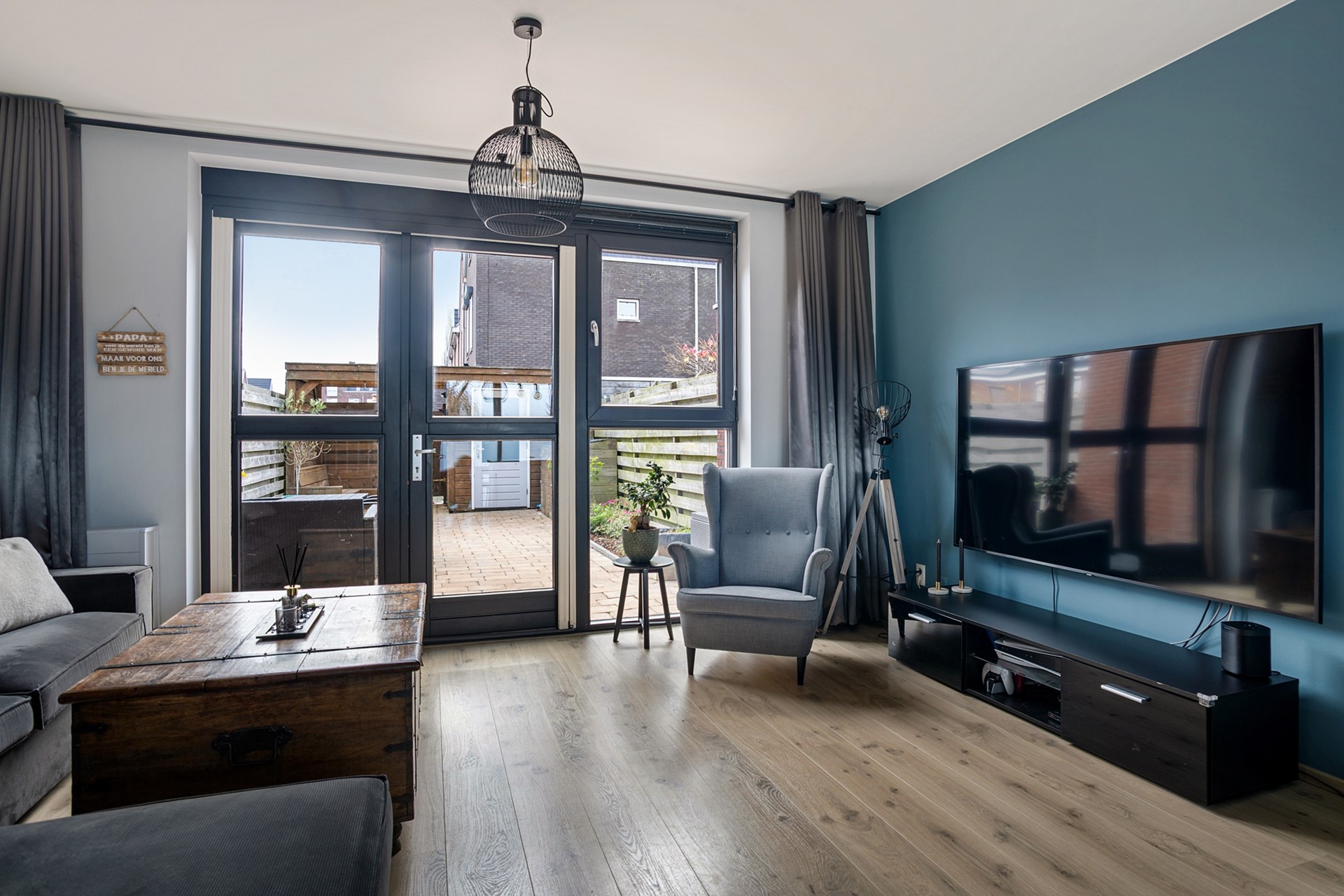 Aan de achterzijde bevindt zich de tuingerichte woonkamer met dubbele openslaande deuren naar de zonnige zuidtuin. Hierdoor vormt binnen naadloos één geheel met buiten, ideaal voor lange avonden en gezellige momenten.