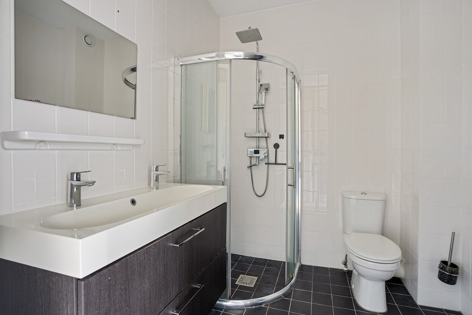 Via de vaste trap bereik je de eerste verdieping. Hier vind je twee goed bemeten slaapkamers, één aan de voorzijde en één aan de achterzijde. Tussen deze kamers ligt de complete badkamer, voorzien van een douchehoek, tweede toilet én een dubbele wastafel met meubel.