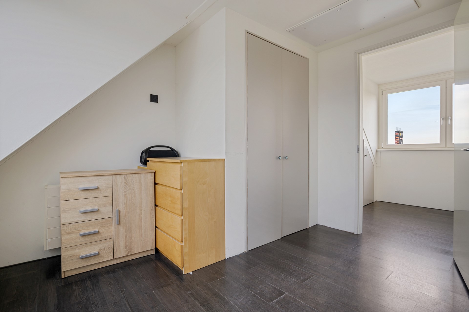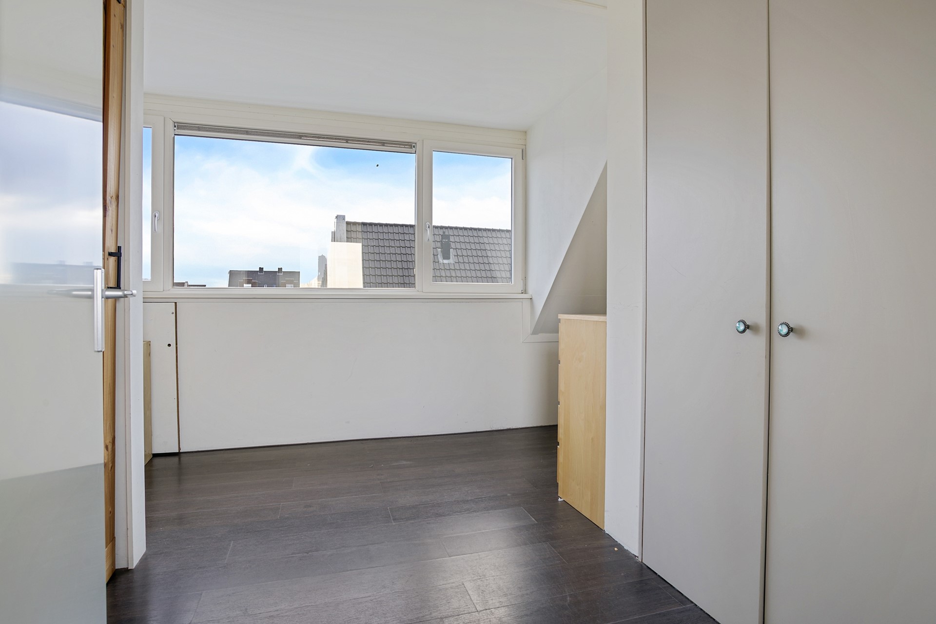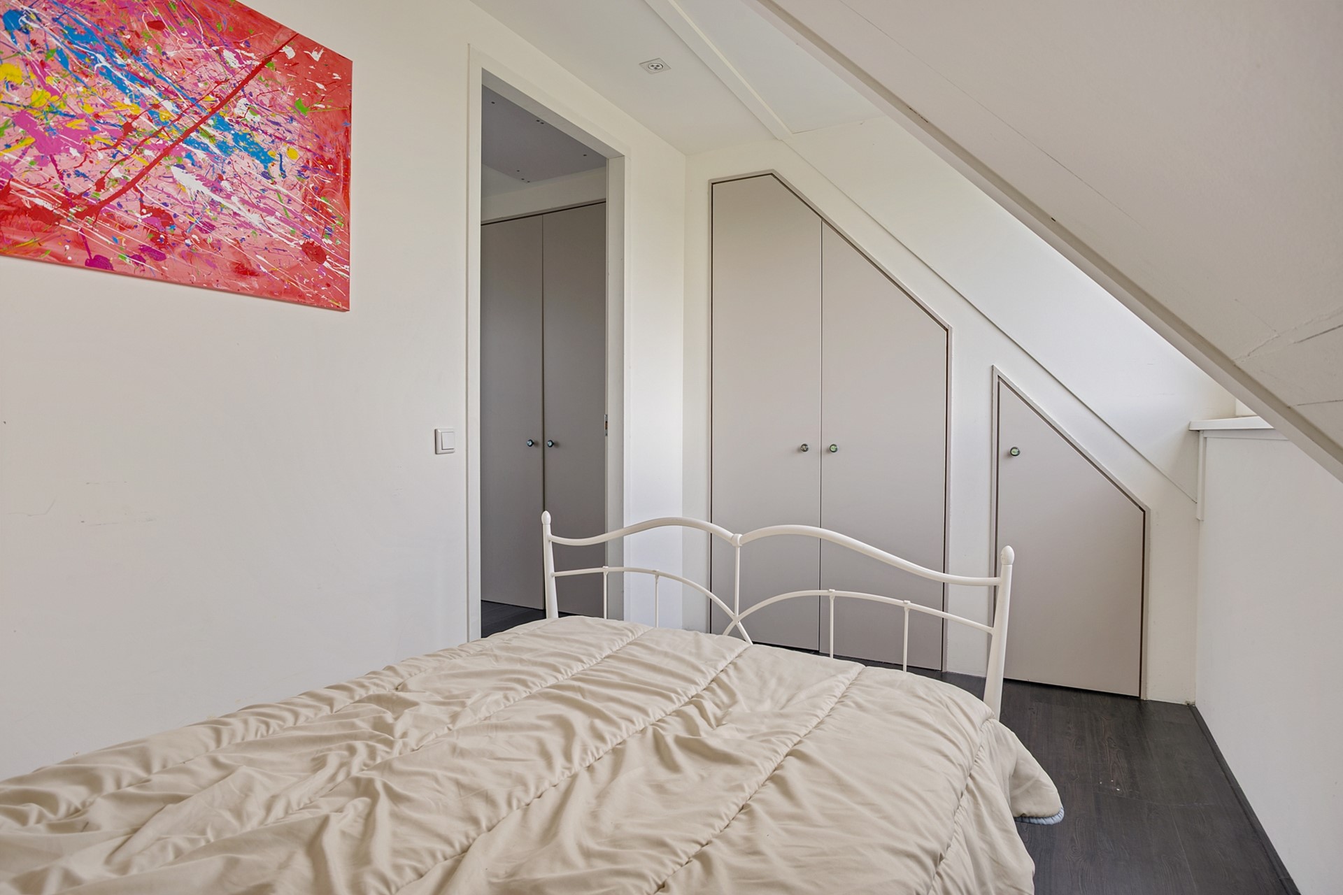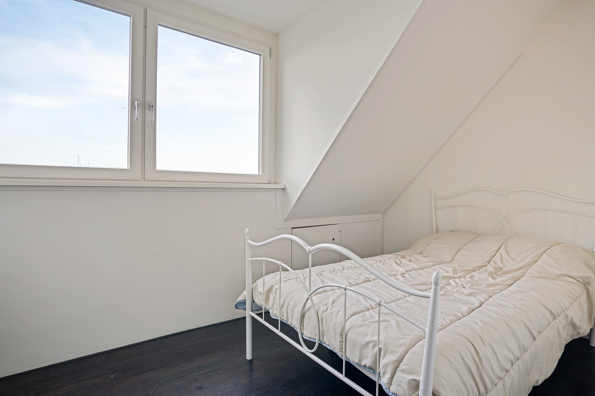 Middels een vlizotrap bereik je de ruime zolder. De nokhoogte biedt onverwacht veel praktische bergruimte — altijd handig voor seizoensspullen en koffers.
