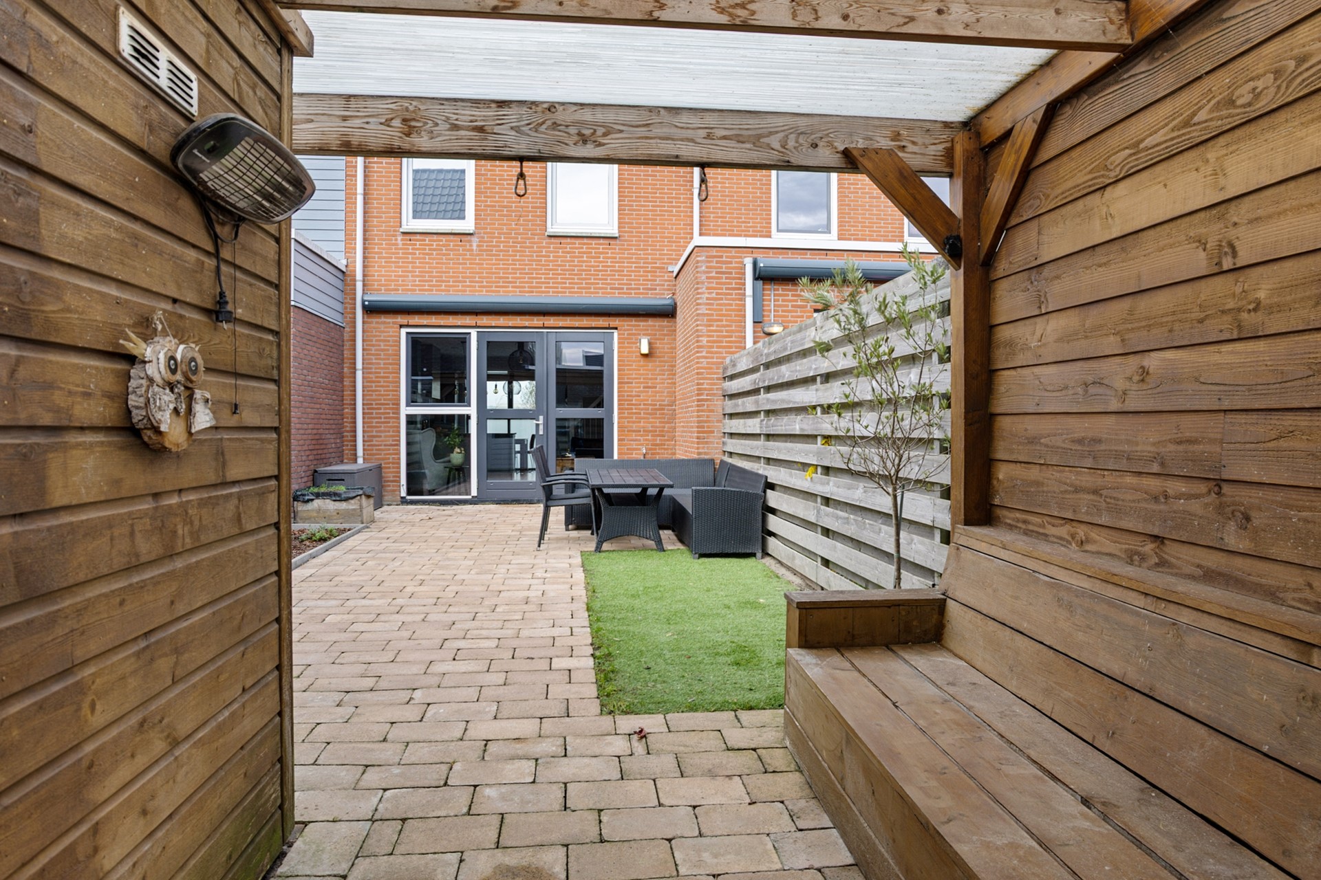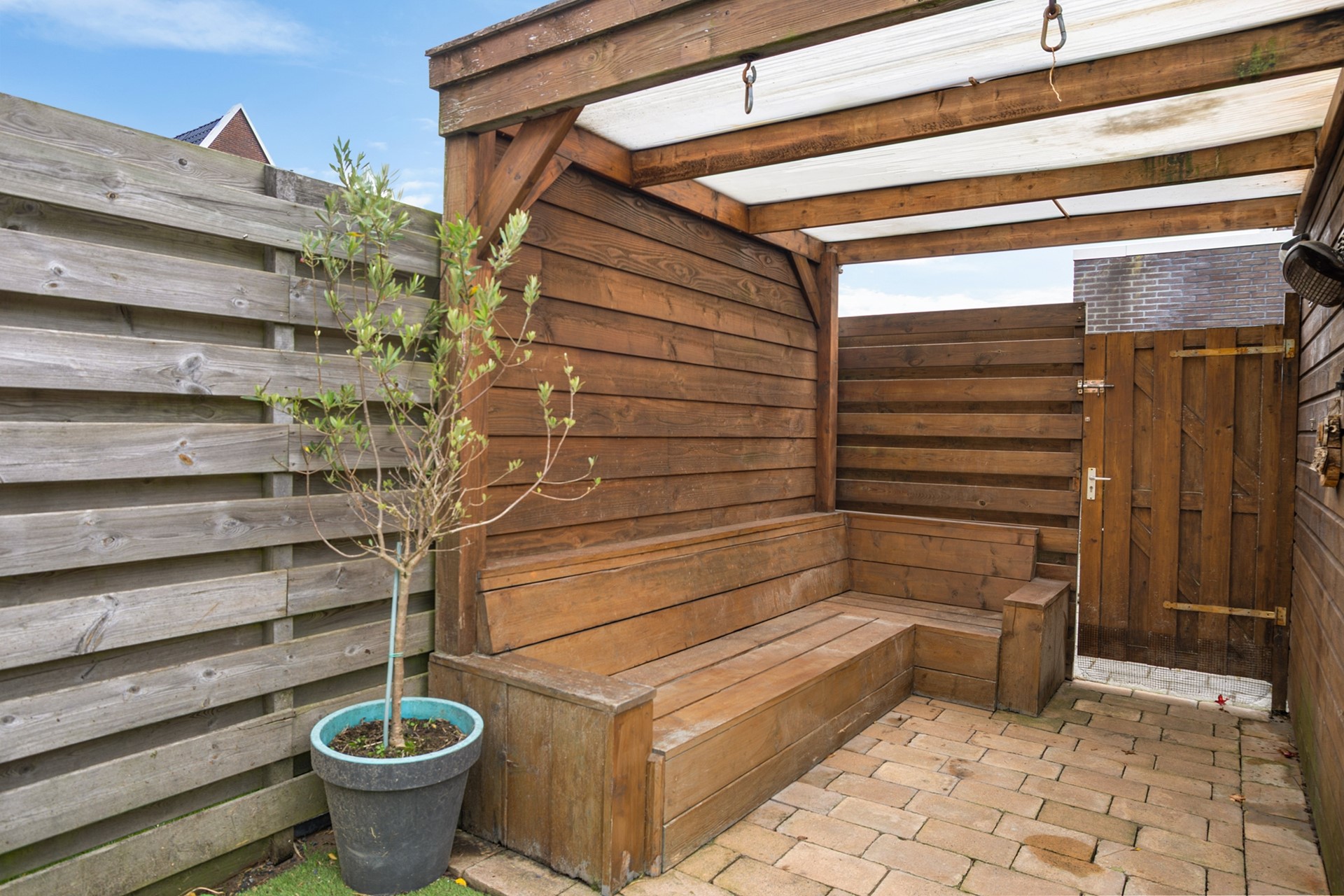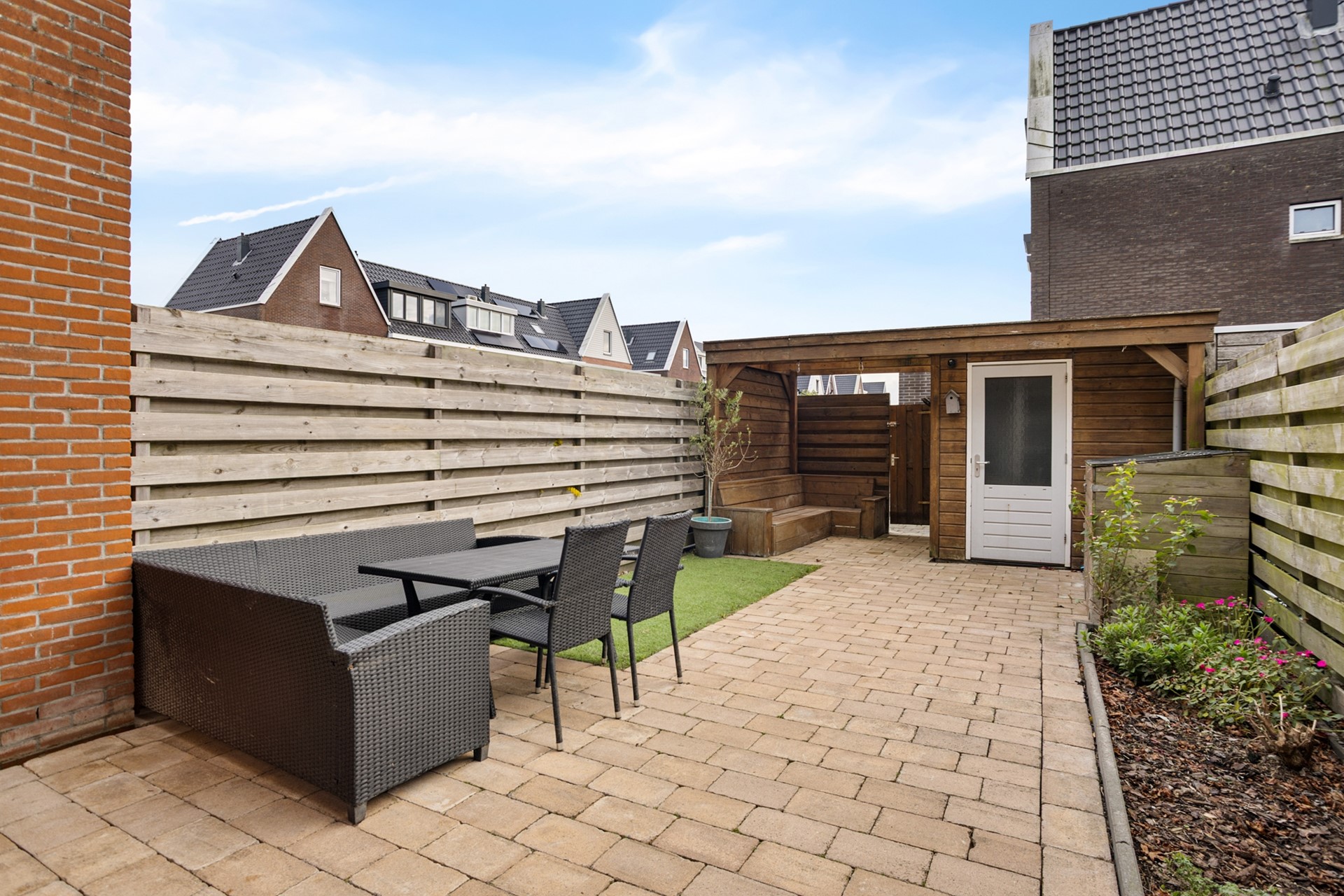 De achtertuin is volledig bestraat, onderhoudsvriendelijk en optimaal gelegen op het zuiden. Achterin staat een berging met elektra en via de achterom loop je zo de achtergelegen steeg in. Een ideale buitenruimte voor mensen die gemak en privacy waarderen.